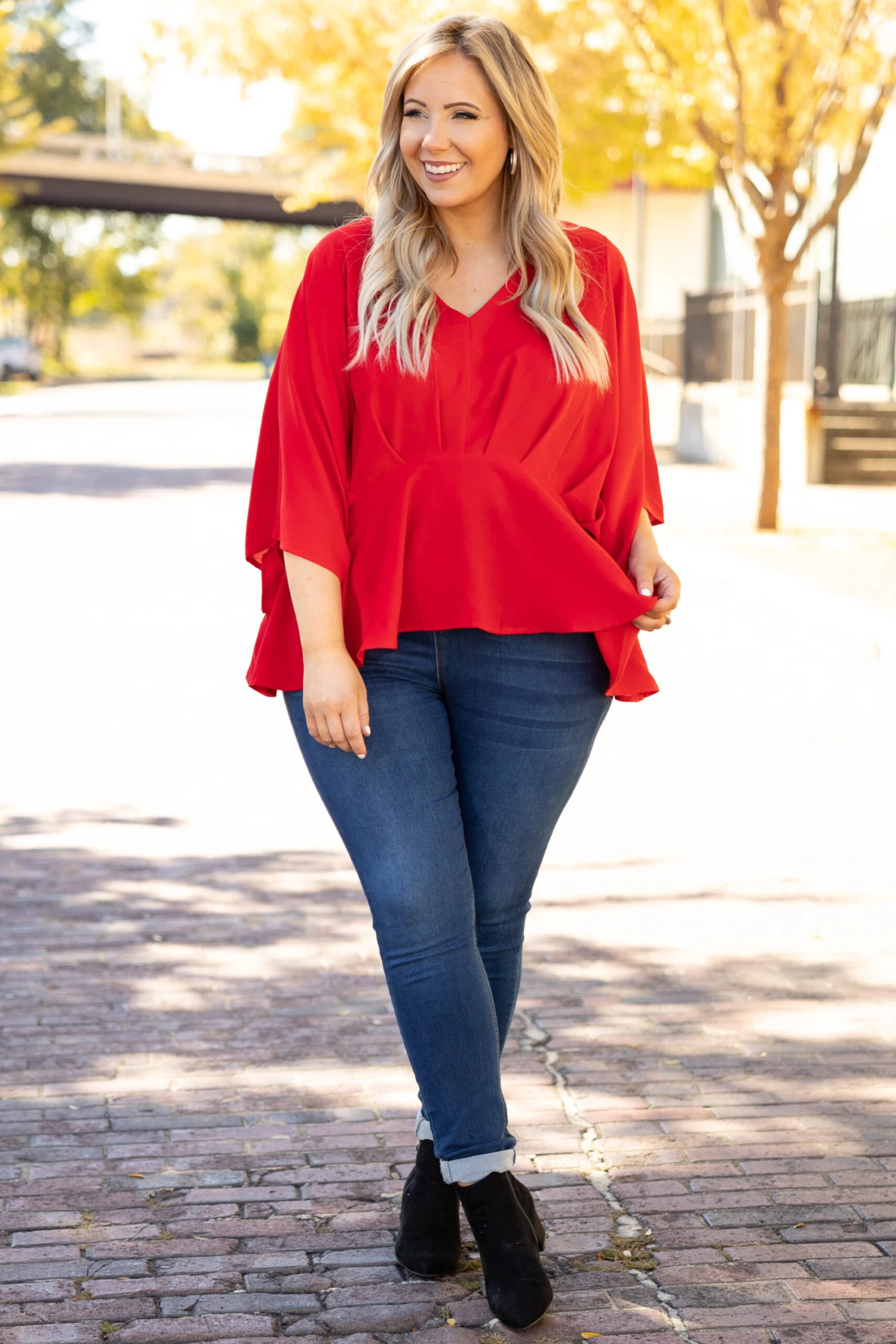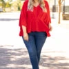You are gonna look so cool and chic in this top! It has a flowy yet figure flattering fit and features the cutest batwing sleeves! Style this red top with skinnies and heels for an easy everyday outfit!