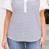 Get ready to glow with this top! Featuring elastic bubble sleeves and a striped navy bodice, this top also has functional buttons and a split v-neckline! Shine in style with this off-white top!