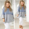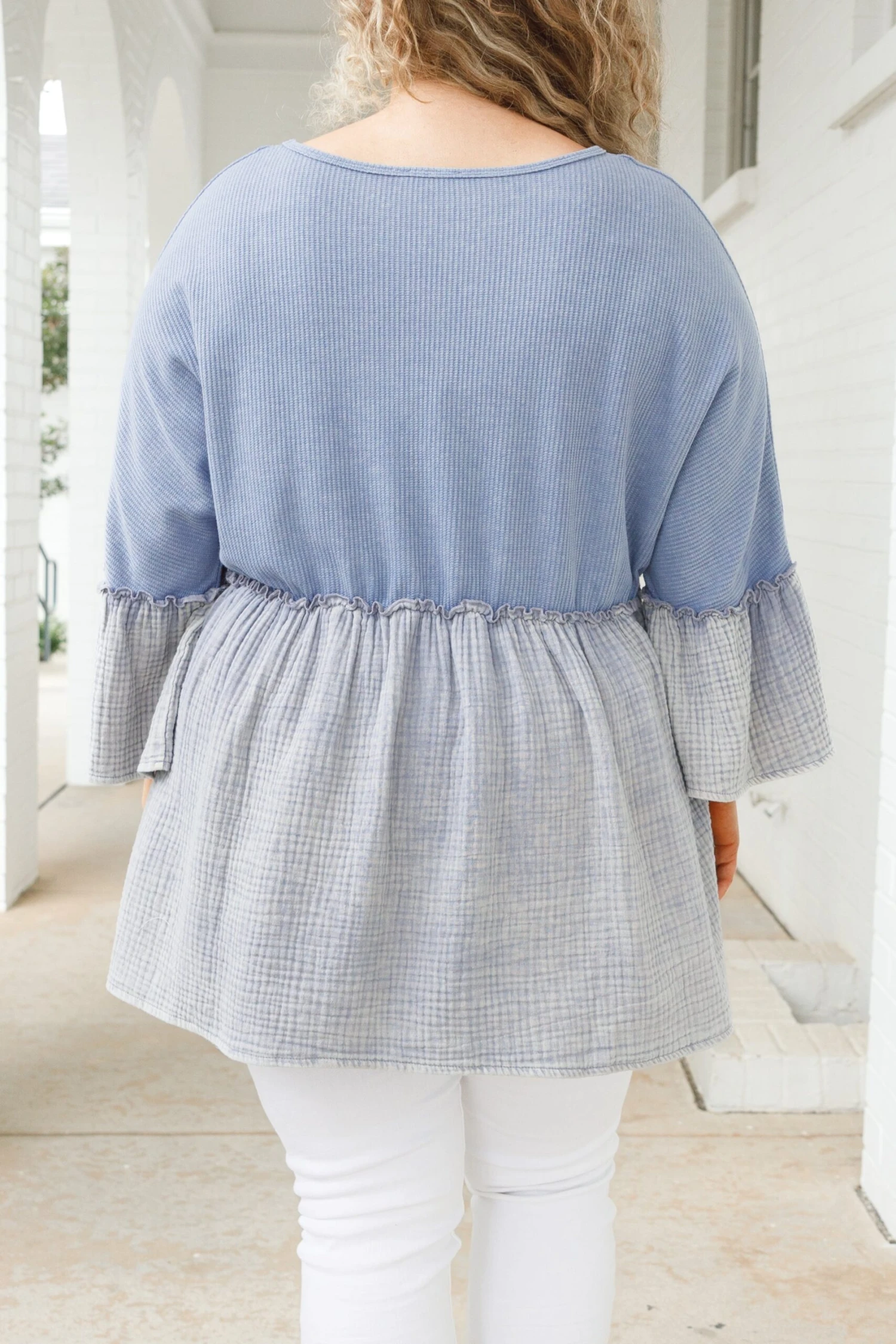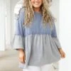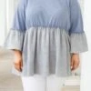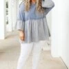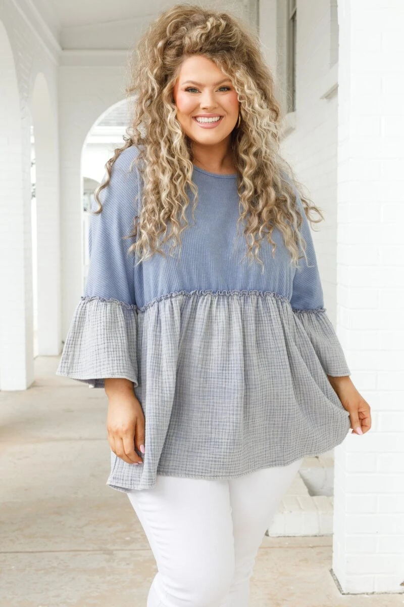 Look no farther than this FAB top to add a feminine touch to your wardrobe! The babydoll silhouette, textured fabric, and bell sleeve style combine to create a beautiful design in a charming pacific blue-grey color! A timeless addition to any wardrobe!