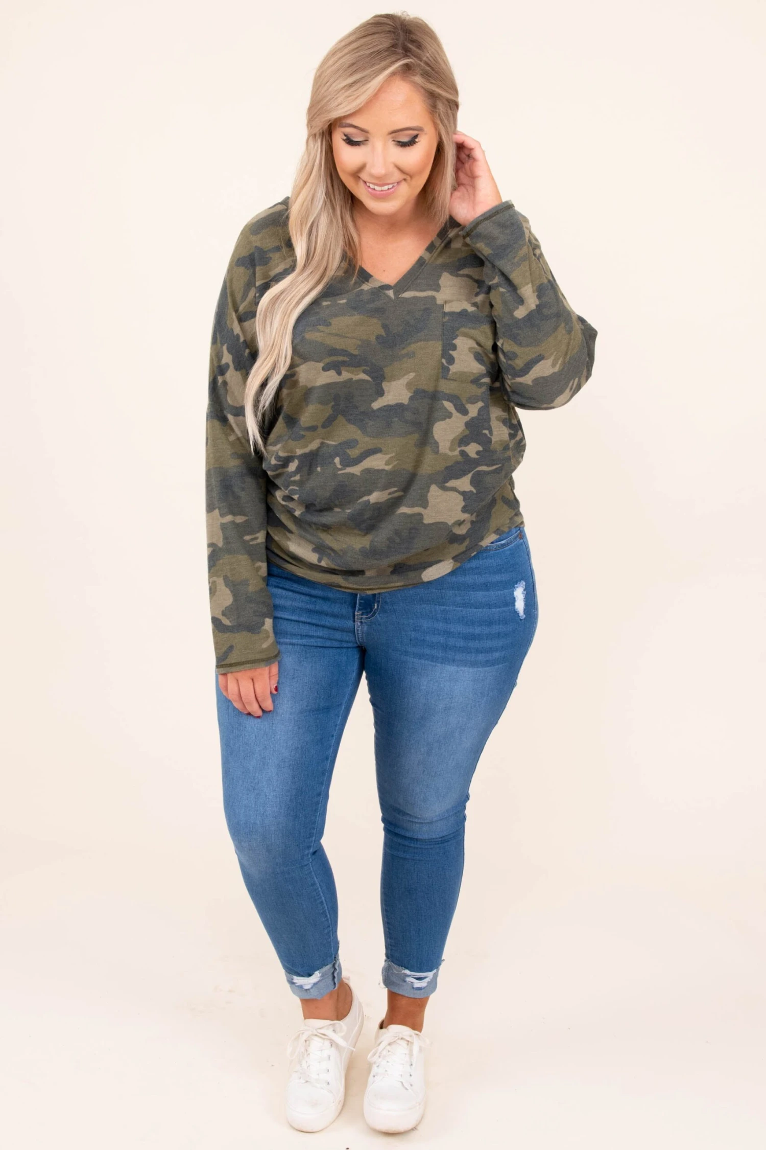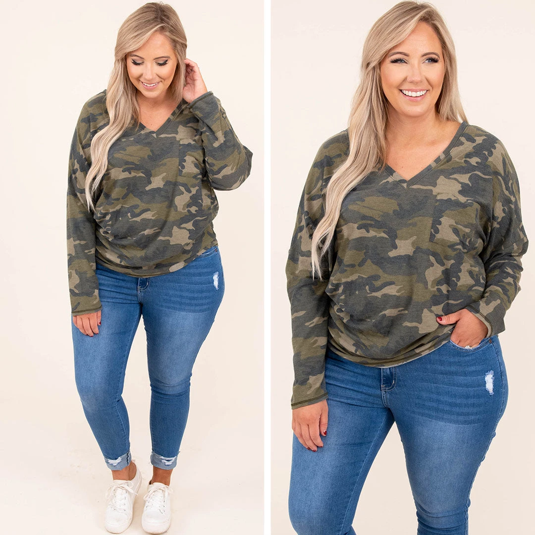 Everyone will be taking a second glance at you in this top! It features a trendy camo print that is perfect for the season! This top is comfortable for all-day wear, has the perfect amount of stretch, and perfect for all body types! This top would also look cute paired with your favorite vest or jacket! Pair this top with a pair of distressed skinnies and sneakers for an easy, chic look!