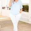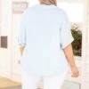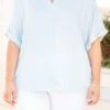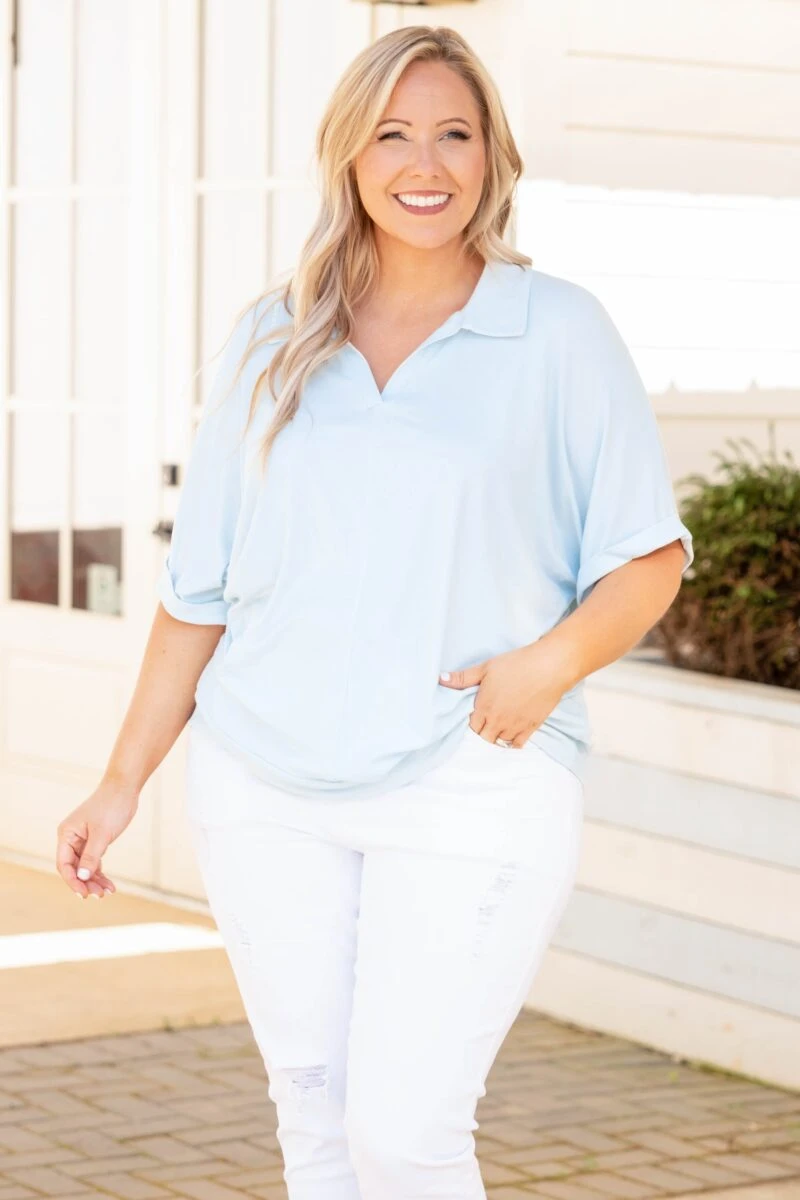 This top has a basic style but there is nothing basic about it! The light blue color is so pretty and the collard neckline is so trendy right now! This cutie has super soft fabric with enough stretch to wear all day long and stay comfortable! Style it with some white jeans and wedges for a super chic look!Â