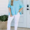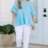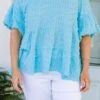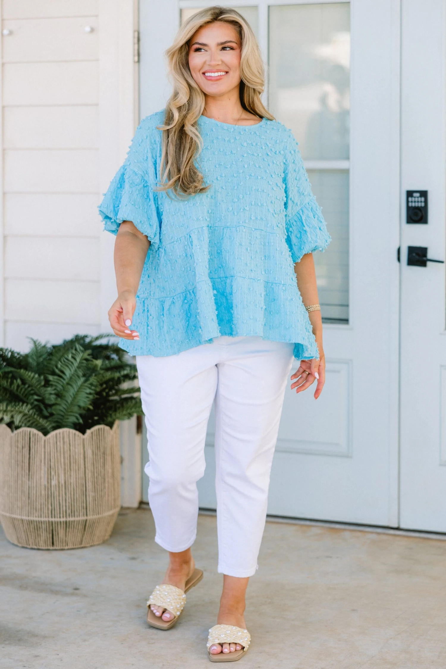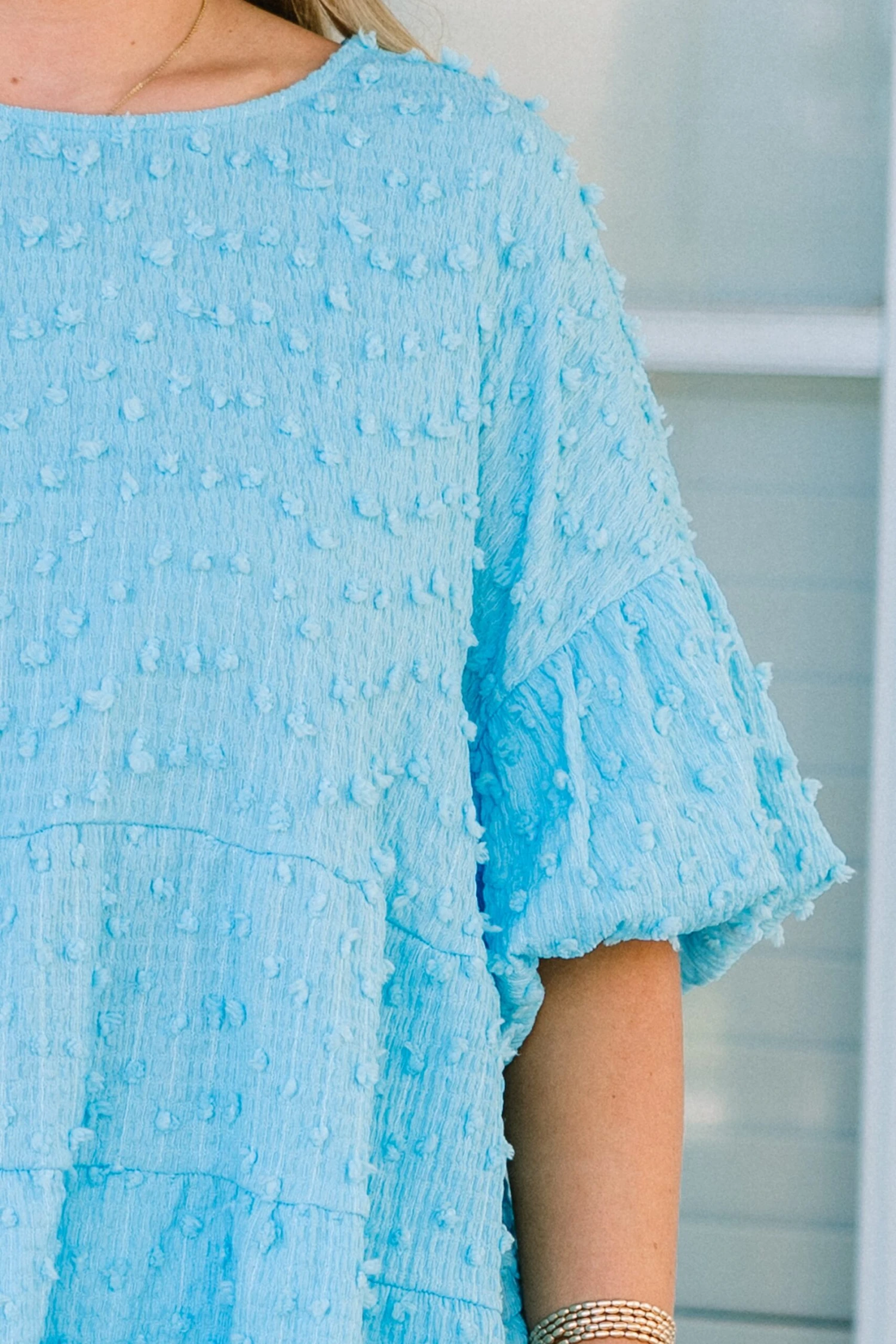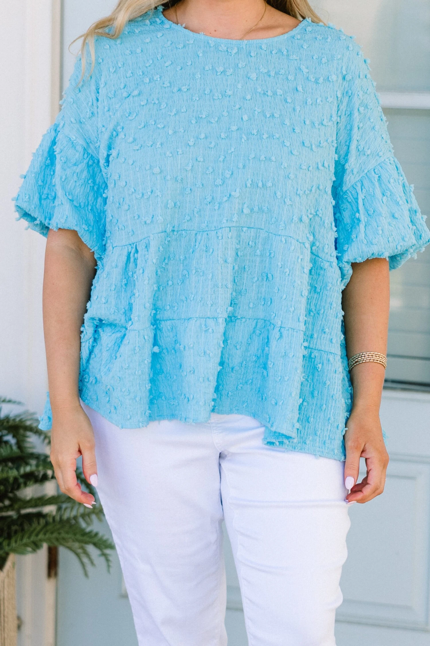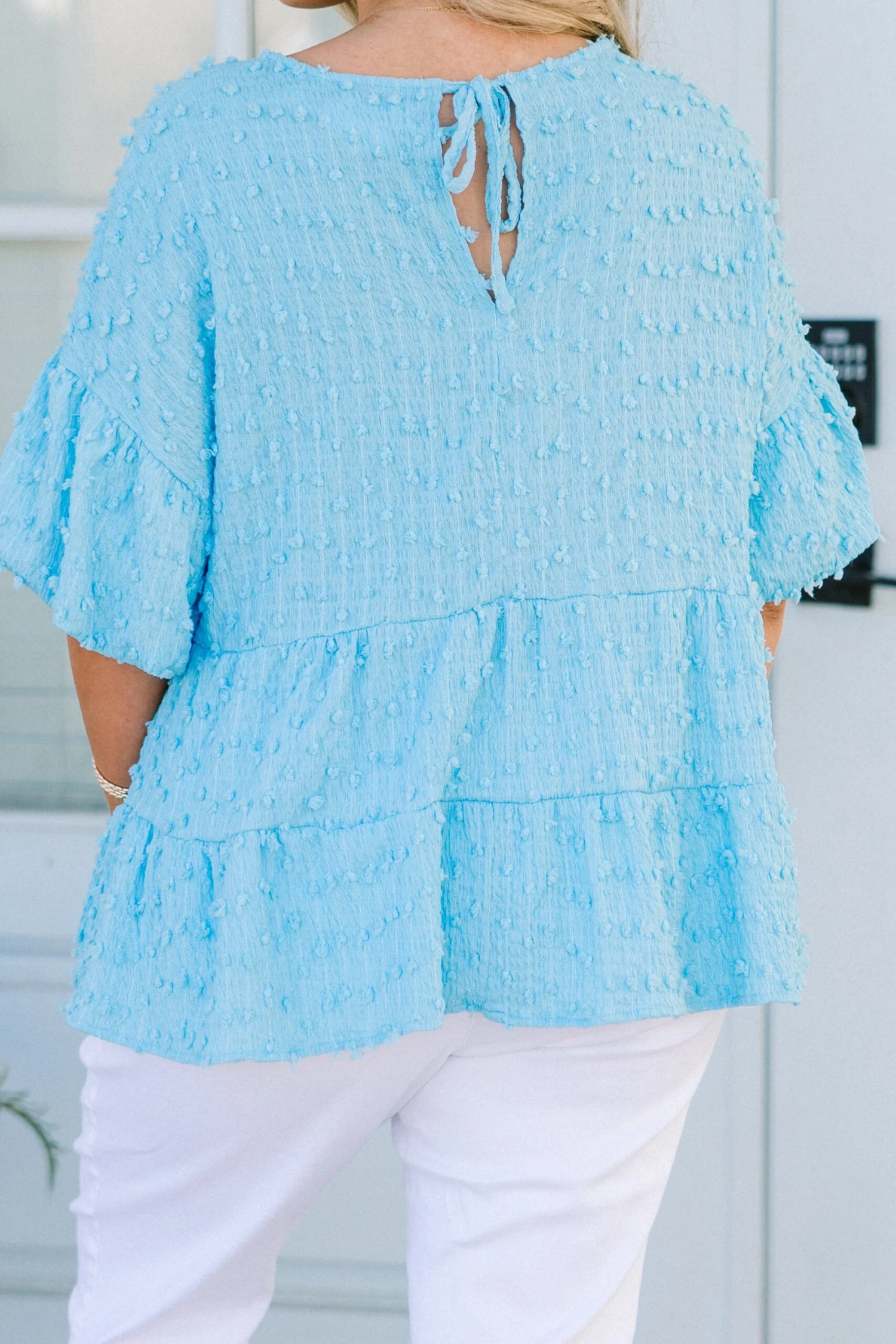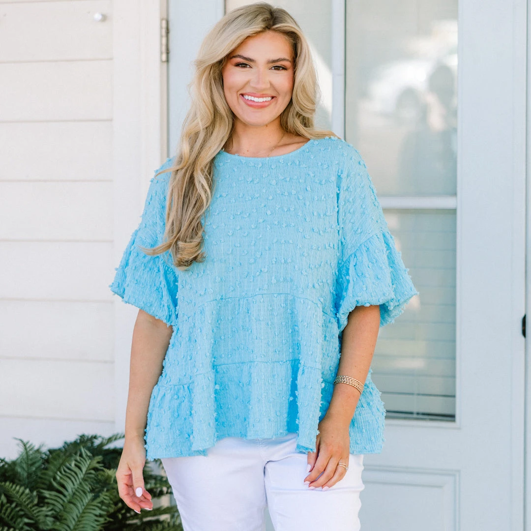 Elevate your style with this lovely top in a classic blue color! The raised polka dot pattern adds a touch of elegance, perfect for a brunch date or a day out on the town! Upgrade your wardrobe and exude confidence with this versatile piece!