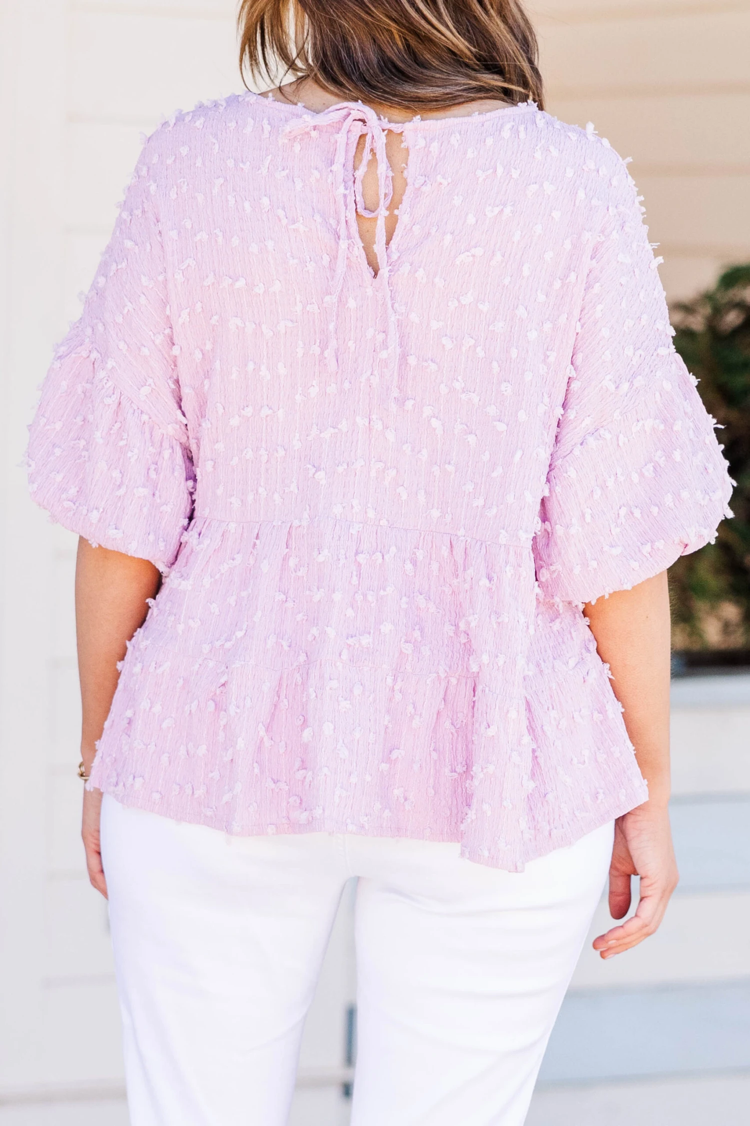 Elevate your style with this lovely top in a beautiful blush color! The raised polka dot pattern adds a touch of elegance, perfect for a brunch date or a day out on the town! Upgrade your wardrobe and exude confidence with this versatile piece!