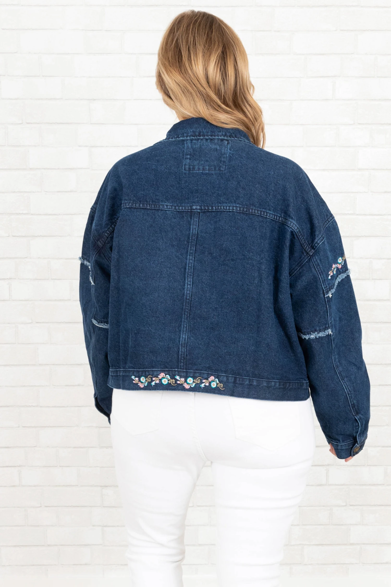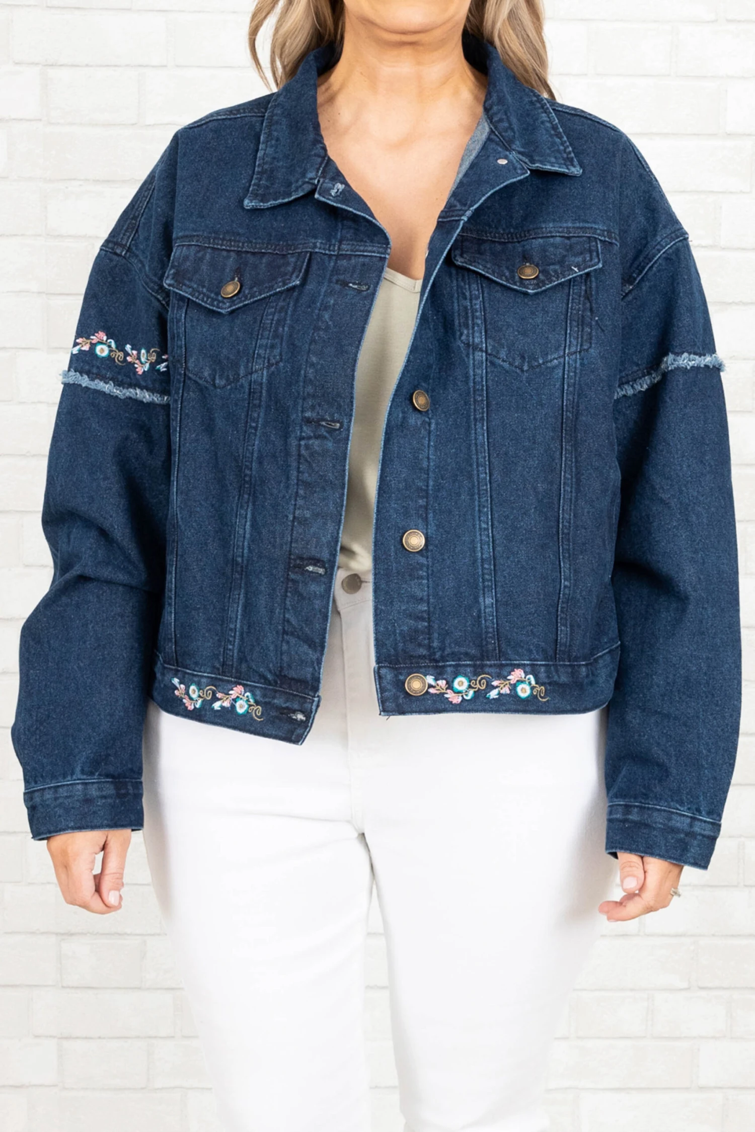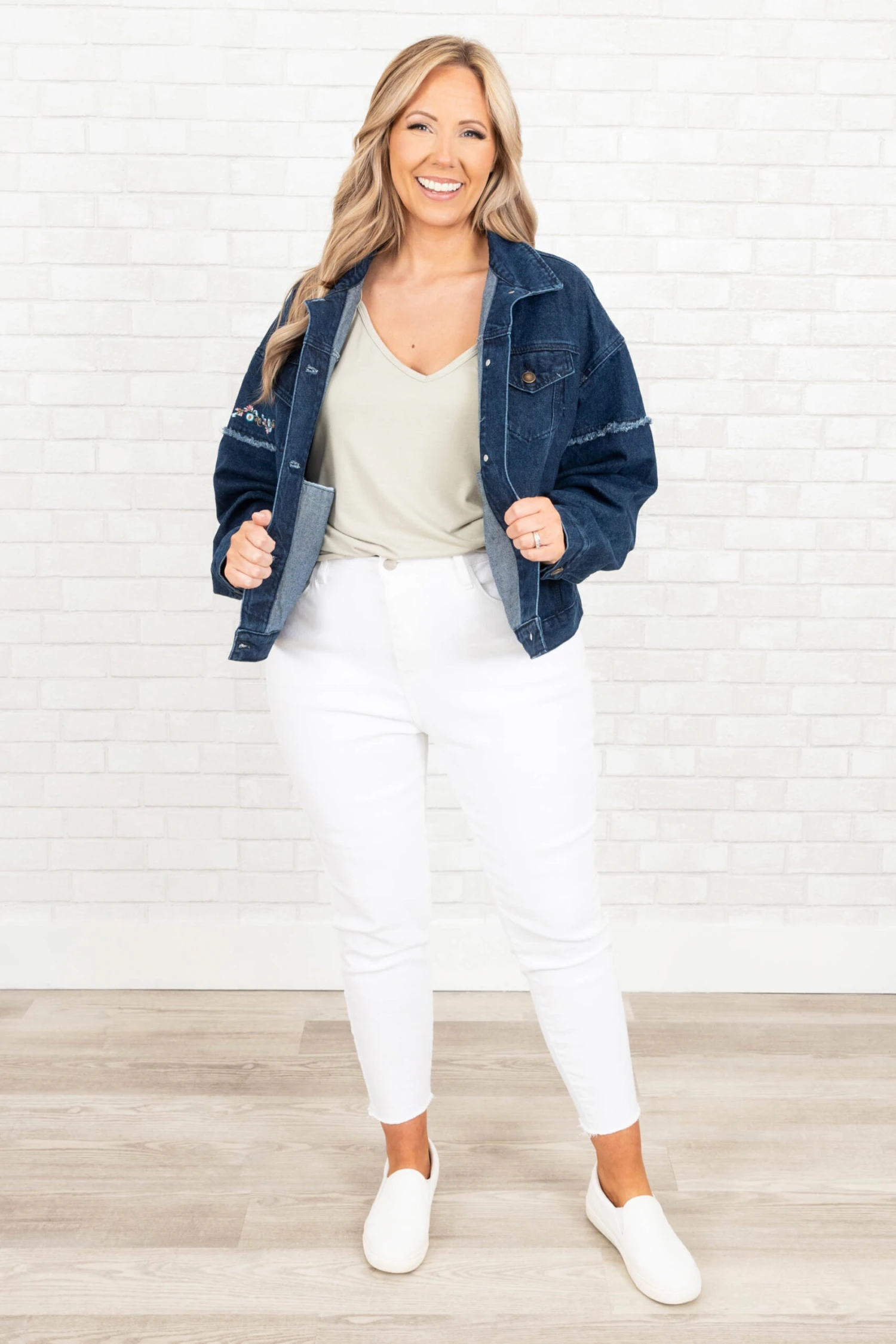 If you are waiting on a sign to grab this cutie, this is it! This jacket has a dark wash with embroidery detail that is a season favorite! The figure flattering fit is is easy to layer over all of your favorite outfits for a casual chic look!