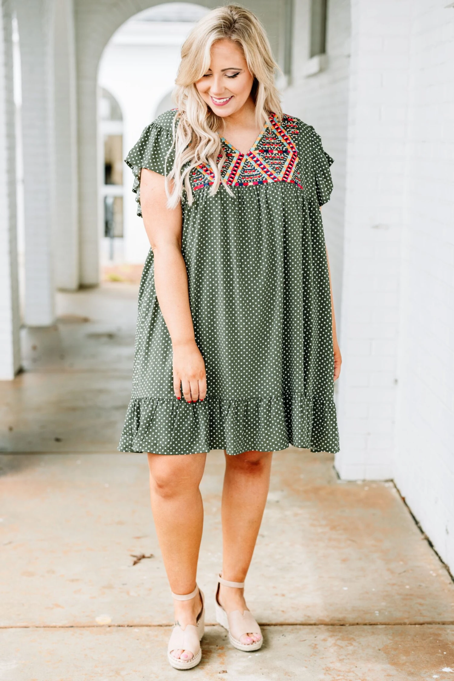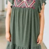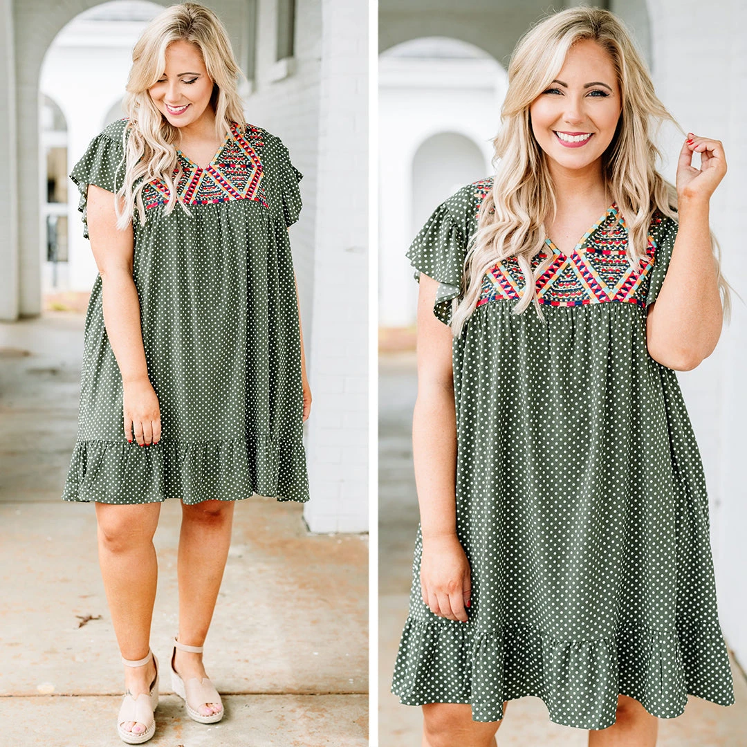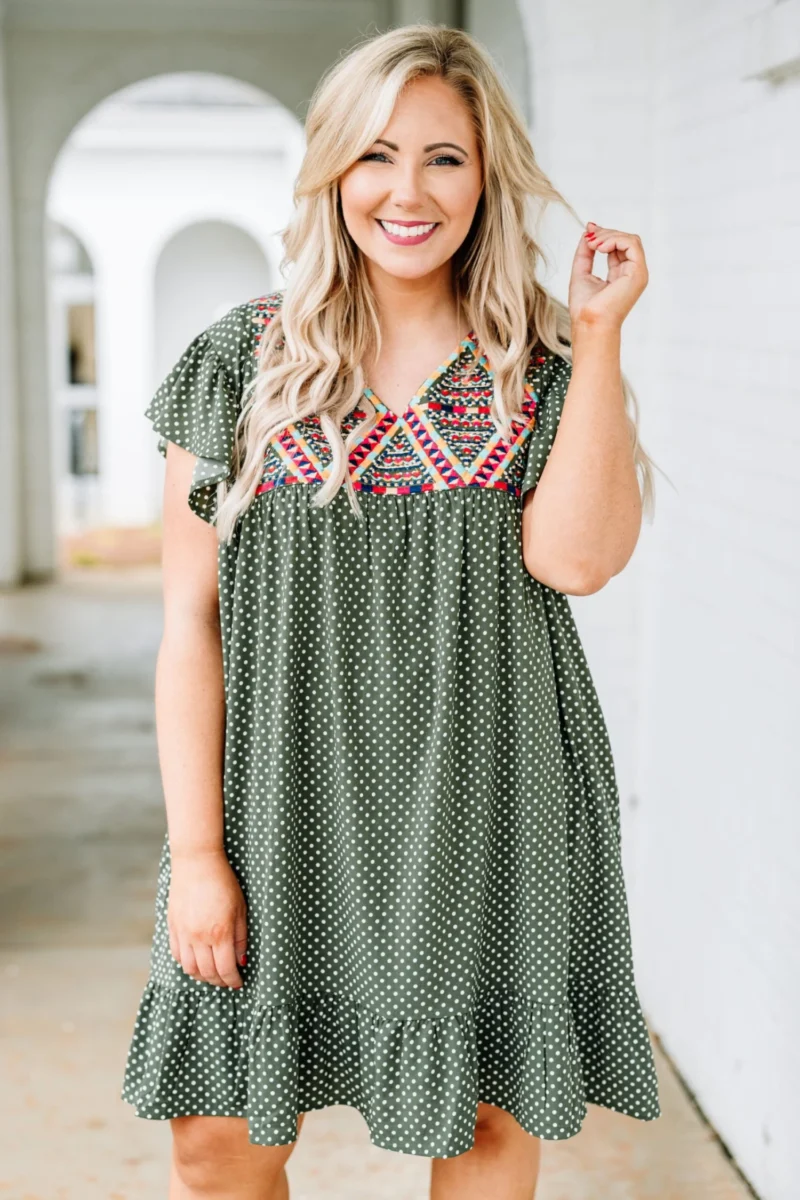 Let everyone know who’s world they’re living in when you’re wearing this dress! This dress has a beautiful polka dot pattern with just the right amount of embroidery for the season! It’s comfortable for all day wear, has a flowy fit to flatter your figure, and features the cutest ruffle details! Simply, wear this dress with wedges or sandals for an effortlessly chic look!Â