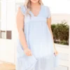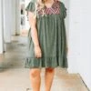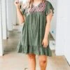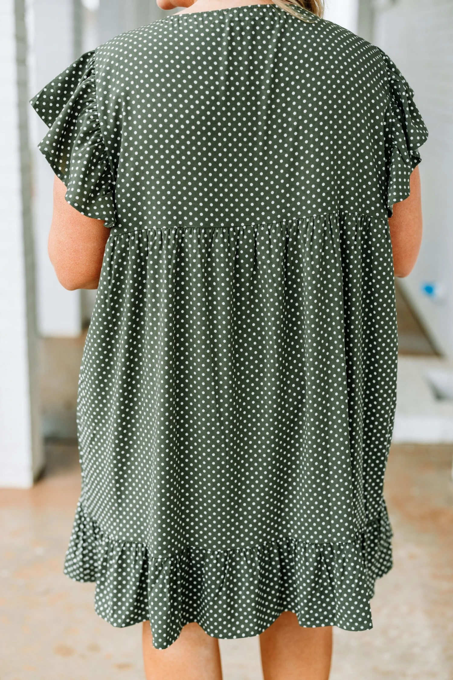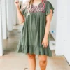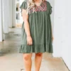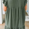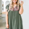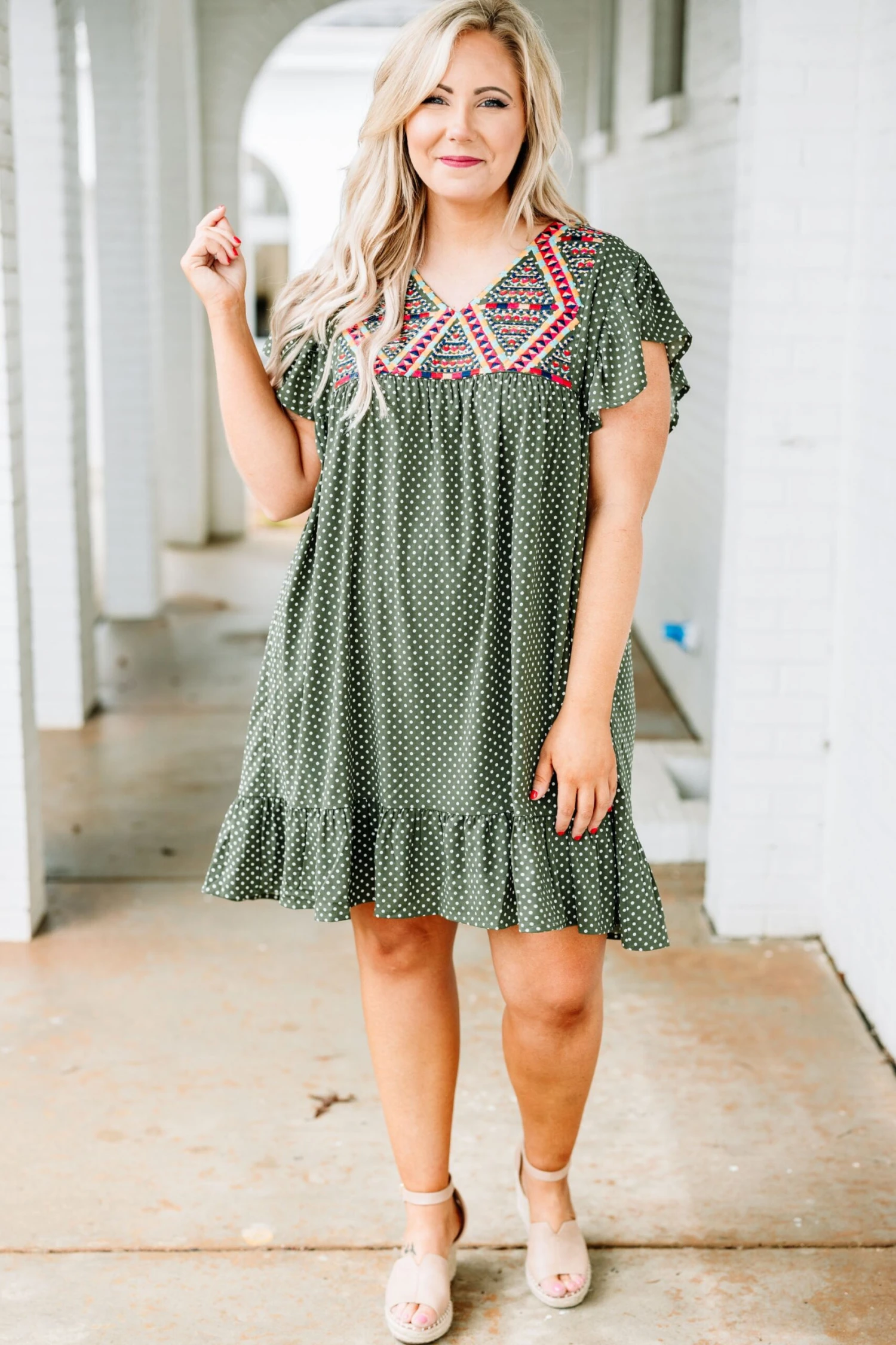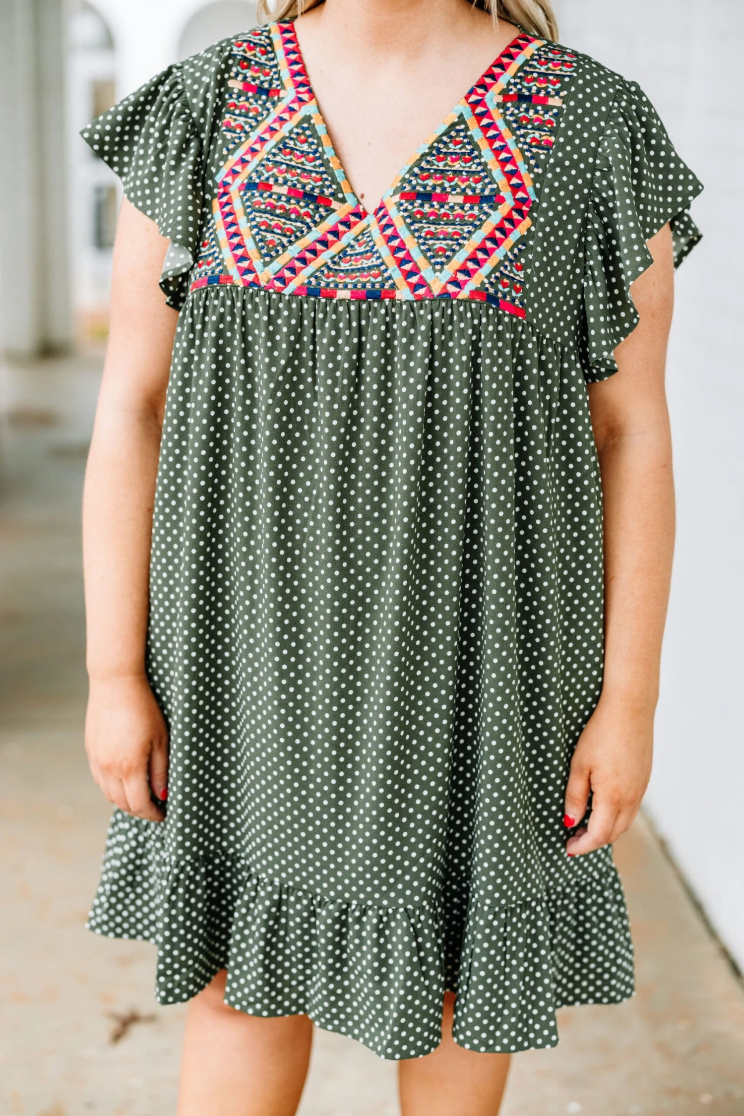 Let everyone know who’s world they’re living in when you’re wearing this dress! This dress has a beautiful polka dot pattern with just the right amount of embroidery for the season! It’s comfortable for all day wear, has a flowy fit to flatter your figure, and features the cutest ruffle details! Simply, wear this dress with wedges or sandals for an effortlessly chic look!Â
