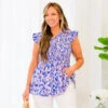We simply adore this top! It features delicate ruffle detailing, a smocked bodice, and an abstract design in a pretty blue hue that is super sweet! Elevate your style with this feminine and stylish piece! Pair it with white denim and heels or sandals for a classy chic look!