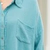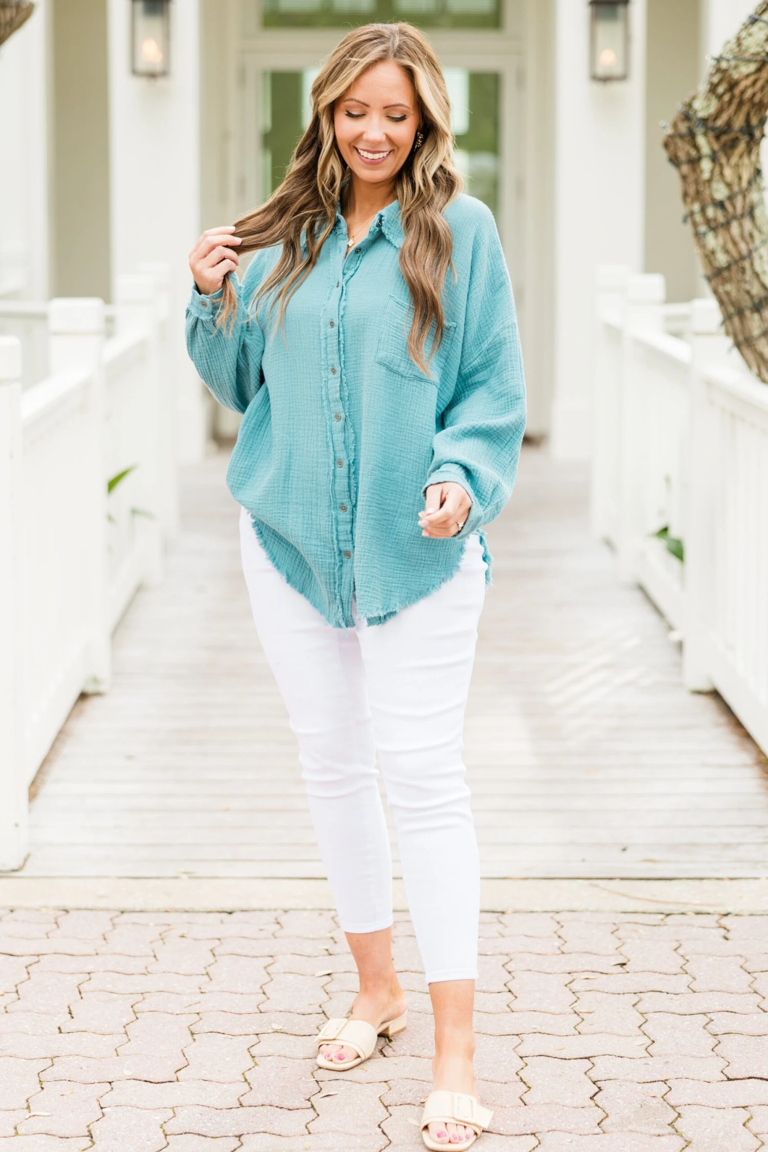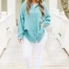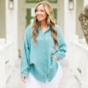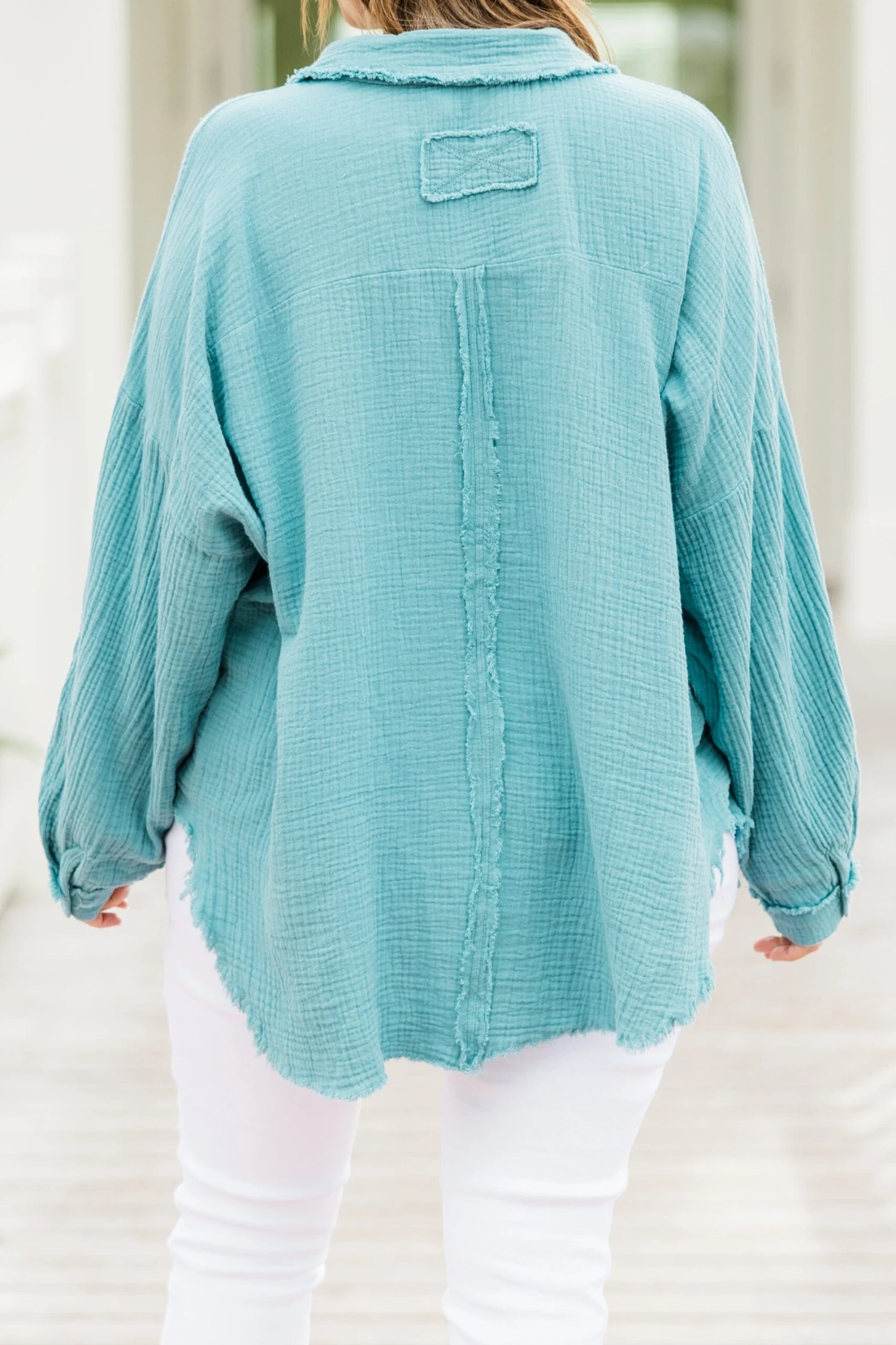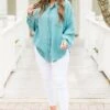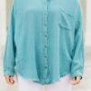 Effortlessly chic, our Act Of Faith Top in dusty teal is a must-have for your wardrobe! Made from lightweight gauze, this button down top features a frayed hem and collar that adds a touch of edginess! Perfect for any occasion, this top is both stylish and comfortable!