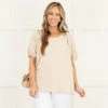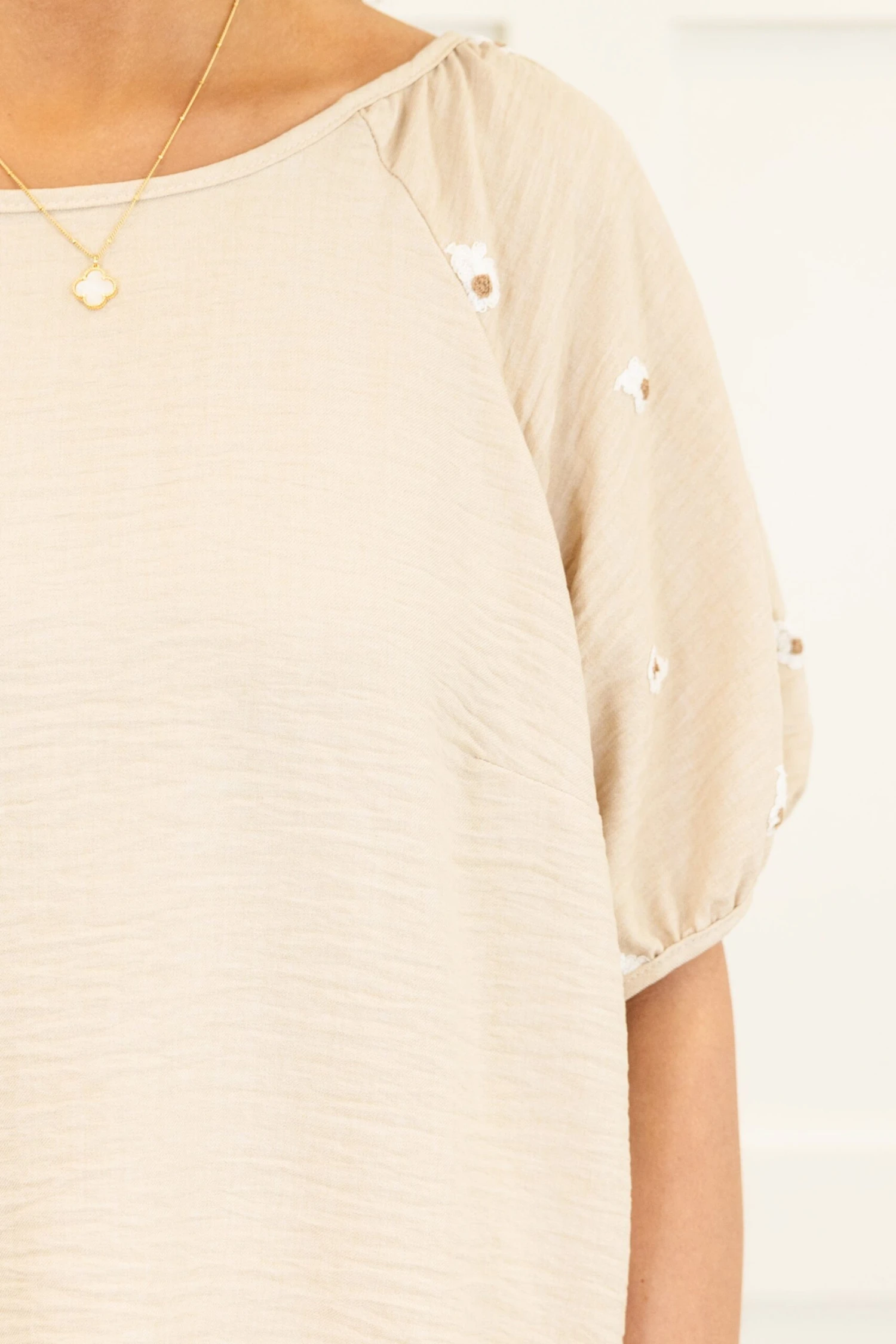 We are so in love with this top! Expertly crafted from a stunning beige fabric, this top boasts elegant bubble sleeves and intricate embroidery detailing! Designed for a flowy fit, this top provides both style and comfort! Elevate your wardrobe with this gorgeous piece!