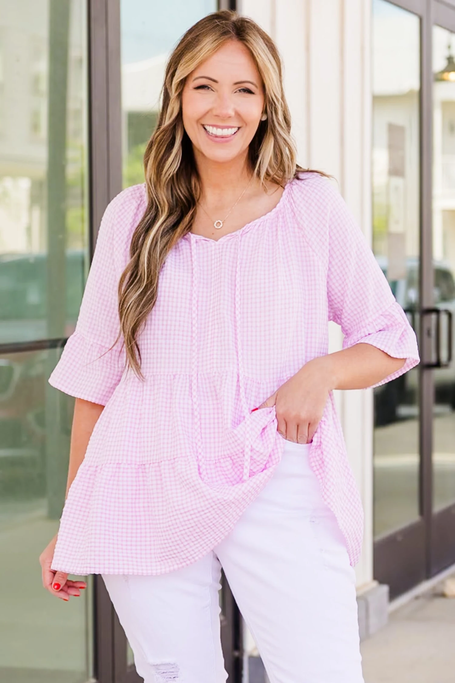 You’ll be admired by many in this adorable top! It features a trendy plaid pattern and a beautiful pink color, making it perfect for a day out on the town! Add a touch of style and charm to any outfit with this top!