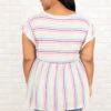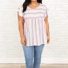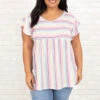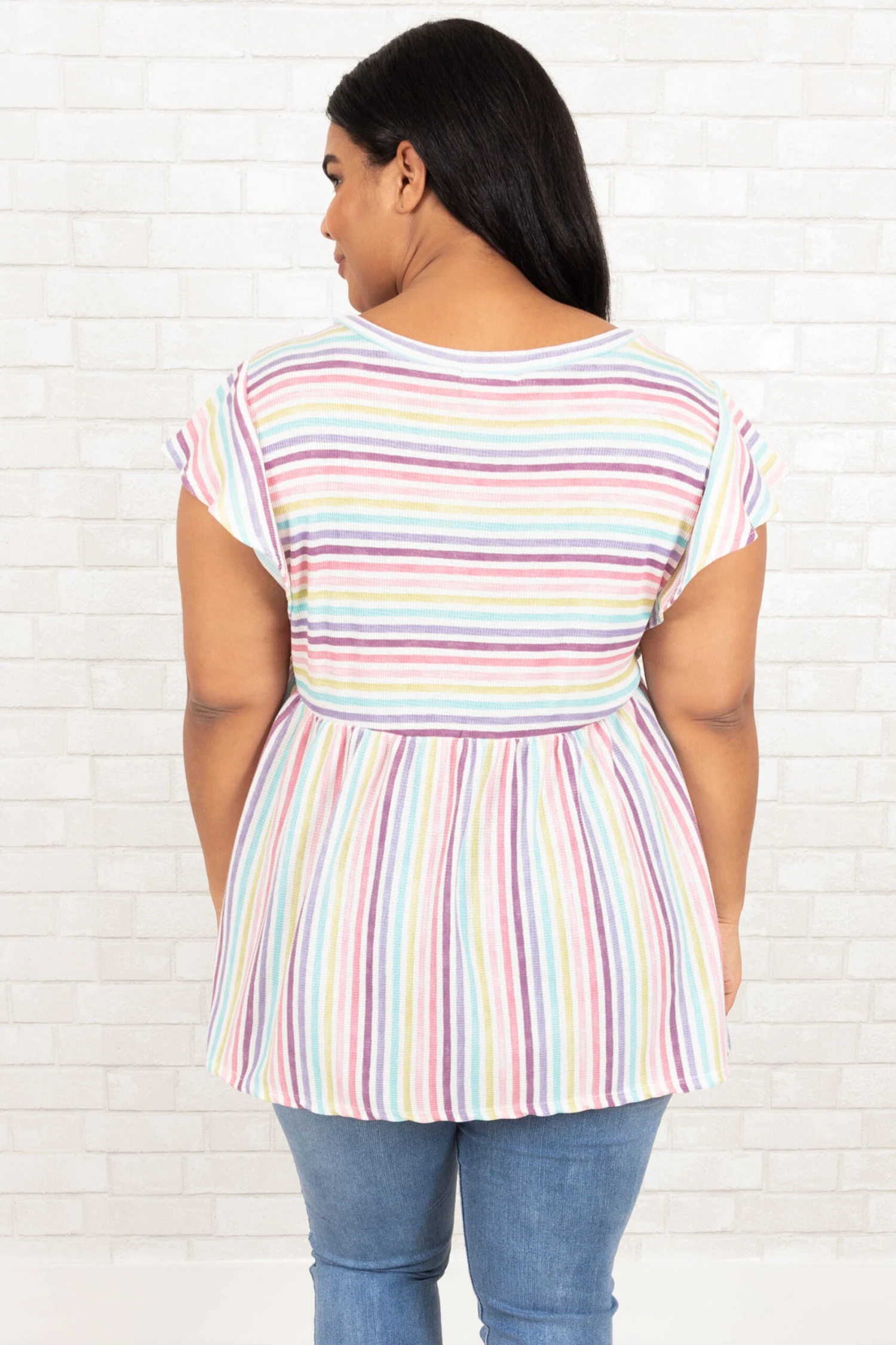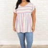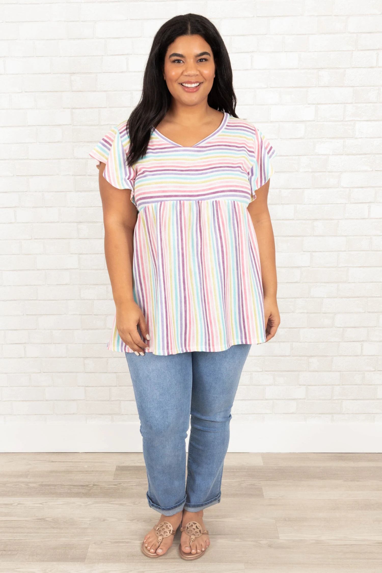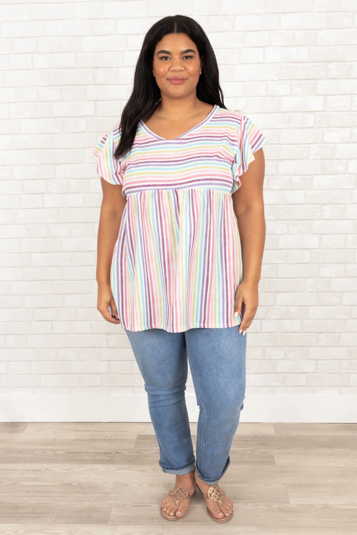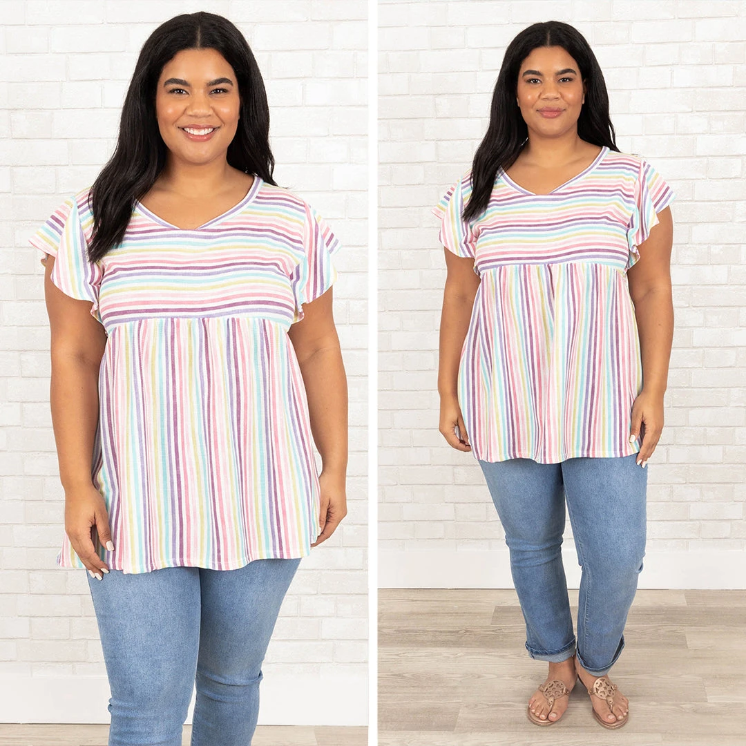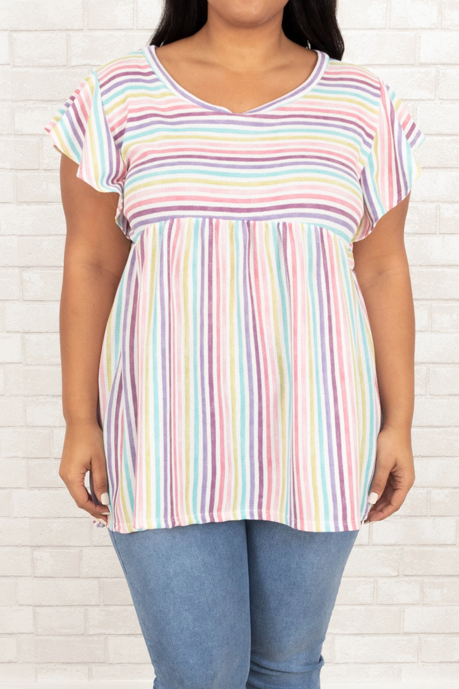 WE simply love this adorable top! It has a bold multi color striped design that is just in time for the season! The lightweight, flowy fit is perfect for all day wear! The flutter sleeves and babydoll style are a dynamic duo! Style this top with some cute jeans and sandals for a classic chic look!