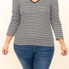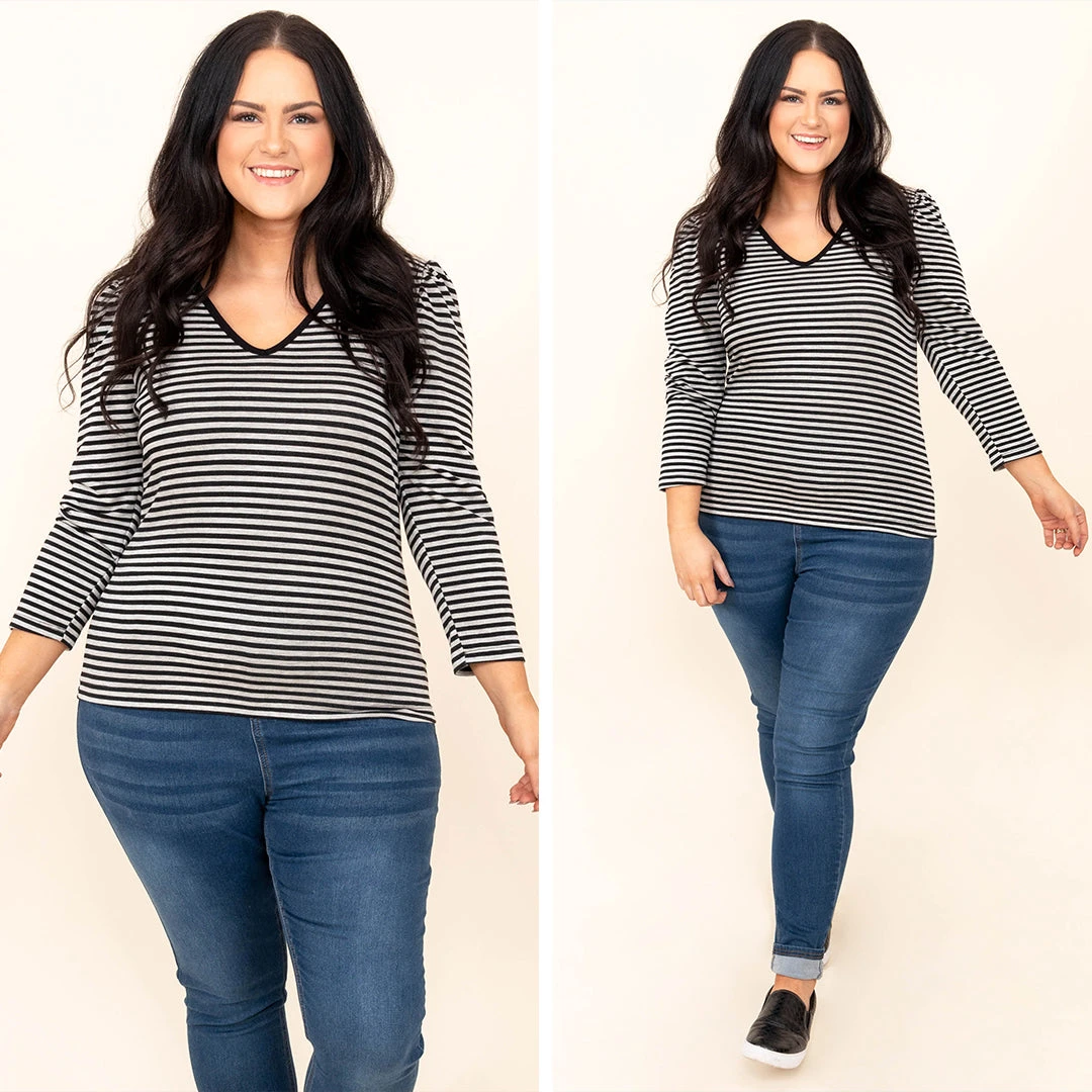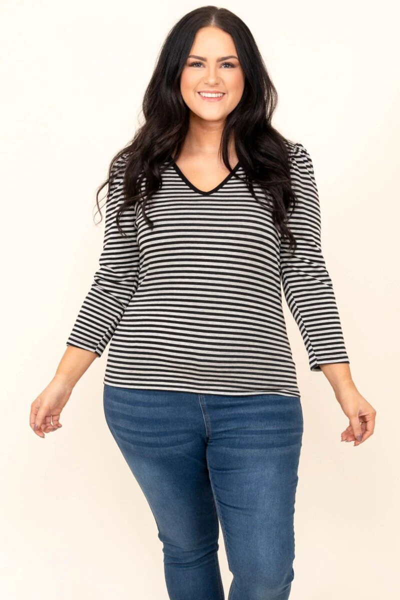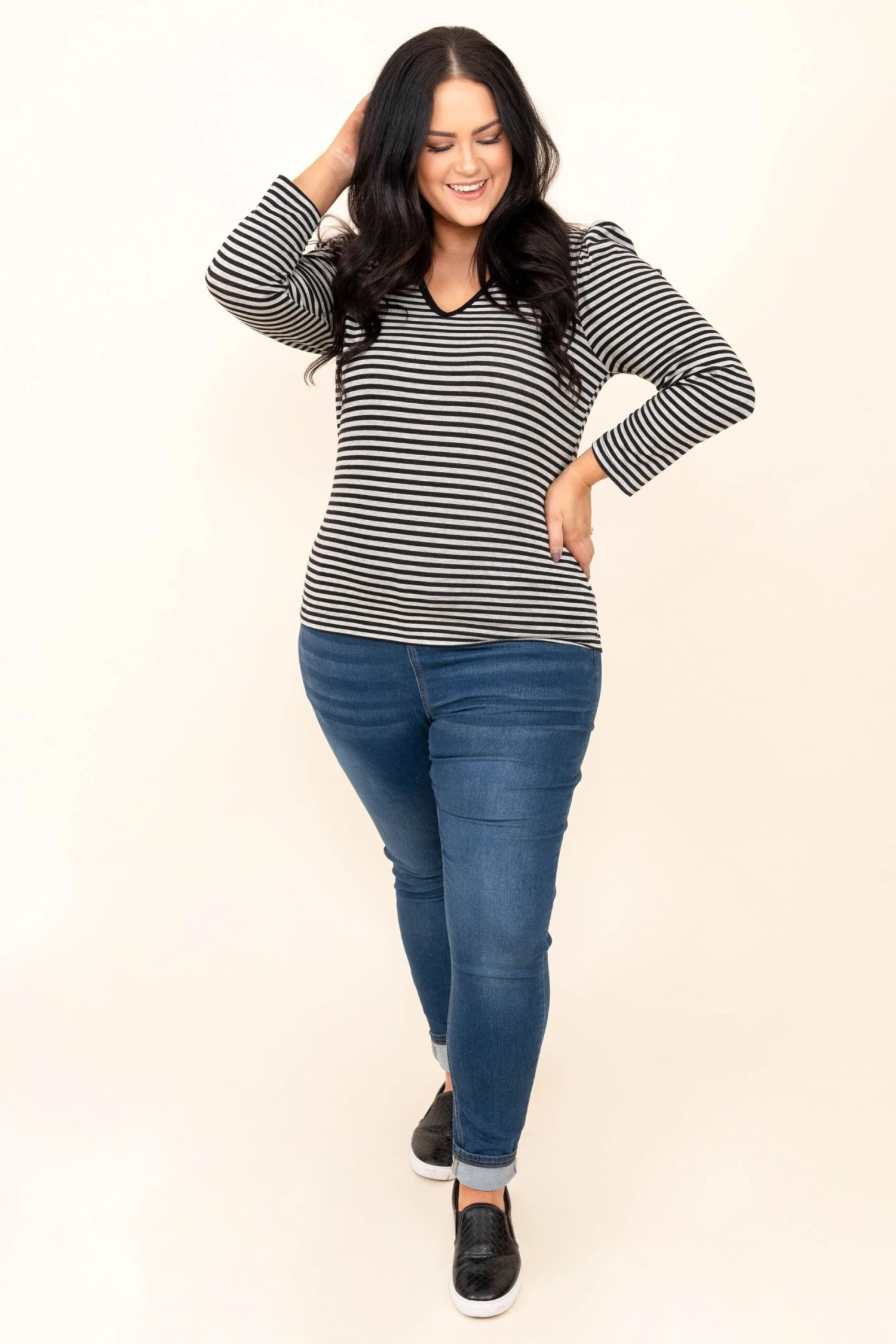 Spend the afternoon in the park in this adorable top! This top has a soft grey color with a striped pattern that is super cute! The stretchy, figure flattering fit is perfect for all day wear this season! Style this top with skinnies and slides for a casual chic look!