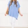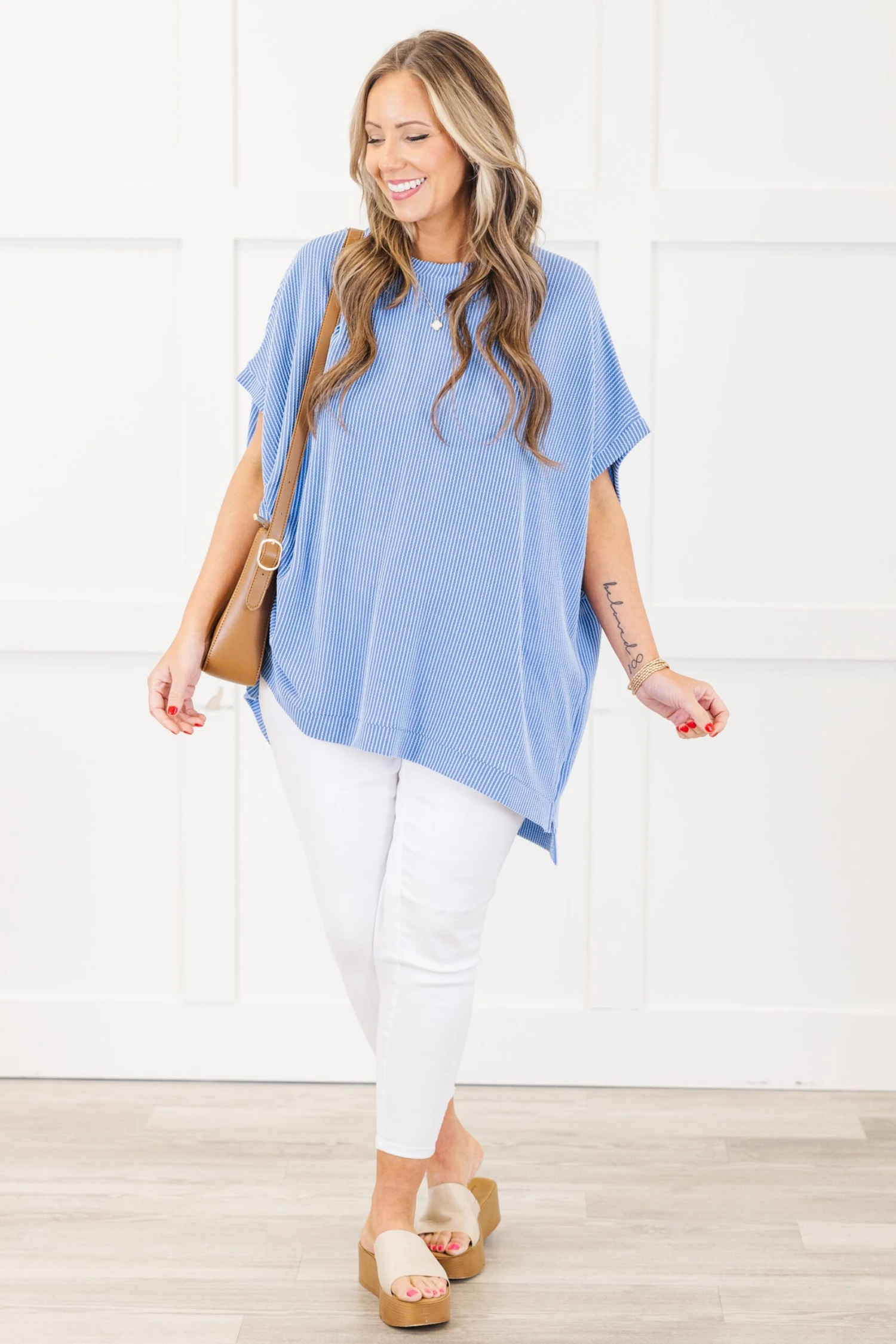 We are all about this gorgeous top! The lovely blue color and oversized fit is super comfy and chic! The ribbed texture and stretchy style is a must-have! Style this top with some denim and cute accessories for a classic chic look!