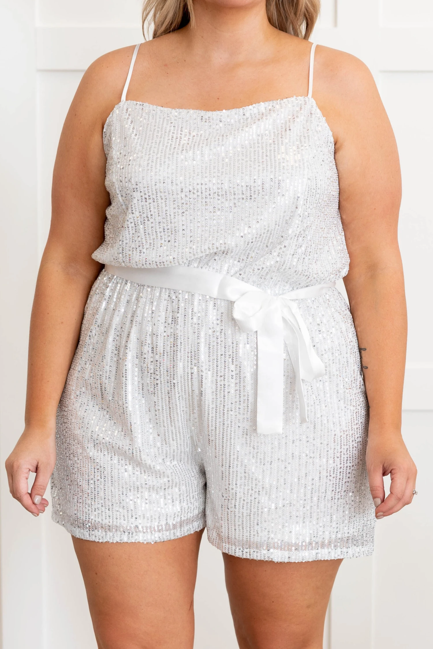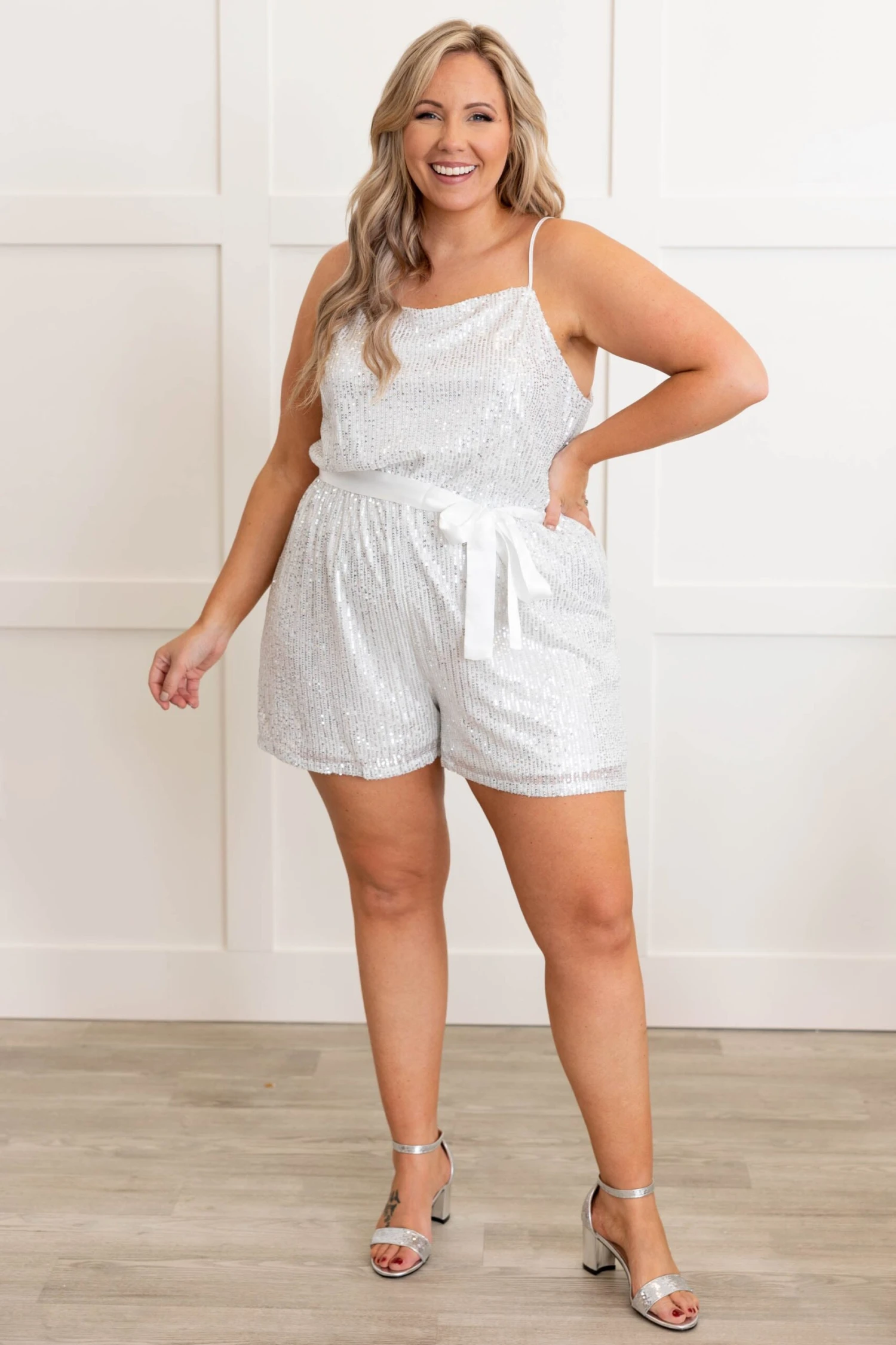 We are doing it all for love in his romper! This cutie has a white fabric with gorgeous silver sequins all over! The straps are adjustable so you can get the perfect fit and the cinched waist with the tie is so cute! Style this with heels for the perfect event look!