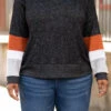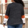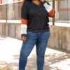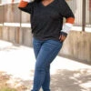You will be all ready to go in this top! The black color looks so good with the orange, white, and gray detailing on the sleeves! The v-neck is so flattering and the material is oh so soft! We love this styled with some skinnies and booties for the cutest look!