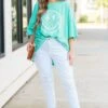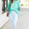 You’ll have only smiles in this fabulous boyfriend tee! It features an adorable smiley graphic on a pretty mint background! Its oversized fit makes it perfect for everyday comfort and style! With its pretty dusty pink green color, you can’t go wrong with this one!