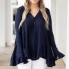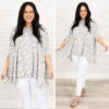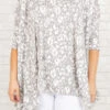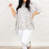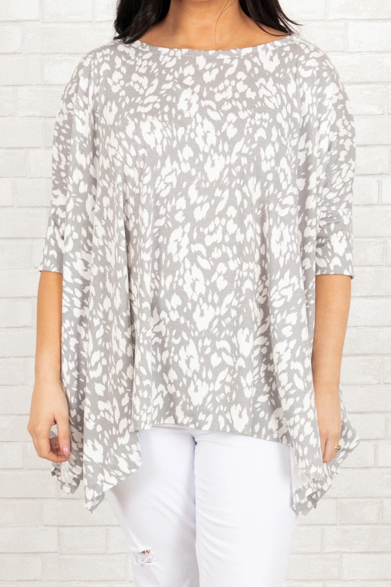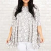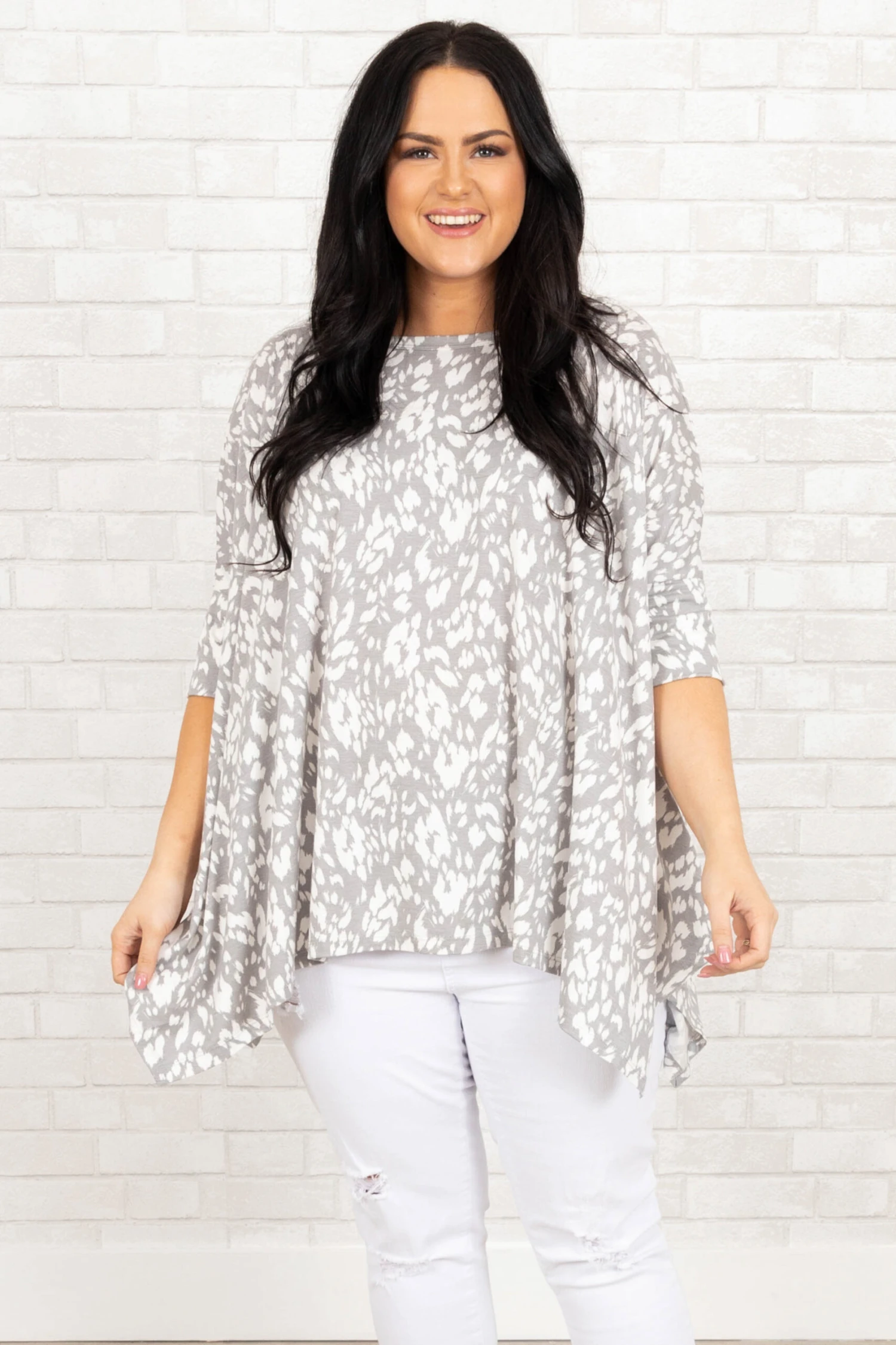This top is all the buzz! The grey color looks good on everyone and is so easy to pair with anything! We love the butter-soft material and the white leopard pattern that is so fierce! Style this with white denim and sandals for a super chic look!Â