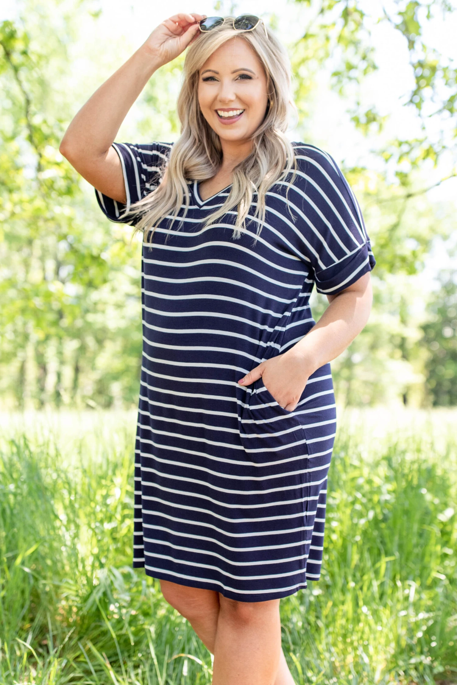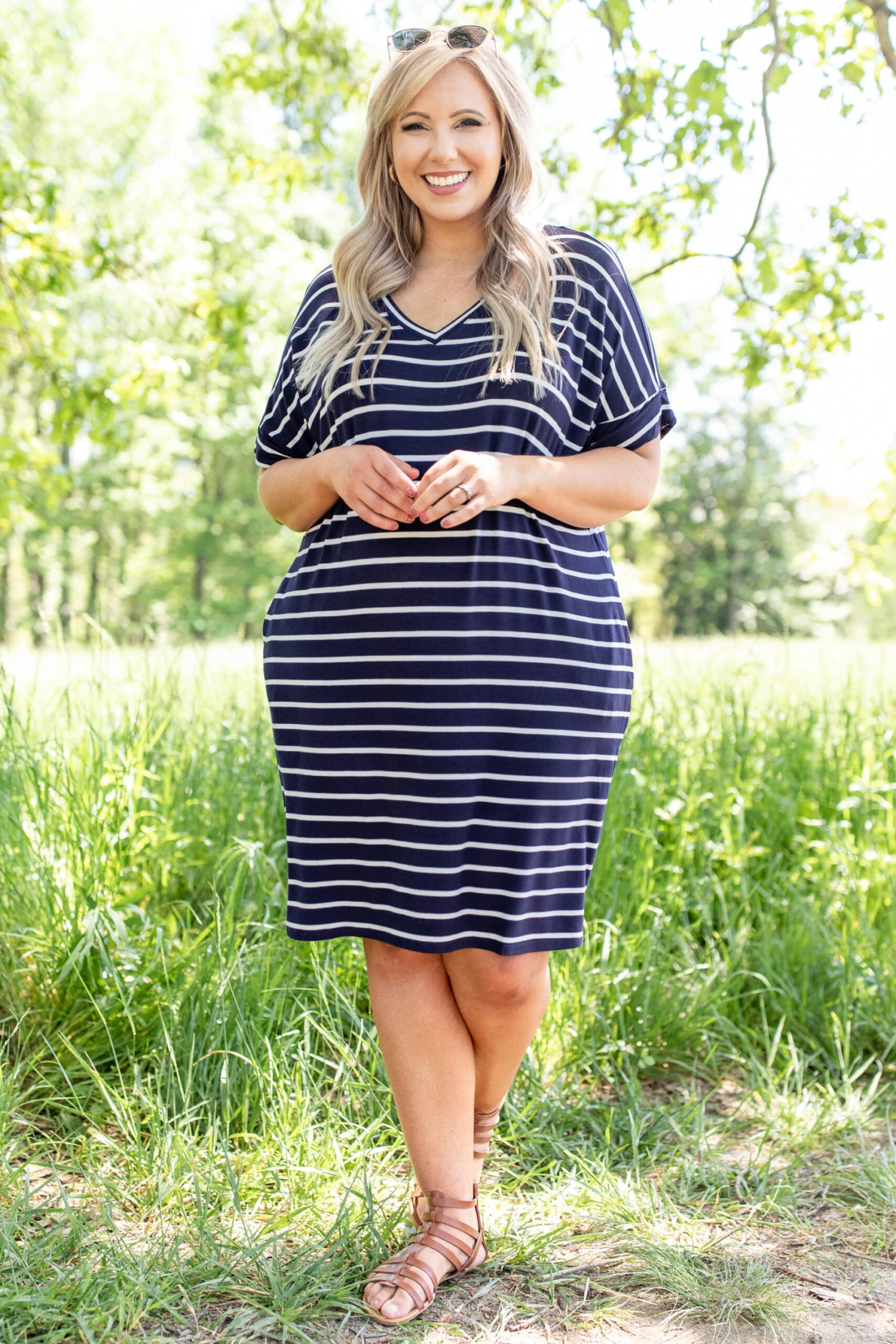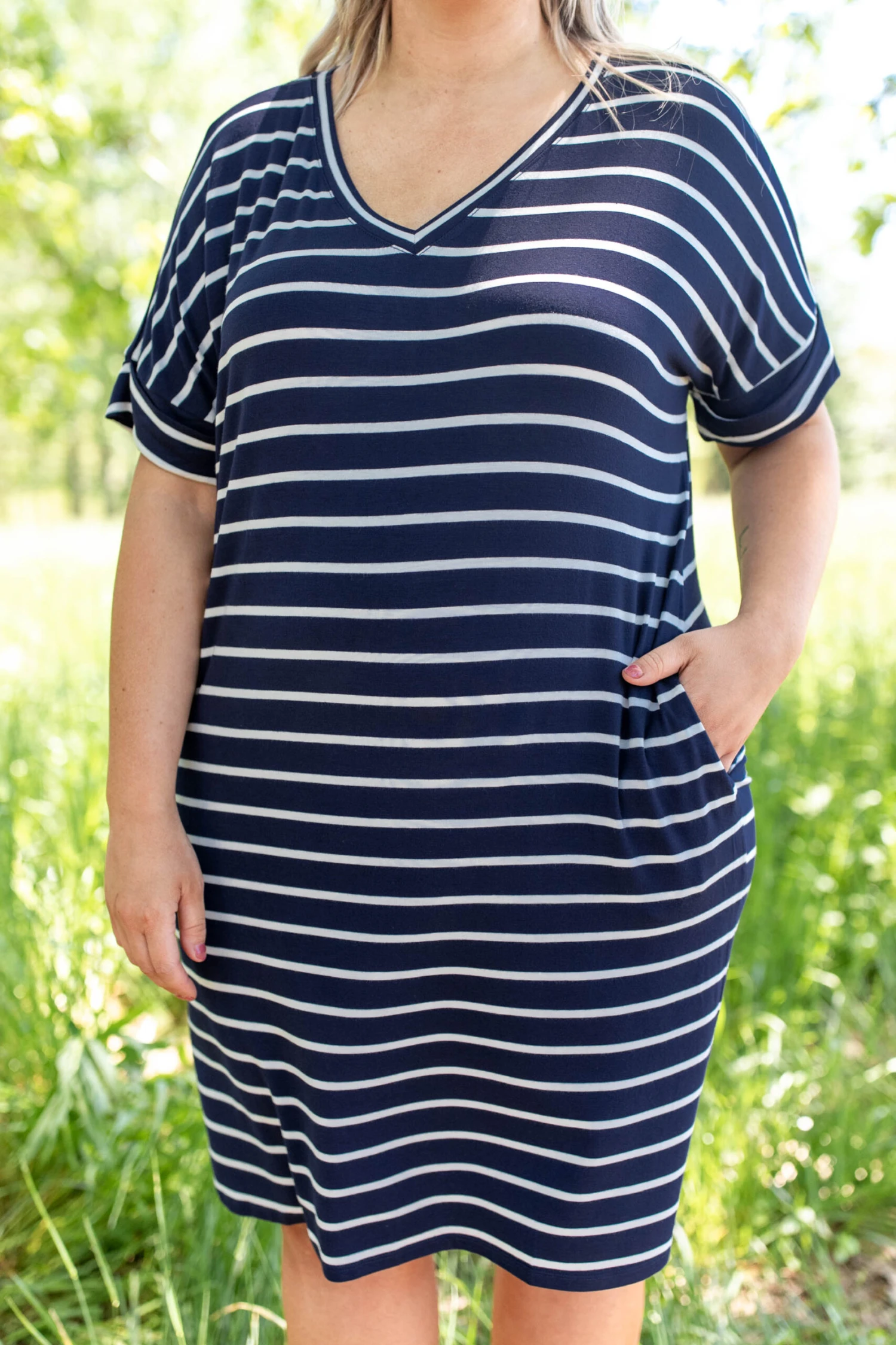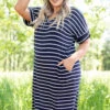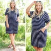 This is the dress you can wear all times of the year! This dress has a pretty striped pattern with colors you can dress up or down for every occasion! It’s comfortable for all-day wear, has a figure-flattering fit! Simply style this dress with flats or booties for your next event!Â