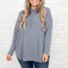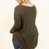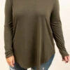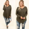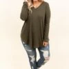 This top is all things nice! It has a solid olive color, a v-neck style, and a super comfy fit! The fabric is ultra soft and we love the long length in the back and front! Wear it with leggings for a casual day of lounging or dress it up with a plaid vest and skinnies! Any way you style it you’ll look super trendy!