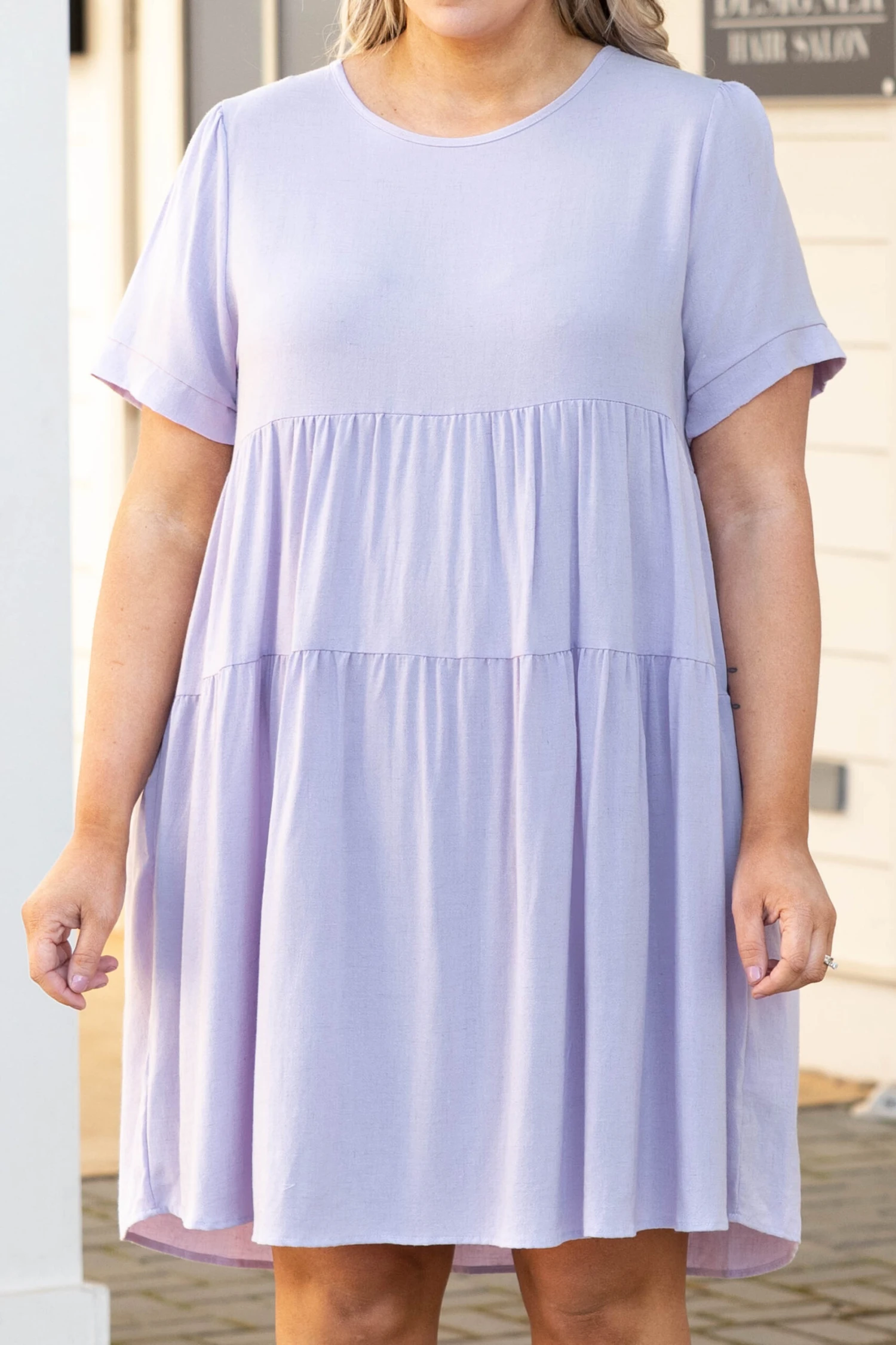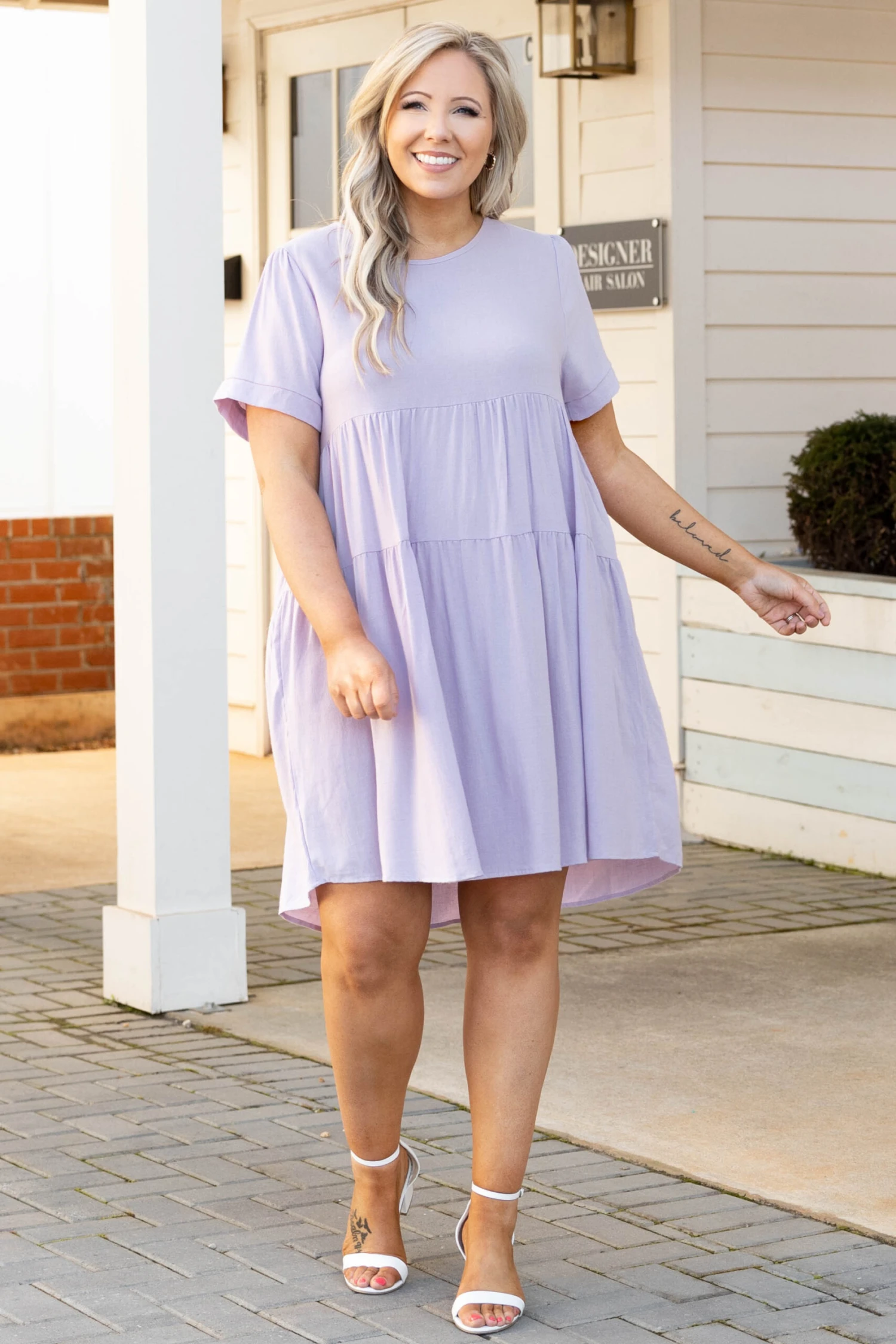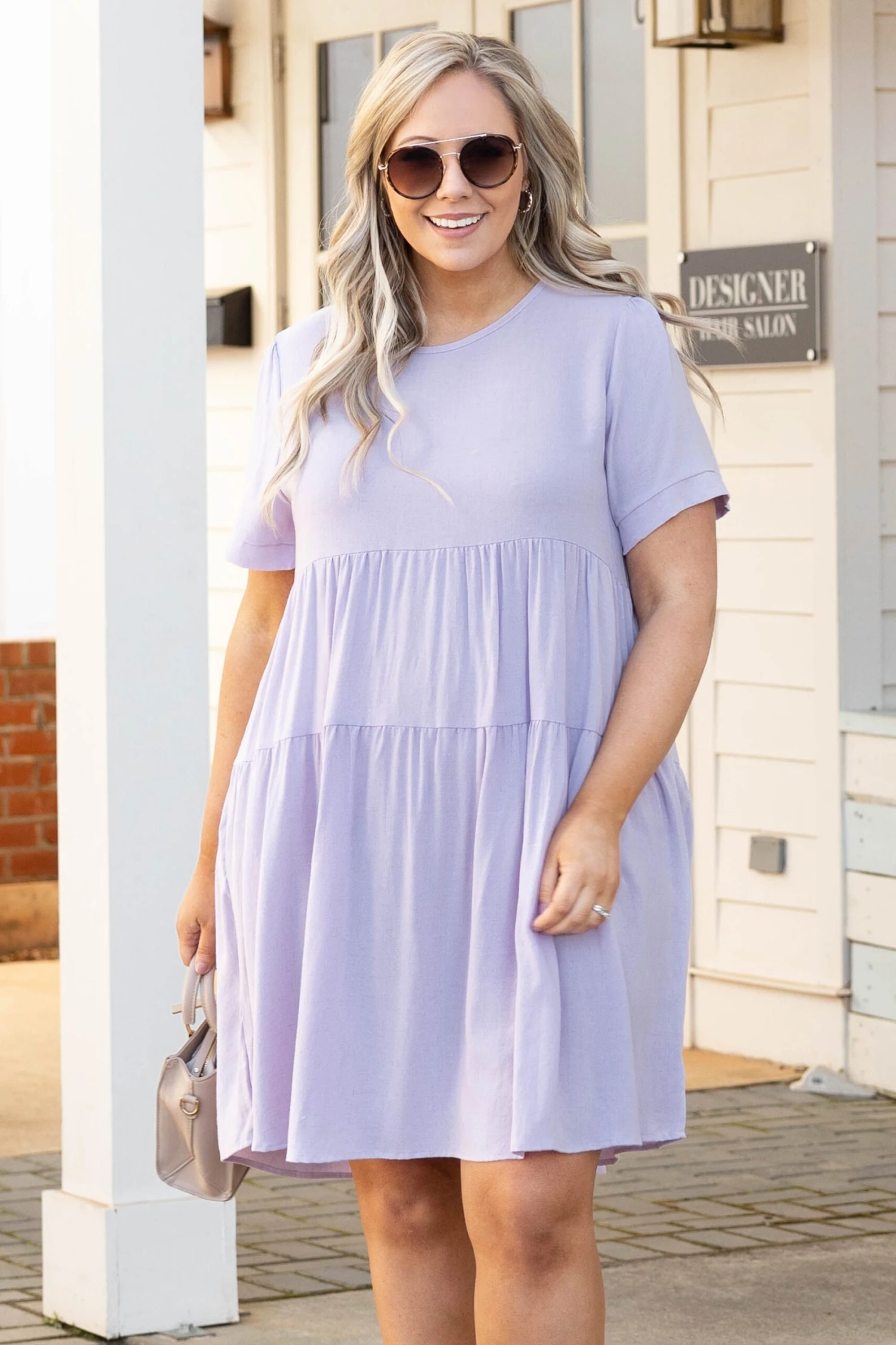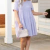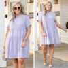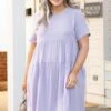Alright, ladies, you’ll want to get this dress before it is too late! We absolutely love it! This dress has a solid lilac color with a textured fabric we adore! It’s comfortable for all-day wear and has a flowy fit! Style this dress with wedges or sandals for an easy everyday look!Â