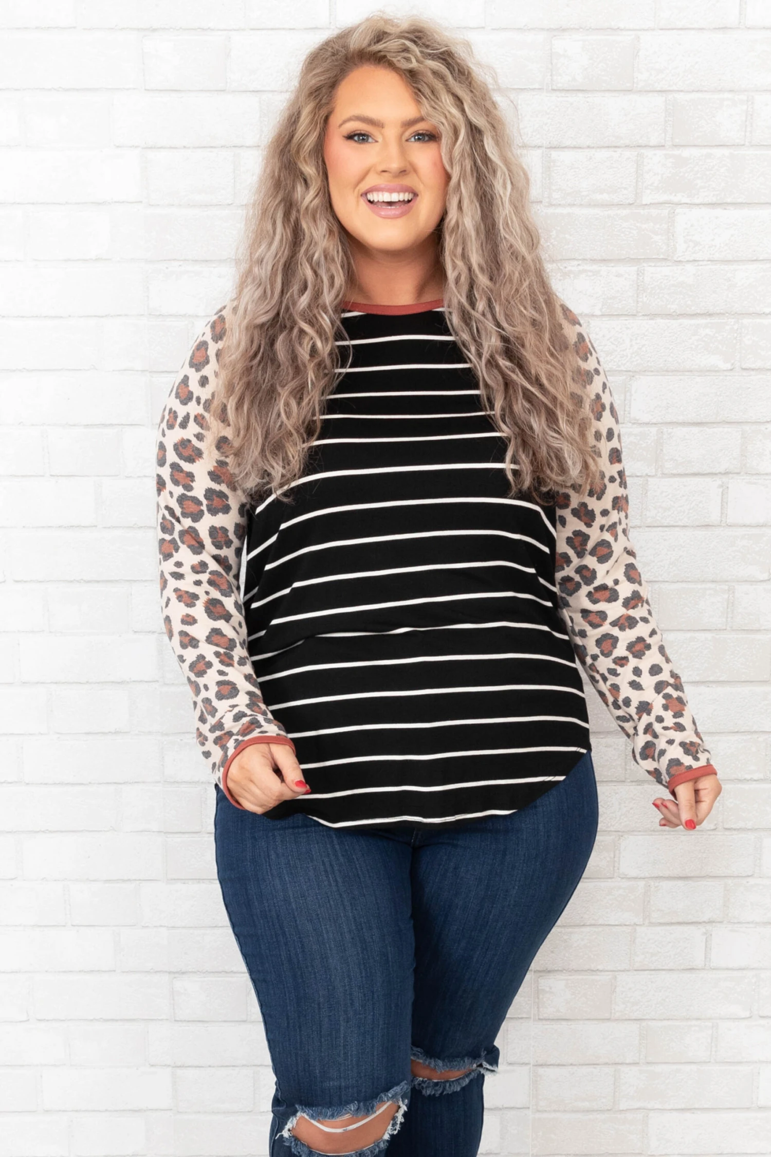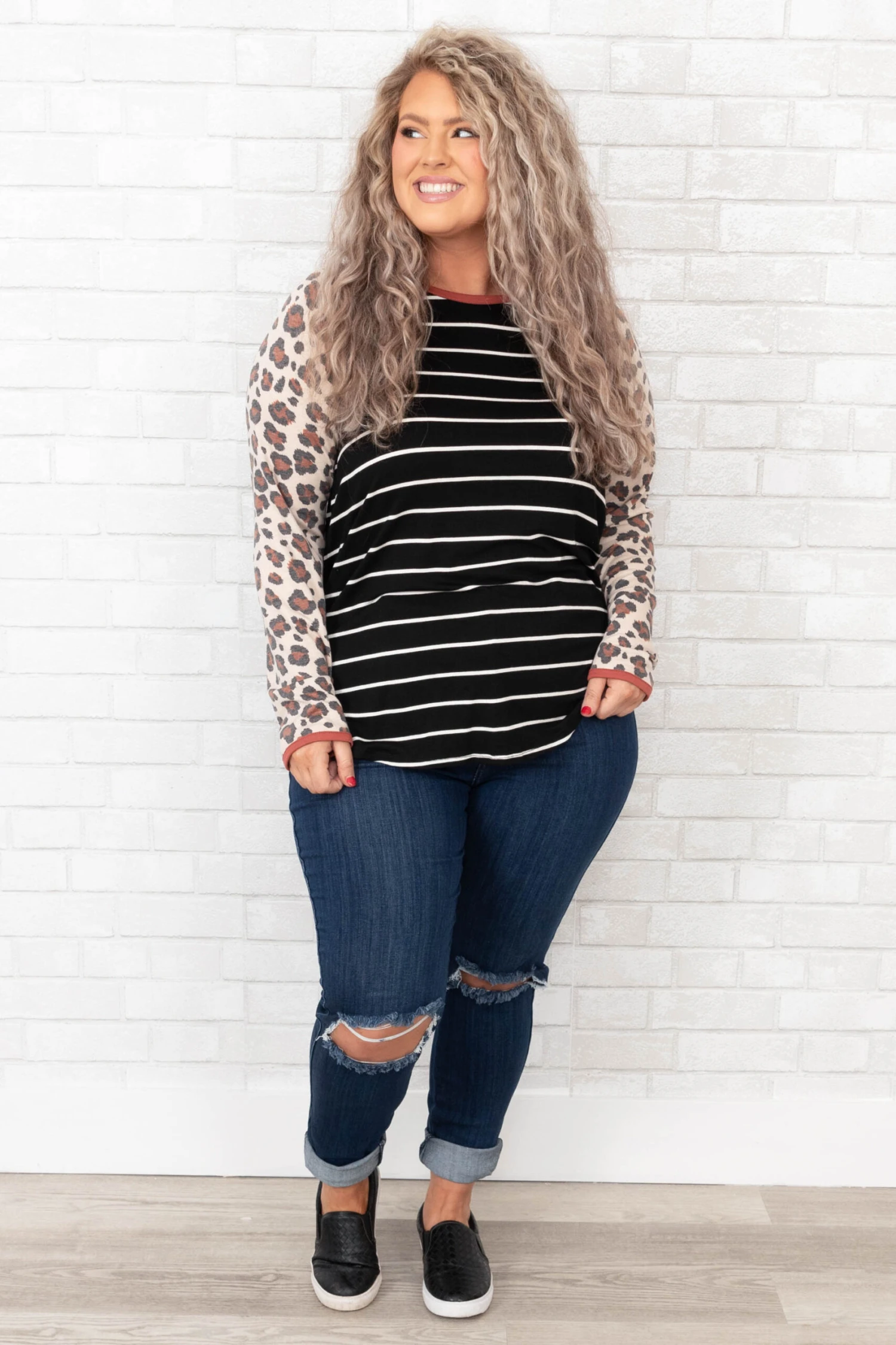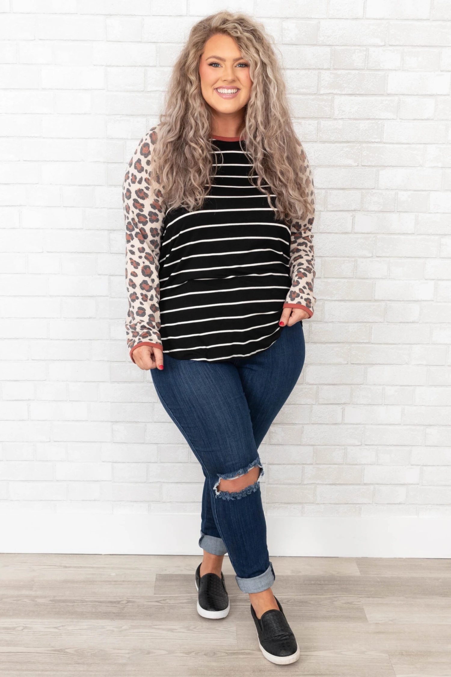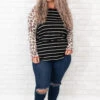 You’re sure to stand out in this gorgeous top! It has a classic black color with a trendy stripe pattern and leopard print sleeves that are super sweet! The stretchy, figure flattering fit is perfect for pairing with some distressed skinnies and sneakers for a casual chic look!