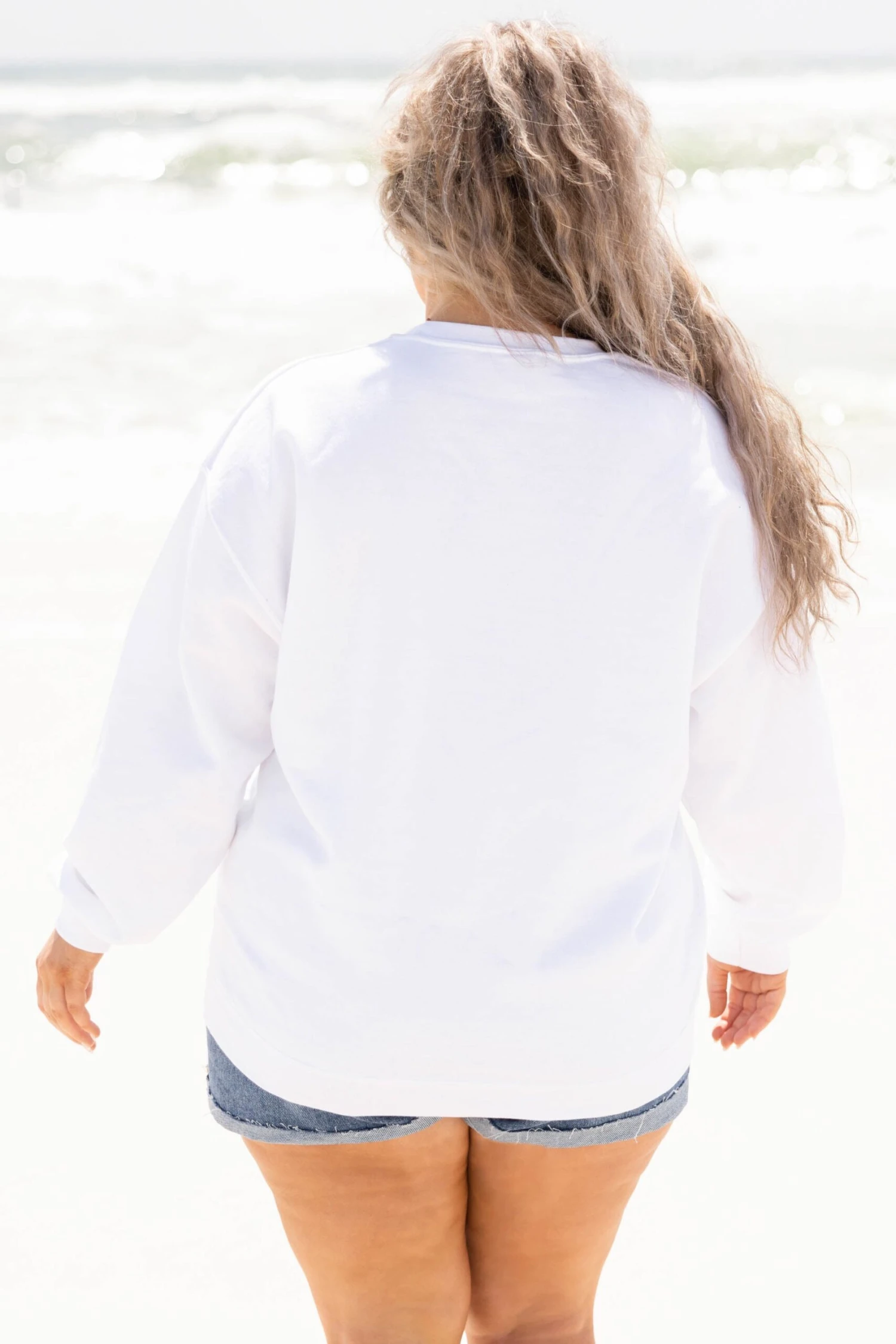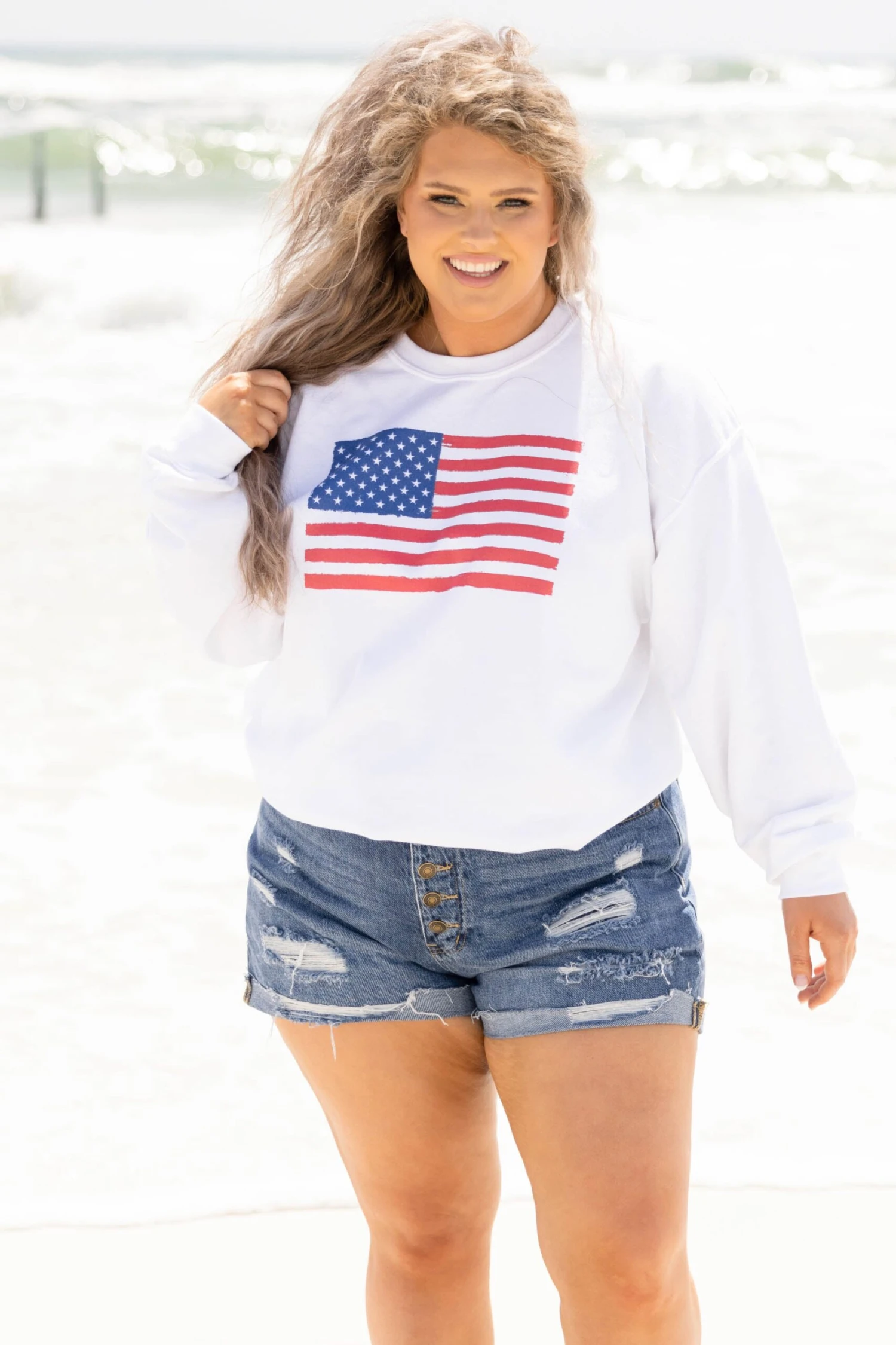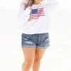 Reach your dreams in this pullover! This cutie has a neutral white color so you can easily pair it with all of your fave bottoms and the American flag graphic is so perfect! We love this styled with some jean shorts and sneakers for a casual chic look!