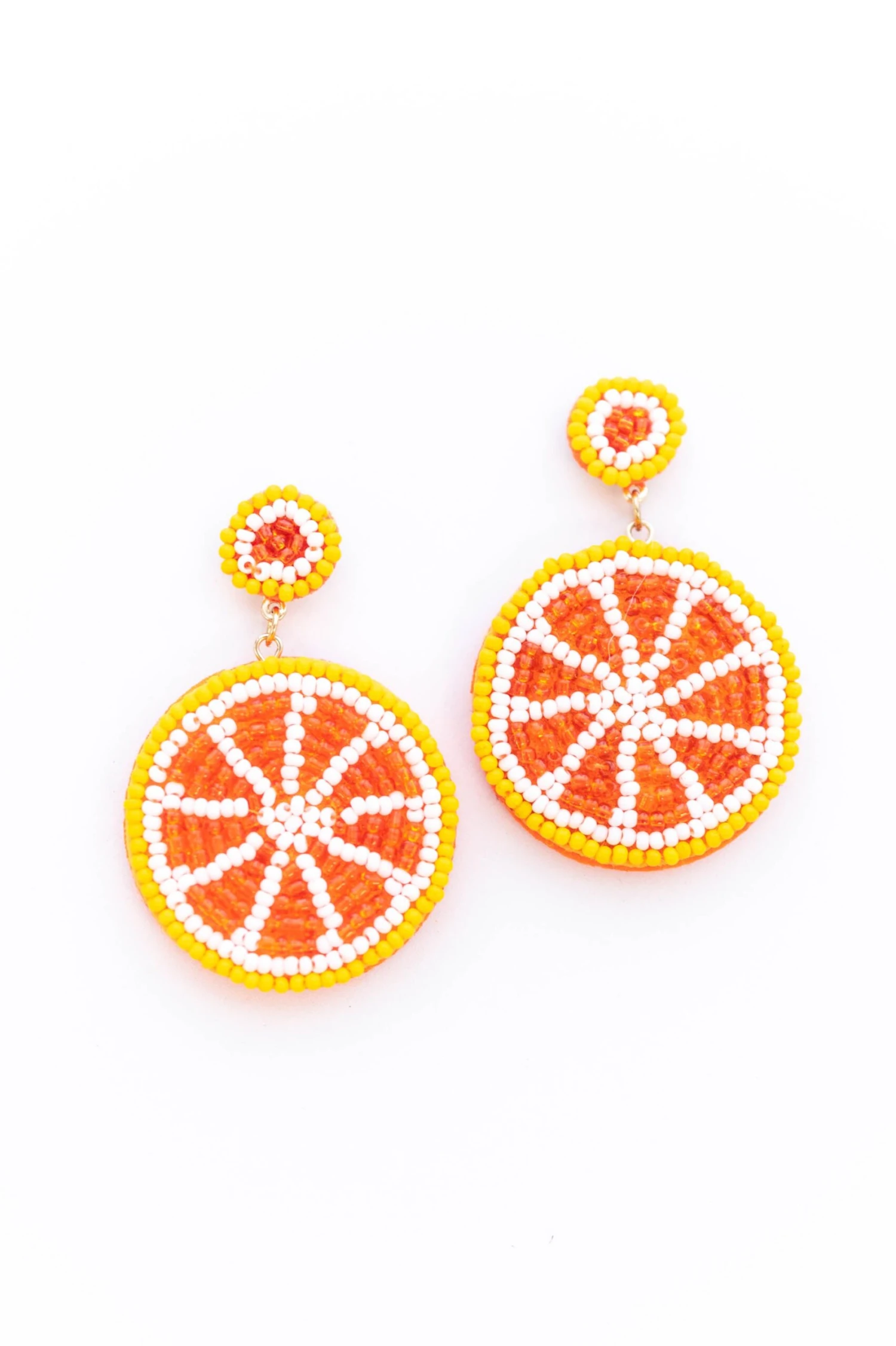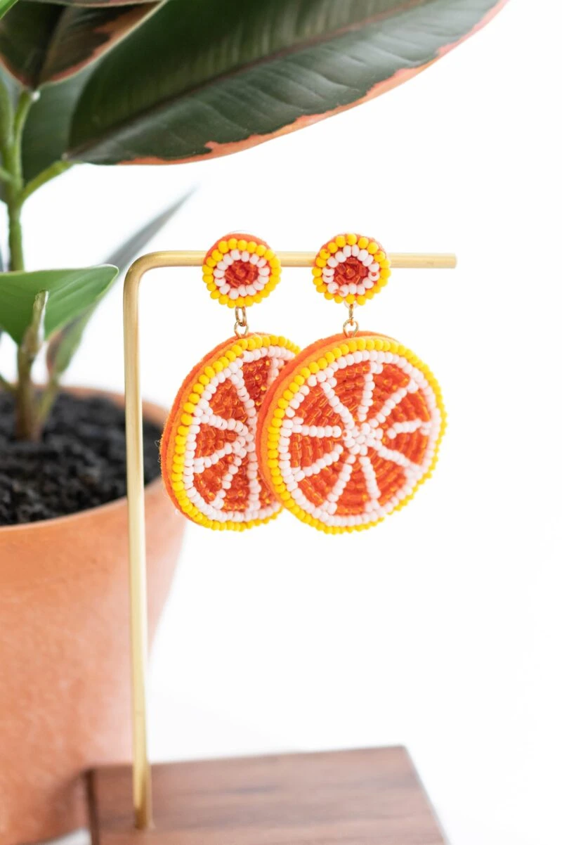 Hang out among the orange trees in these gorgeous earrings! They have a bold orange color with a beautiful beaded design design that is so unique and sweet! Style these earrings with a cute top and skinnies or a sassy dress for a fun chic look!