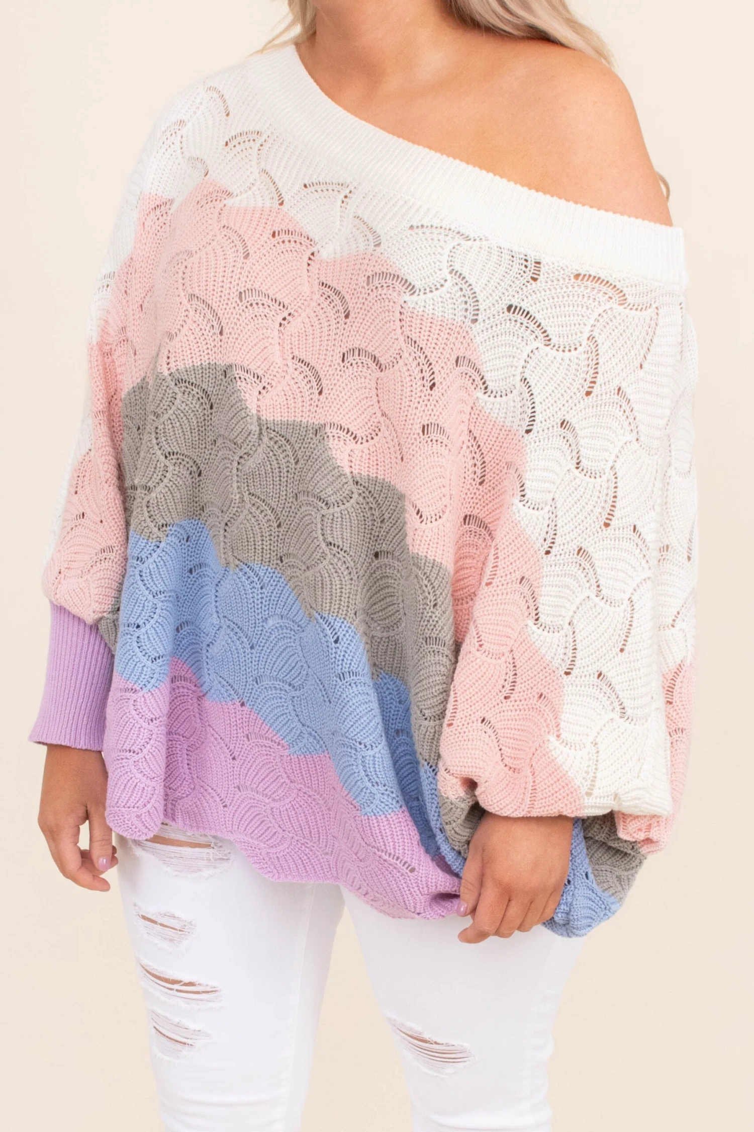 Look like the angel you are when you’re wearing this sweater! This sweater has a large knit fabric with a sweet scalloped design you can wear all season long! It’s comfortable for all day wear, has a over-sized fit to flatter your figure, and can even be worn off the shoulder! Not to mention how easy this piece is to style! Wear this sweater with skinnies and boots for an effortlessly chic look!Â