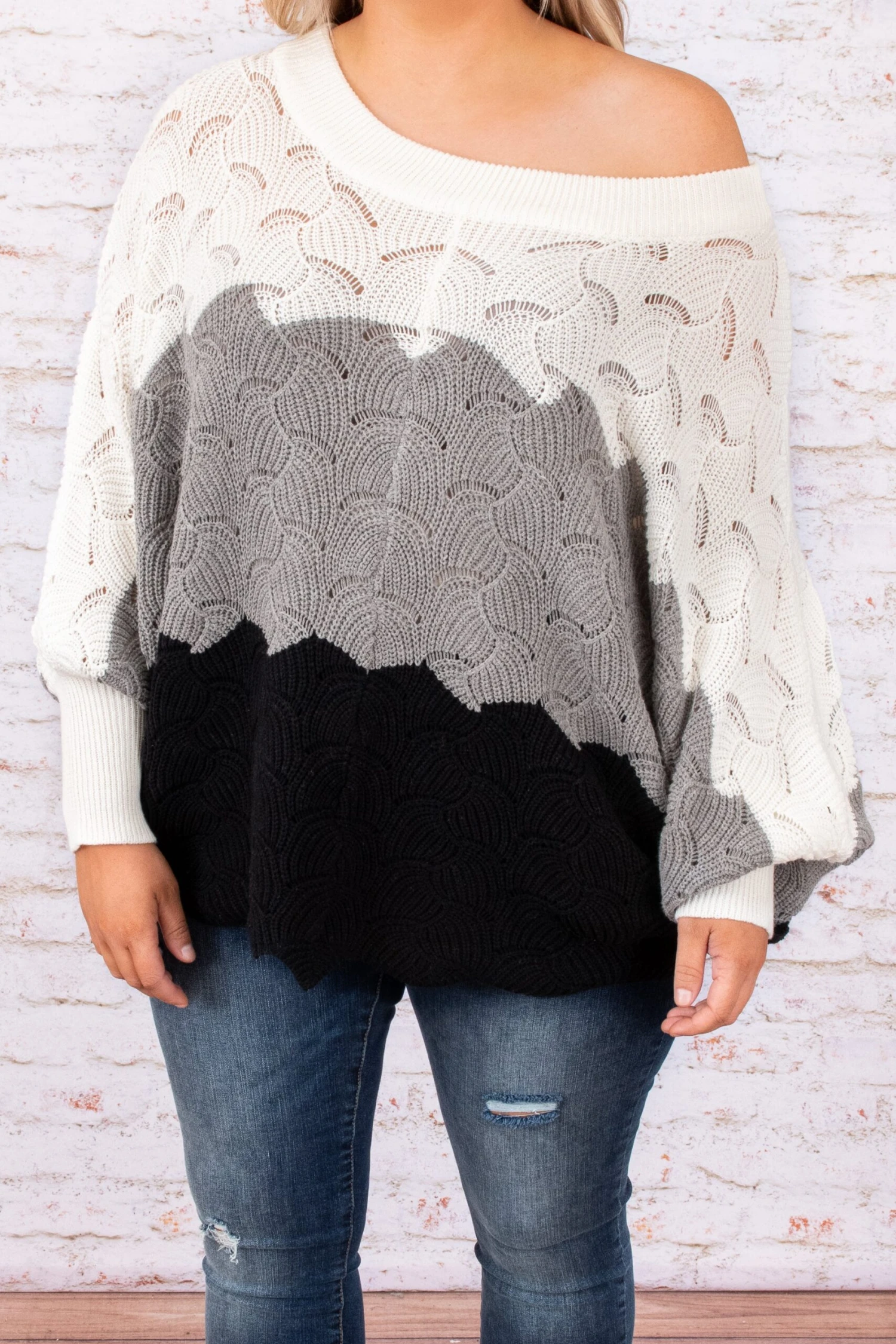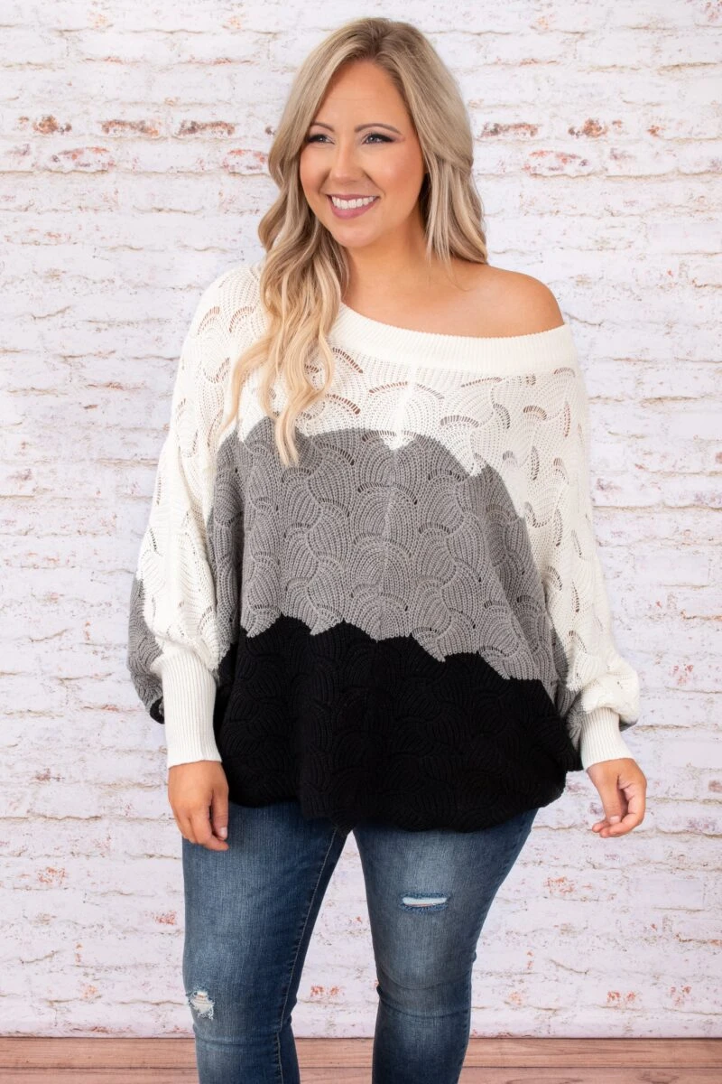 Look like the angel you are when you’re wearing this sweater! This sweater has a large knit fabric with a sweet scalloped design you can wear all season long! It’s comfortable for all day wear, has a over-sized fit to flatter your figure, and can even be worn off the shoulder! Not to mention how easy this piece is to style! Wear this sweater with skinnies and booties for an effortlessly chic look!Â