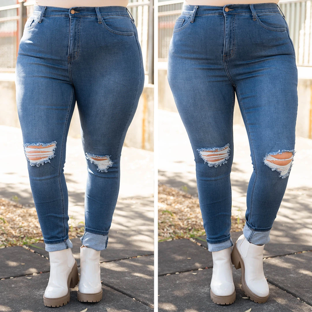 Any day in these gorgeous jeans will be a good day! These jeans have a trendy medium wash and distressed design that is so sweet! The stretchy, figure flattering fit is perfect for all day wear this season! Style these jeans with a cute top and boots for a classic chic look!