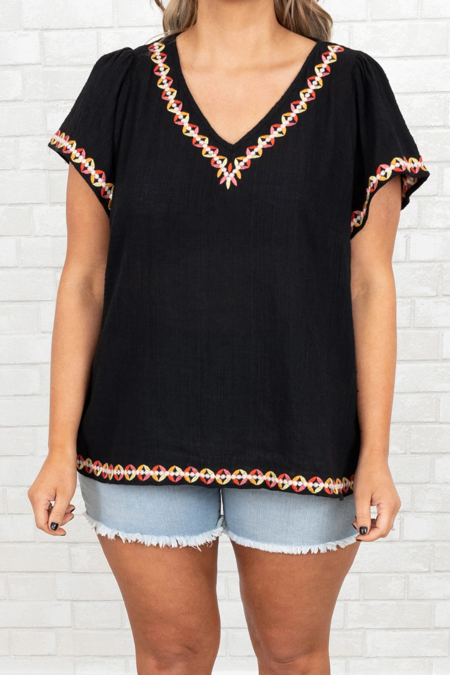 Don’t let this beauty get away from you! This top has a classic black color with a trendy embroidered design that is so chic! This top is so easy to pair with all of your fave bottoms and accessories! Simply style this top with some shorts or skinnies for a classic chic look!