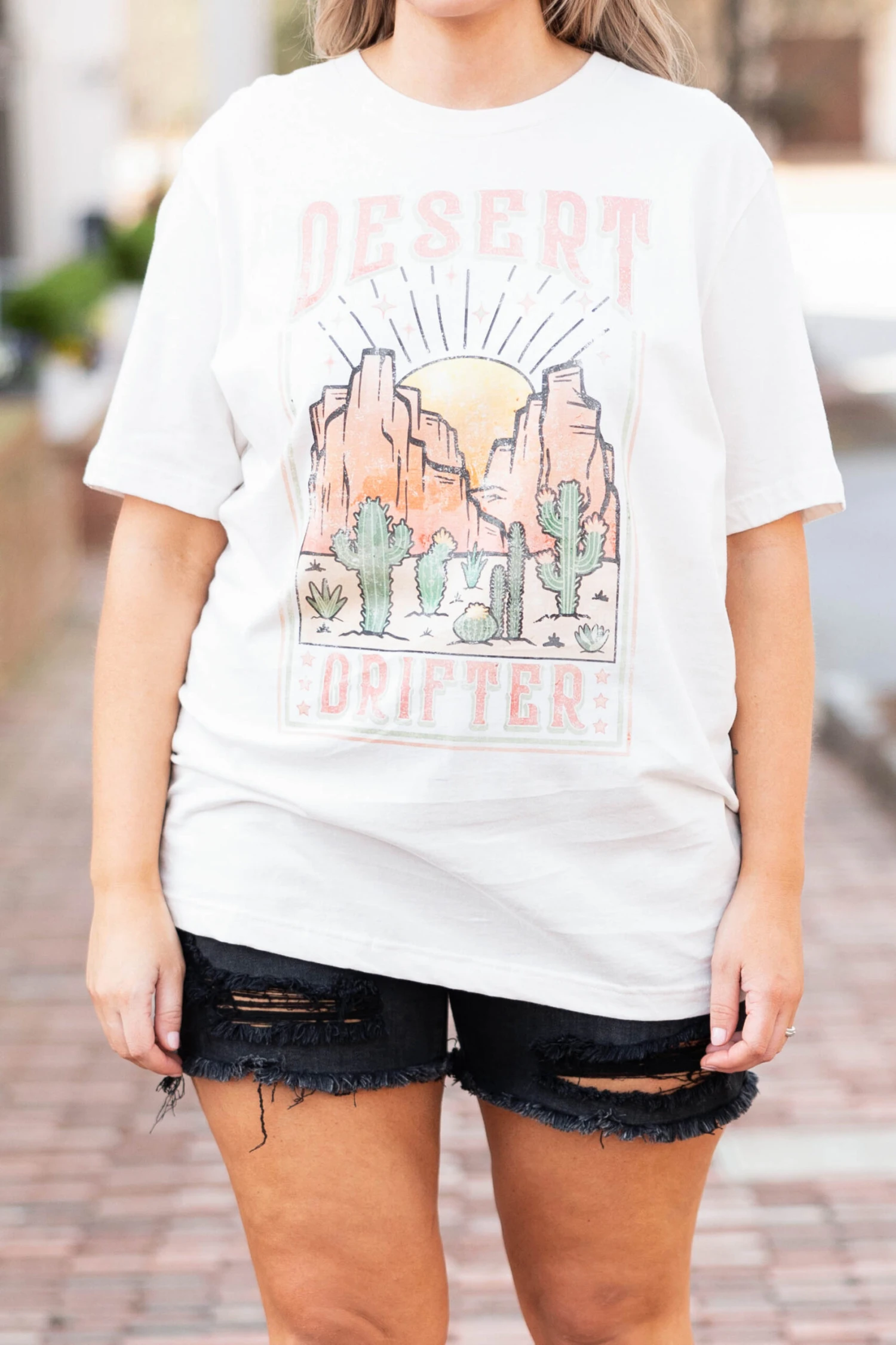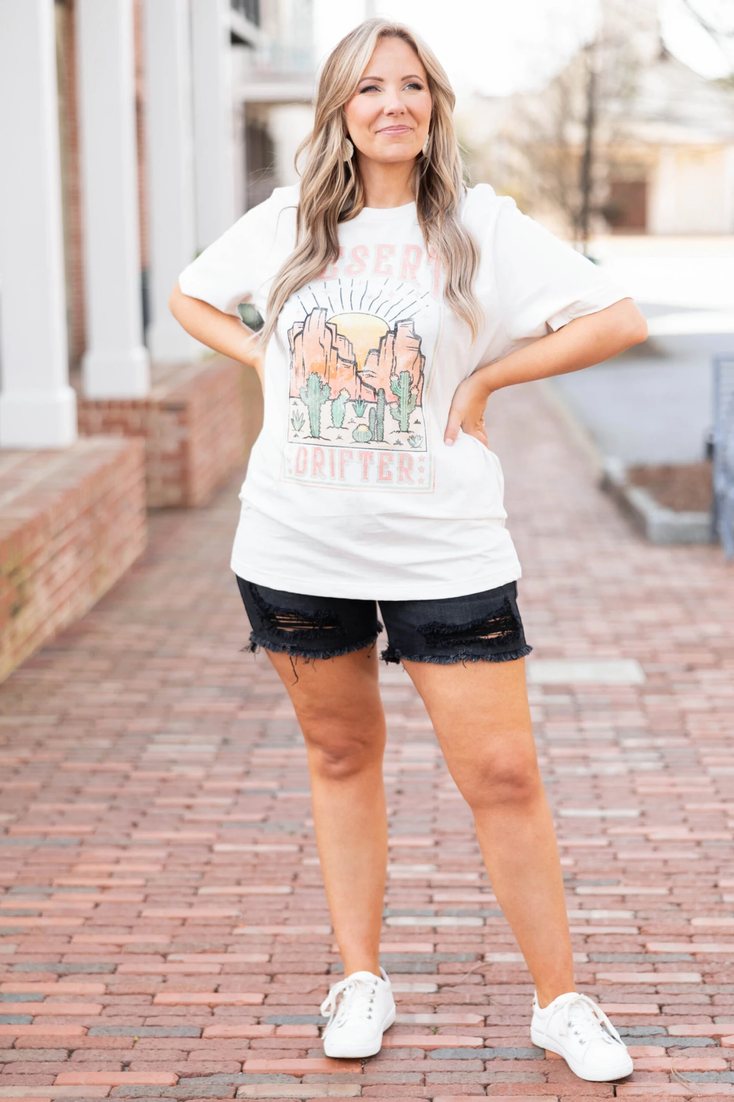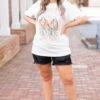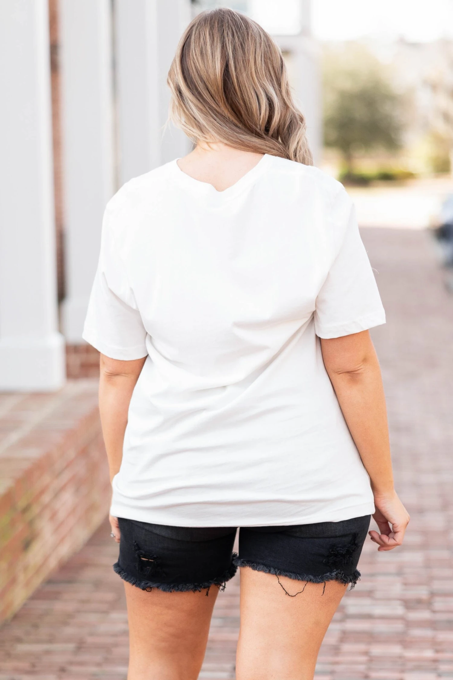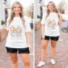 We are in love with this cutie! This adorable tee has a vintage white color with a simple, cute graphic that is so sweet! The stretchy, figure flattering fit is perfect for all day wear this season! Style this tee with shorts or skinnies for a casual chic look!