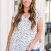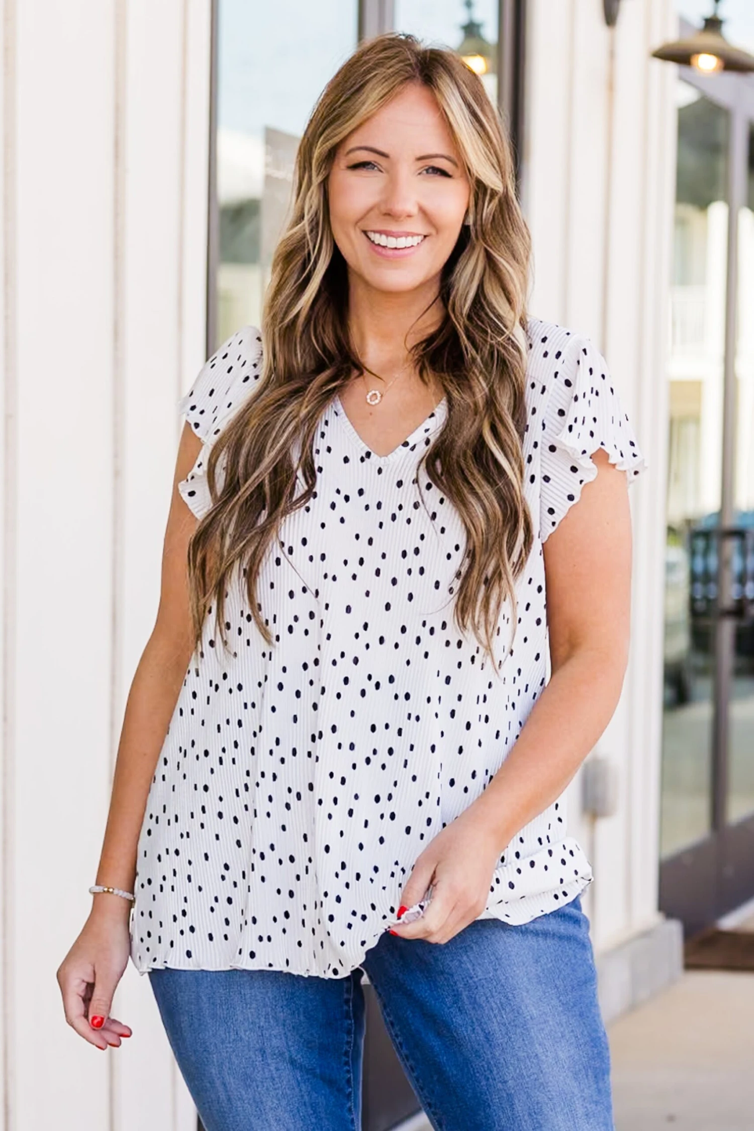 We simply adore this top! It features an elegant accordion style and delicate flutter sleeves! The neutral color and playful polka dot pattern add versatile style to any outfit! Elevate your wardrobe with this expertly crafted top!