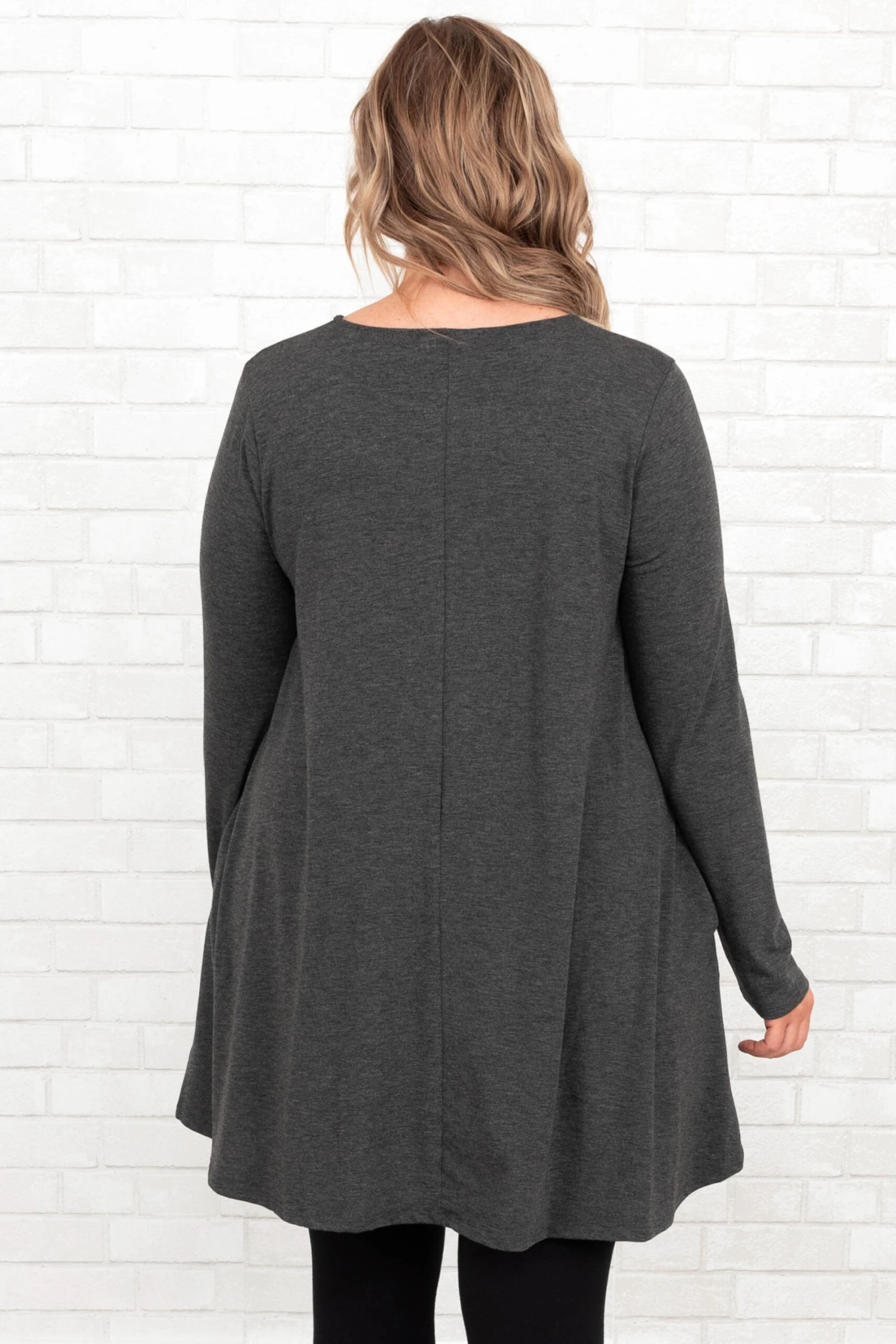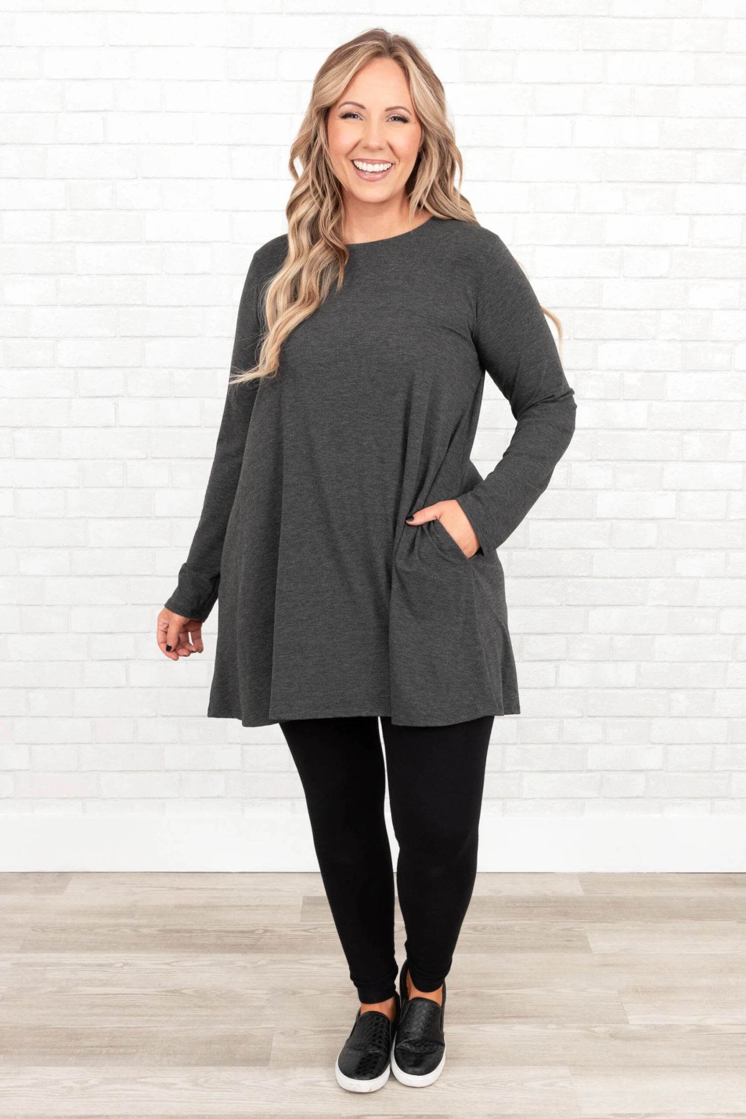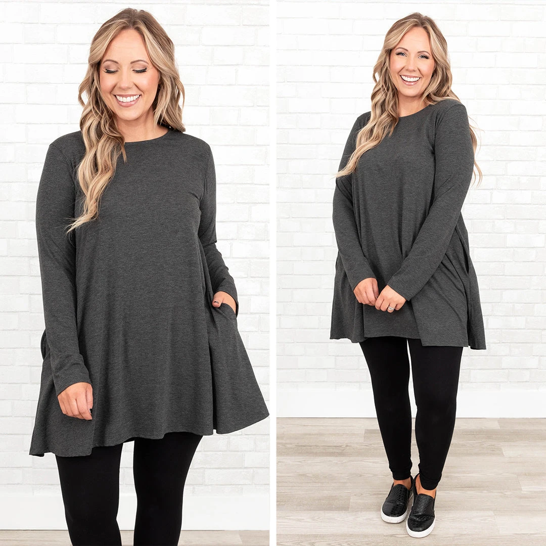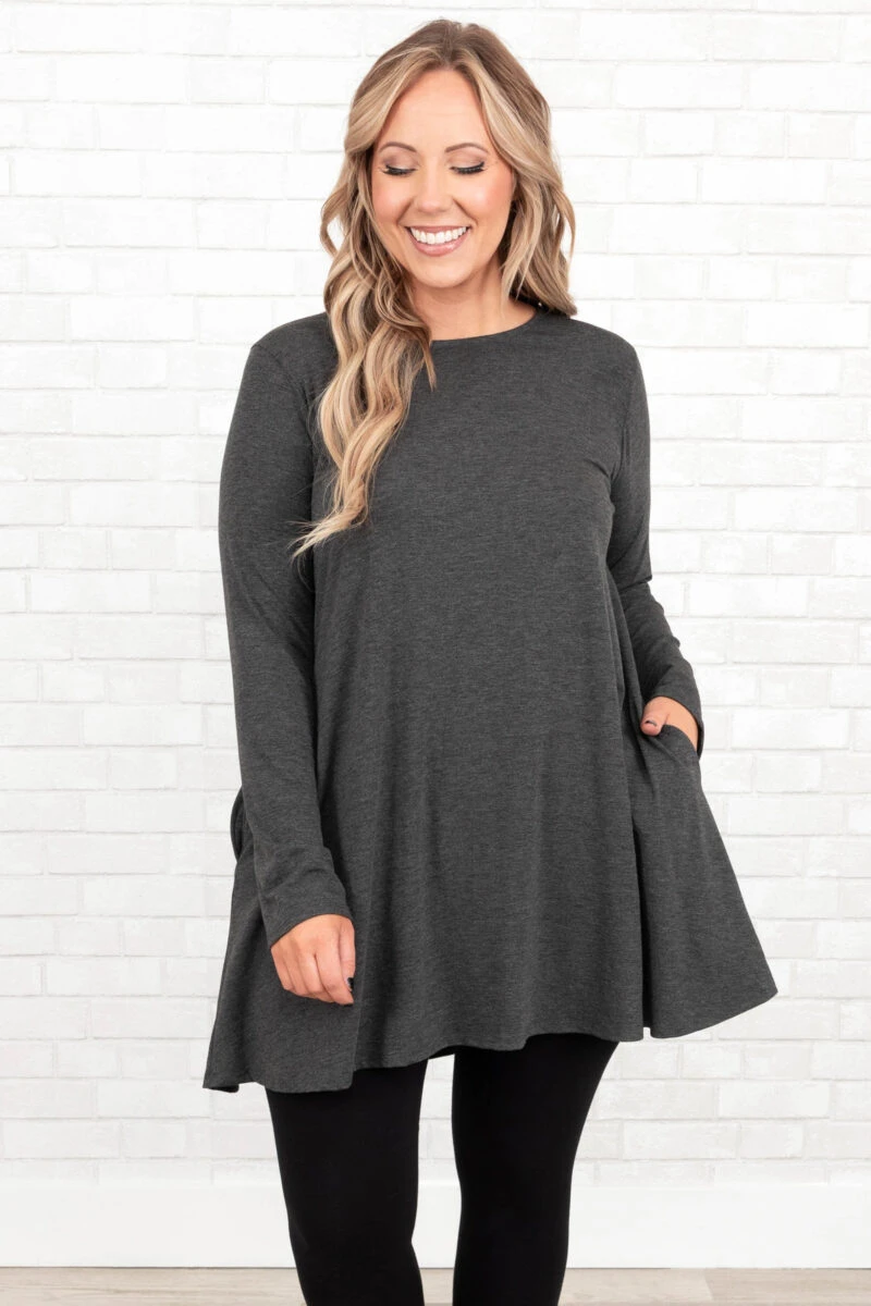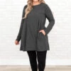 As long as you’re here you might as well grab this cutie! This tunic has a gorgeous charcoal color with a comfy, stretchy fit that is so easy to pair with all of your faves! It’s figure flattering and flowy great for all day wear! Style this top with skinnies or leggings for a chic casual look!