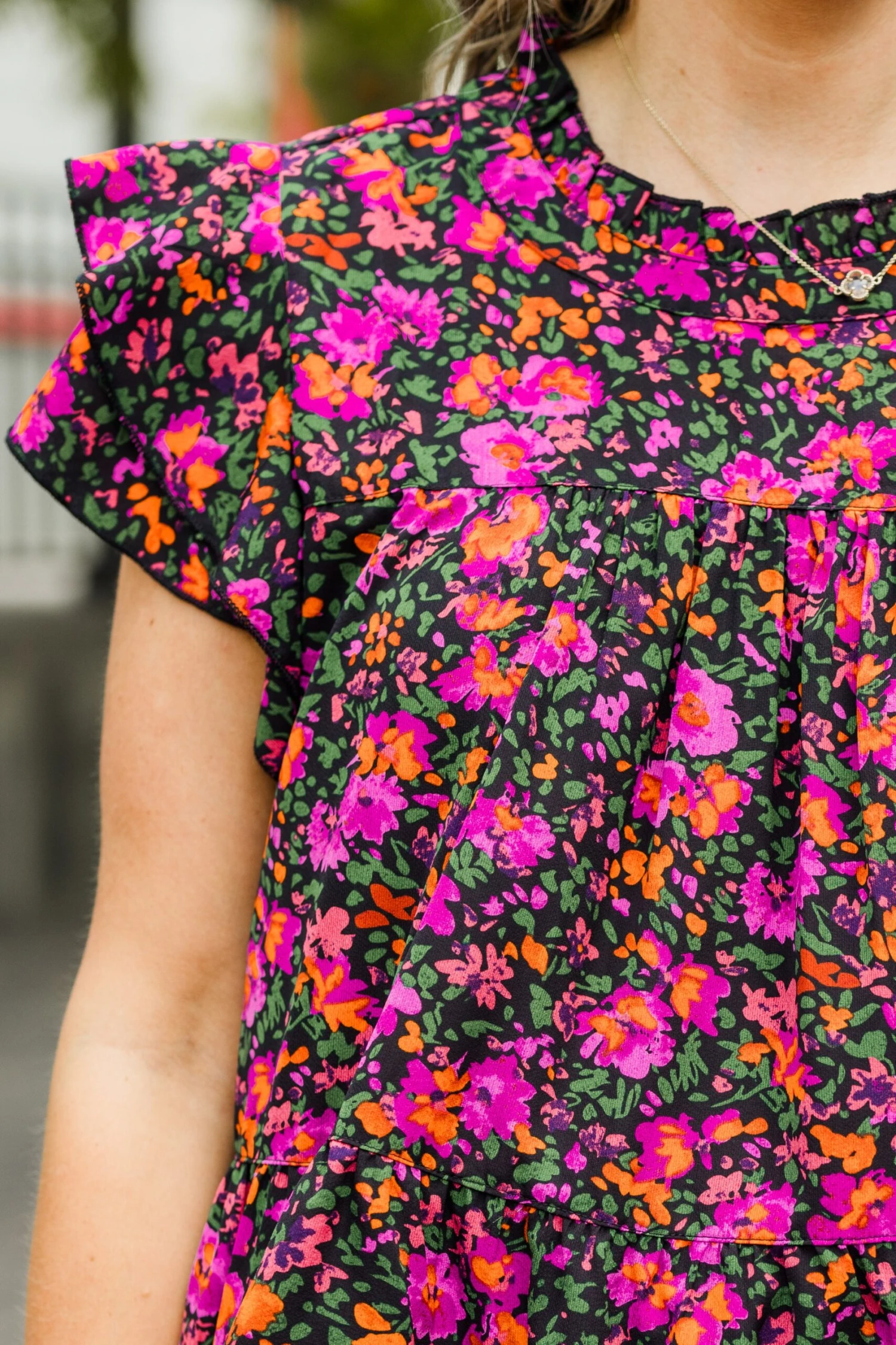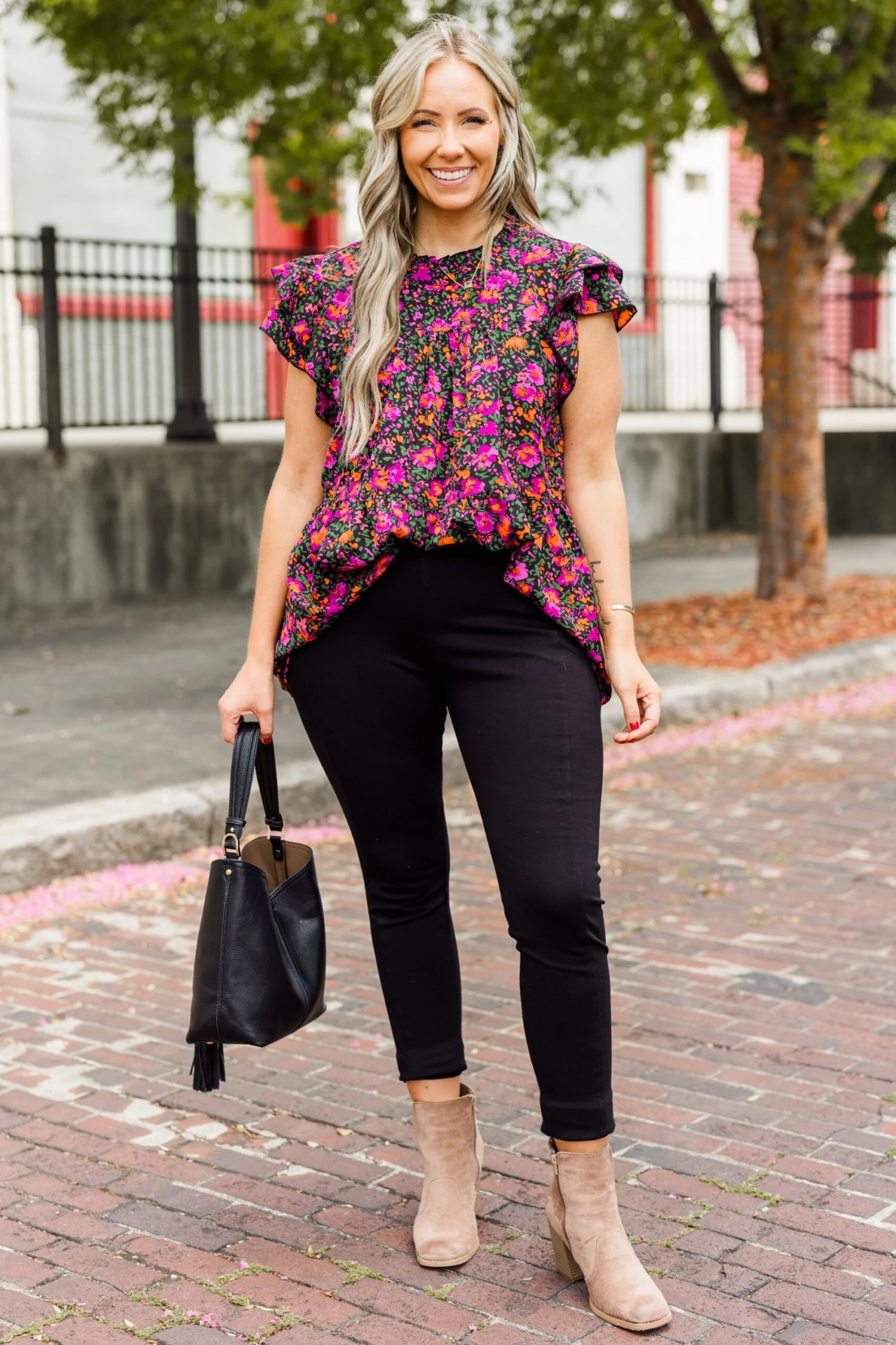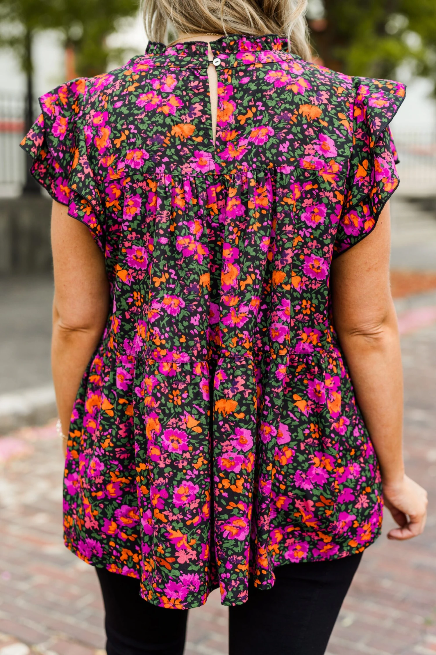 Grab this beauty right now before it’s too late! Featuring a stunning floral pattern and a lovely black-purple color, this top is perfect for any occasion! Its flutter sleeves add a touch of femininity, making it a versatile piece for both the office and a night out! Elevate your wardrobe with this must-have top!