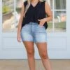 Stay on-trend with these fashionable shorts! The frayed hemline and flirty fit offer a flattering look, while the stretchy material provides comfort! The trendy medium wash is the perfect way to make a statement this season!