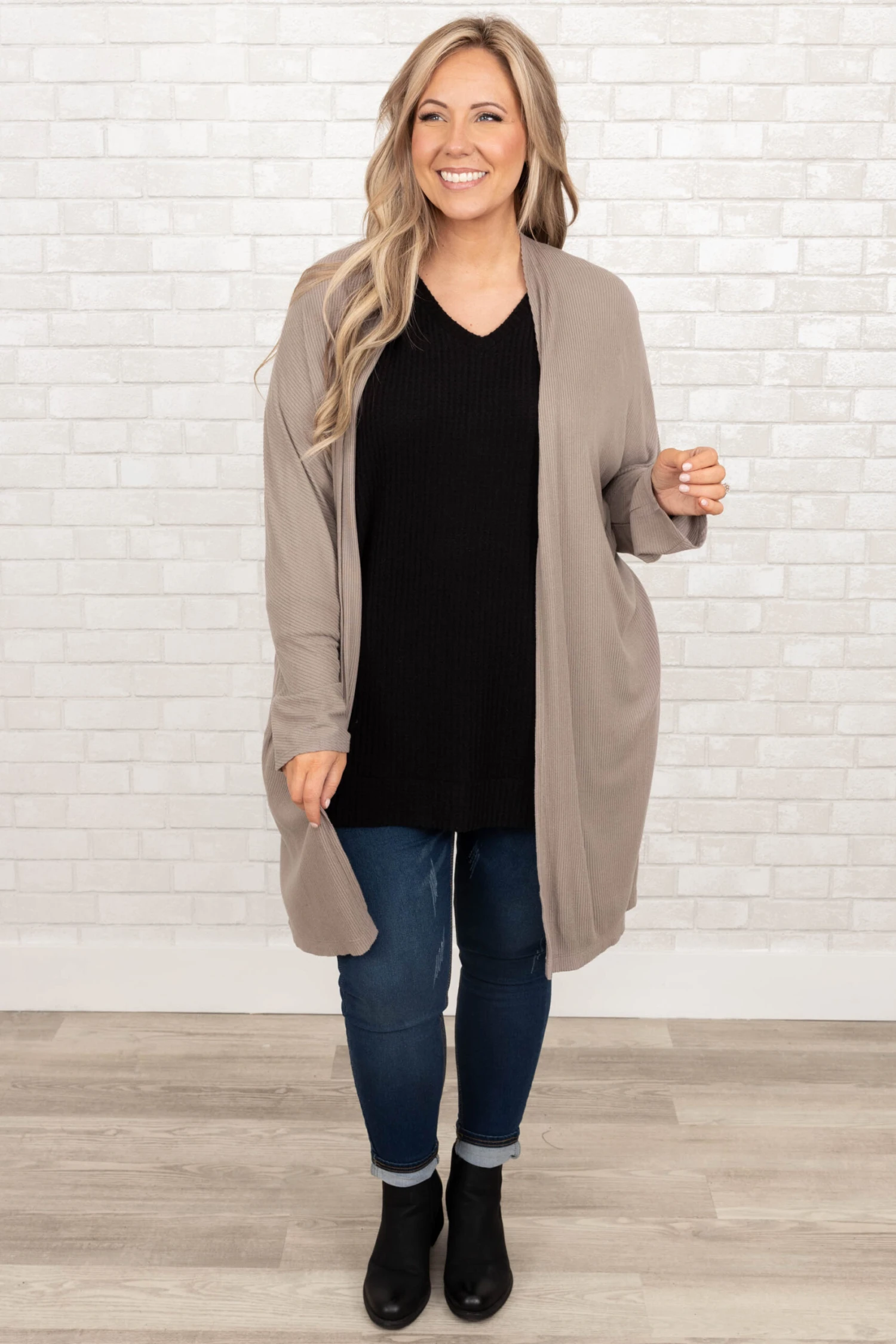 You asked and we delivered! This cardigan has a lovely light mocha color and lightweight feel great for pairing with all your favorite outfits this season! Simply style this cutie with a cute top and skinnies for a casual, chic look!