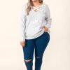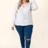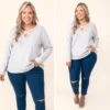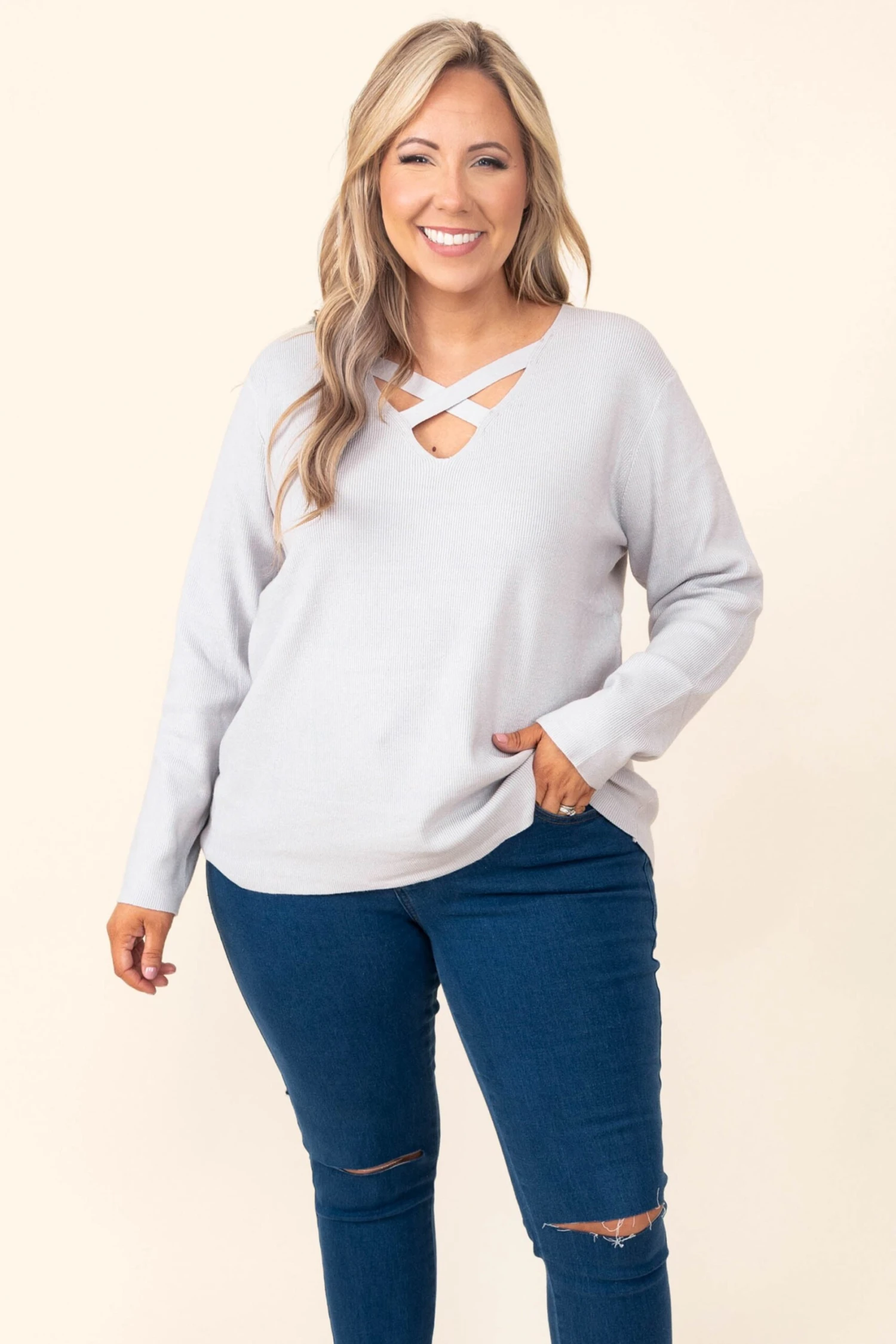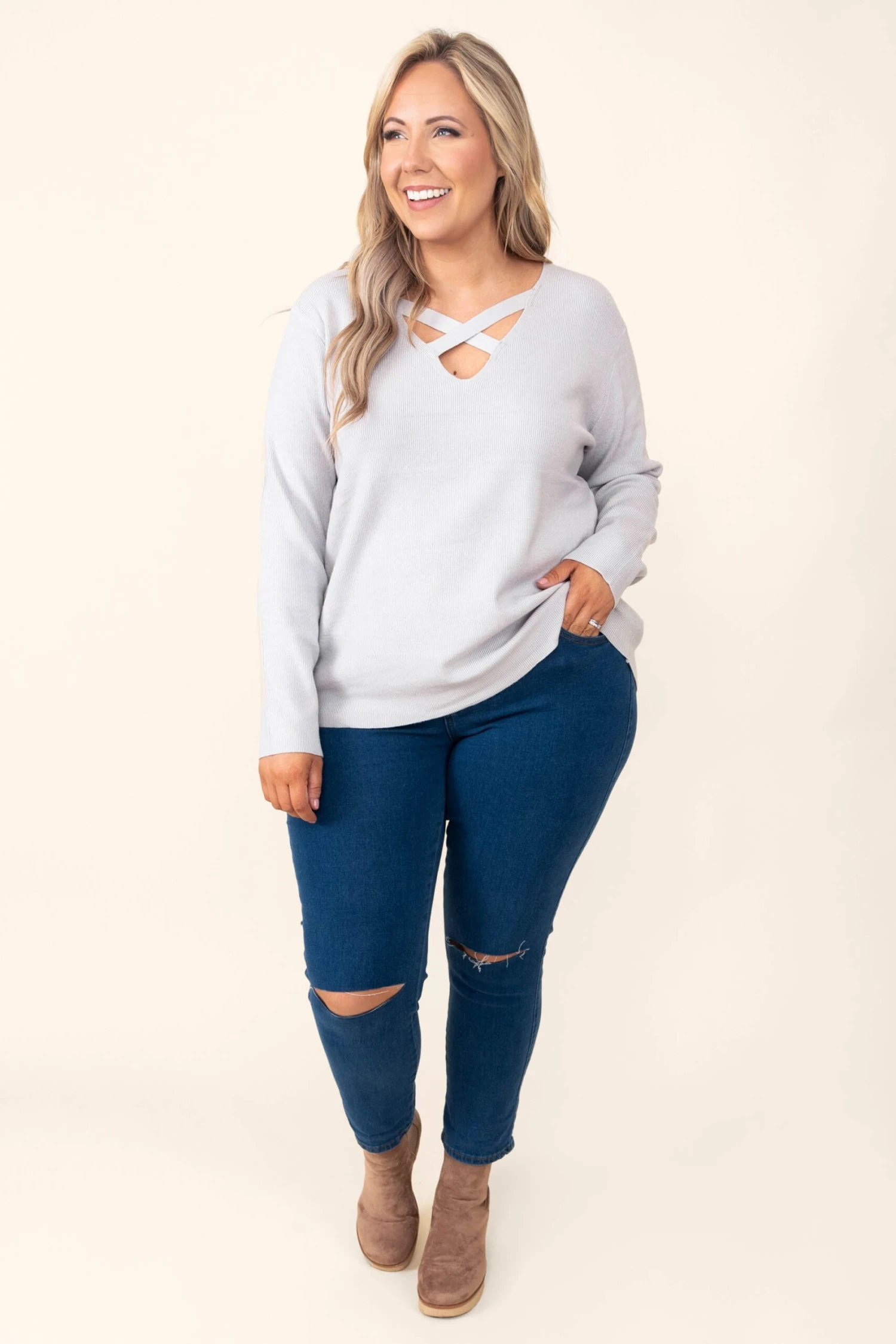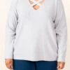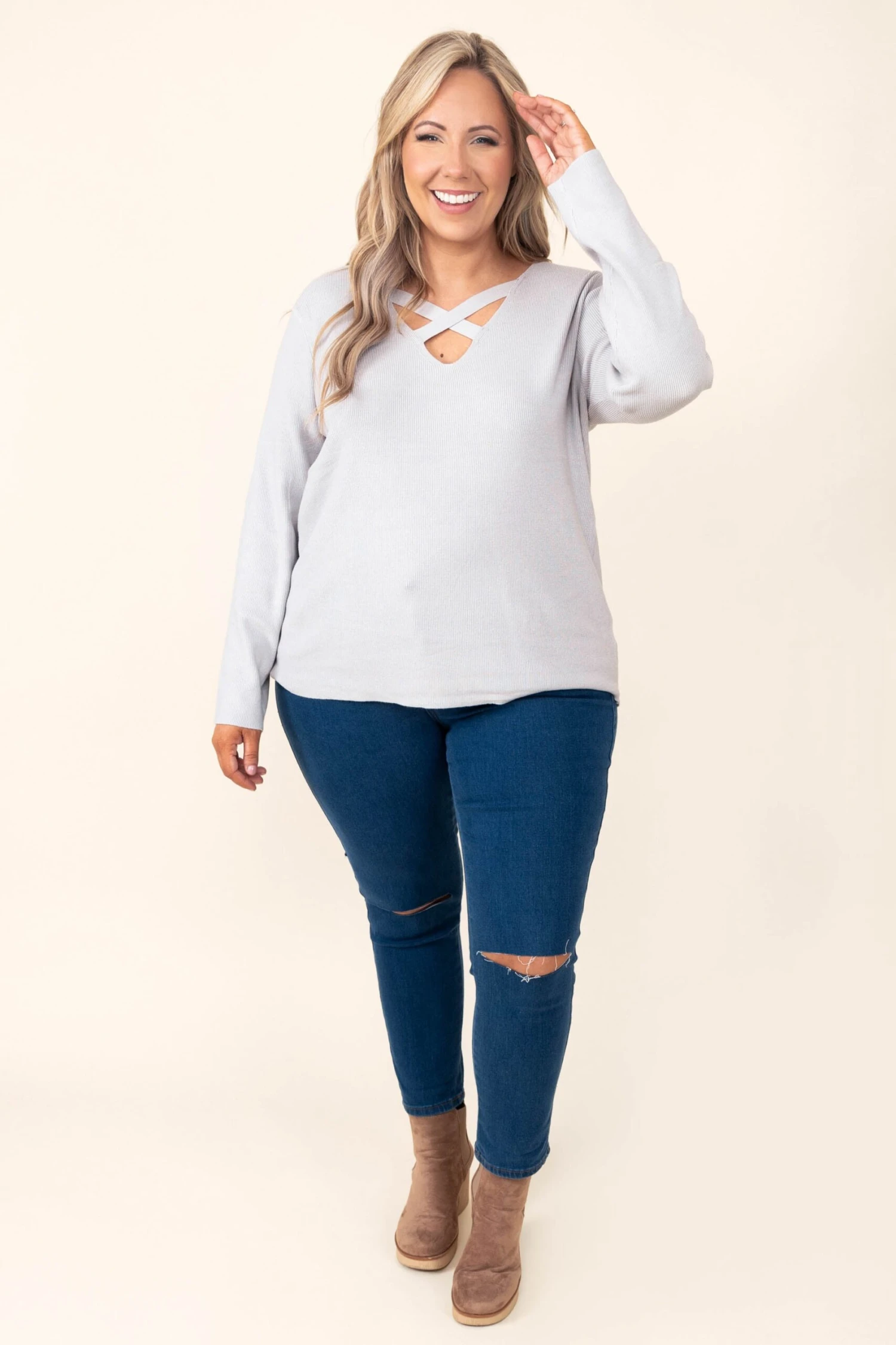 Walk through the crowd with grace in this gorgeous top! This top has a soft gray color with a flirty crisscross neckline! The stretchy, figure flattering fit is perfect for all day wear! Style this top with some skinnies or leggings for a casual chic look!