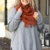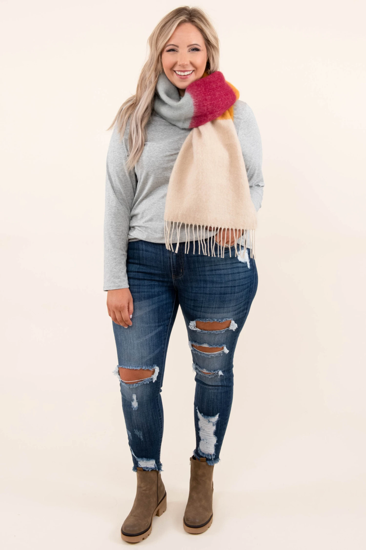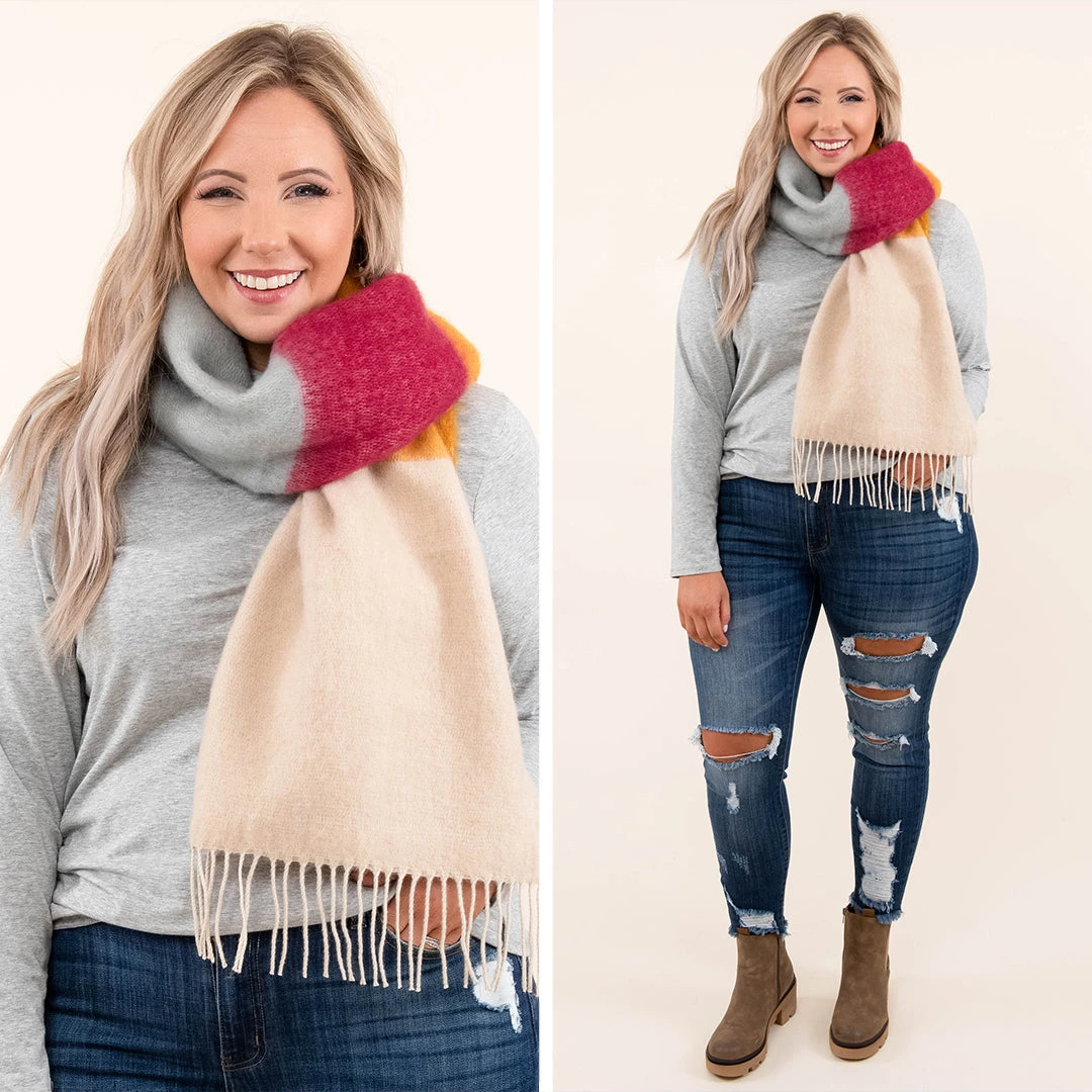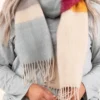 You’ll want to wear this colorblock scarf back to back! It’s the perfect accessory for the cooler weather! Wear it with your favorite sweater and jeans for the perfect look!