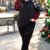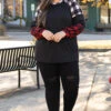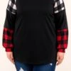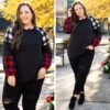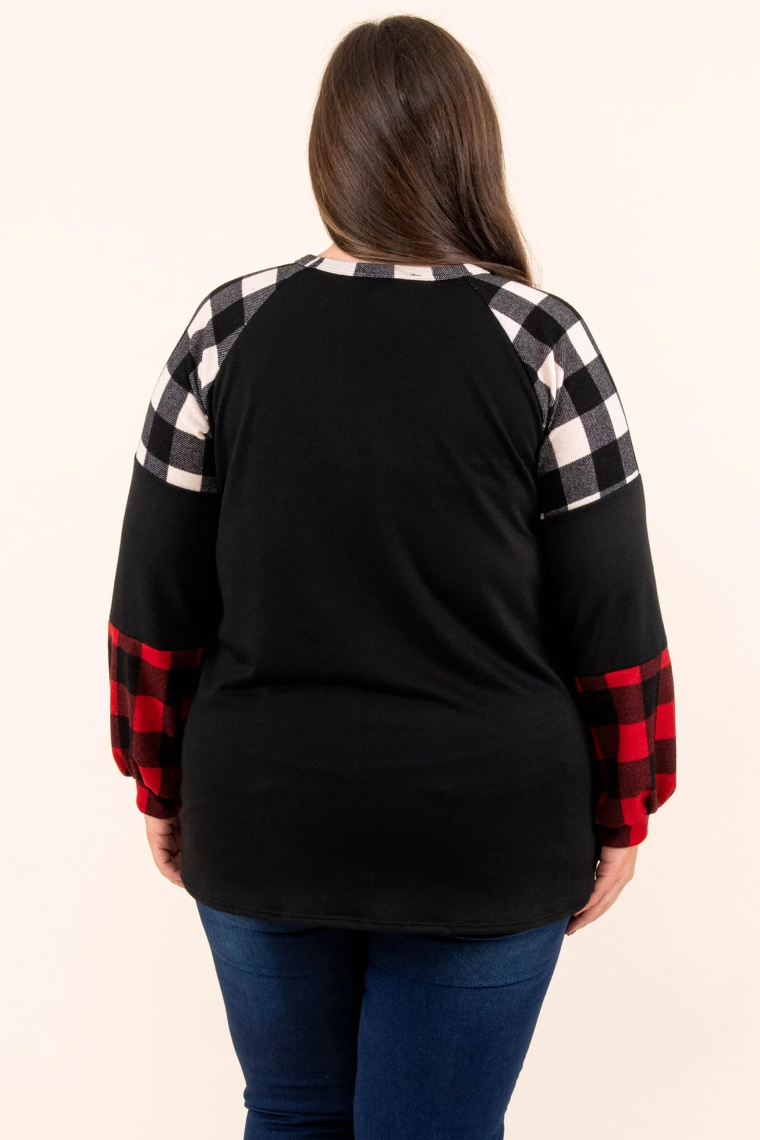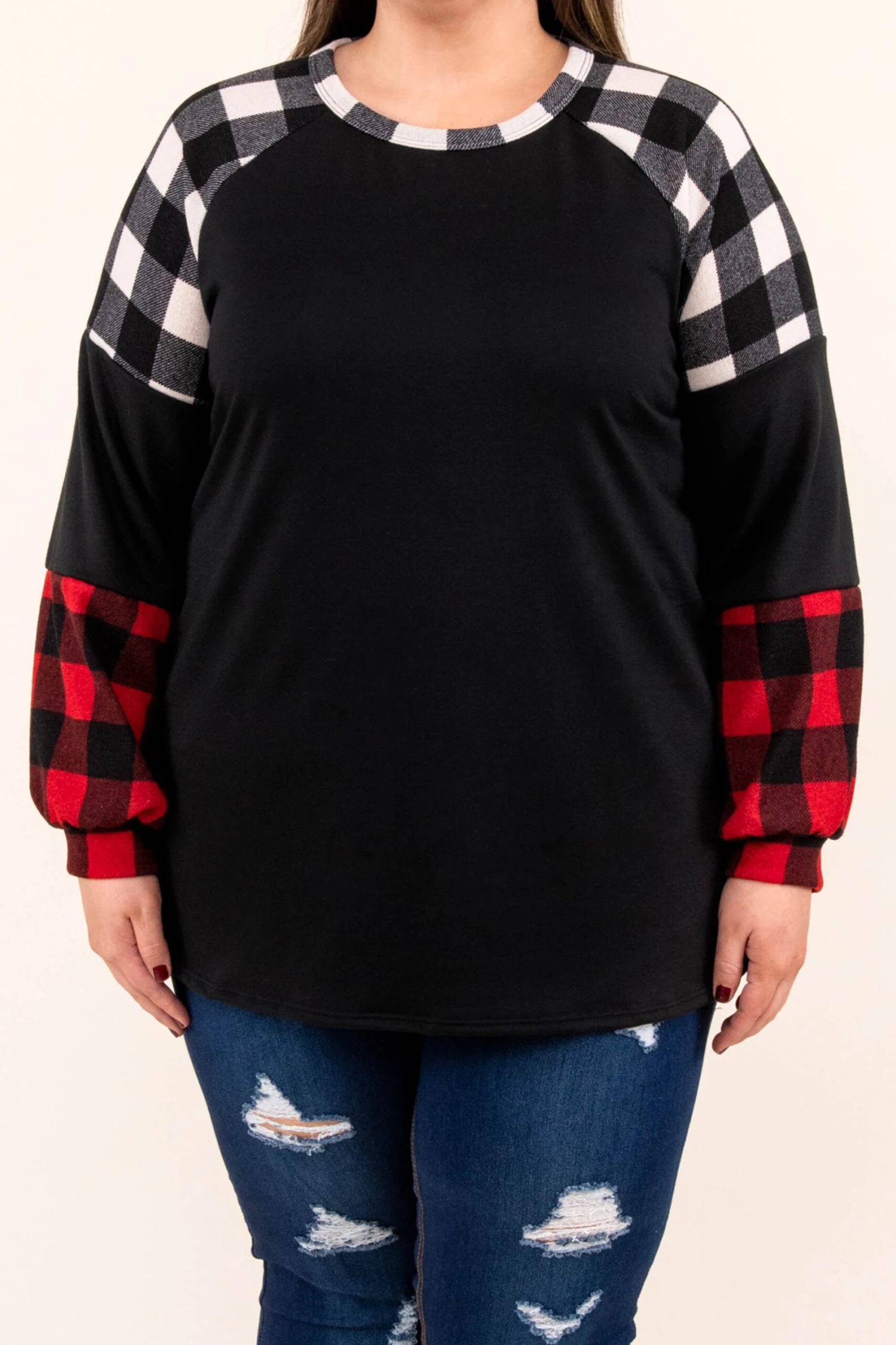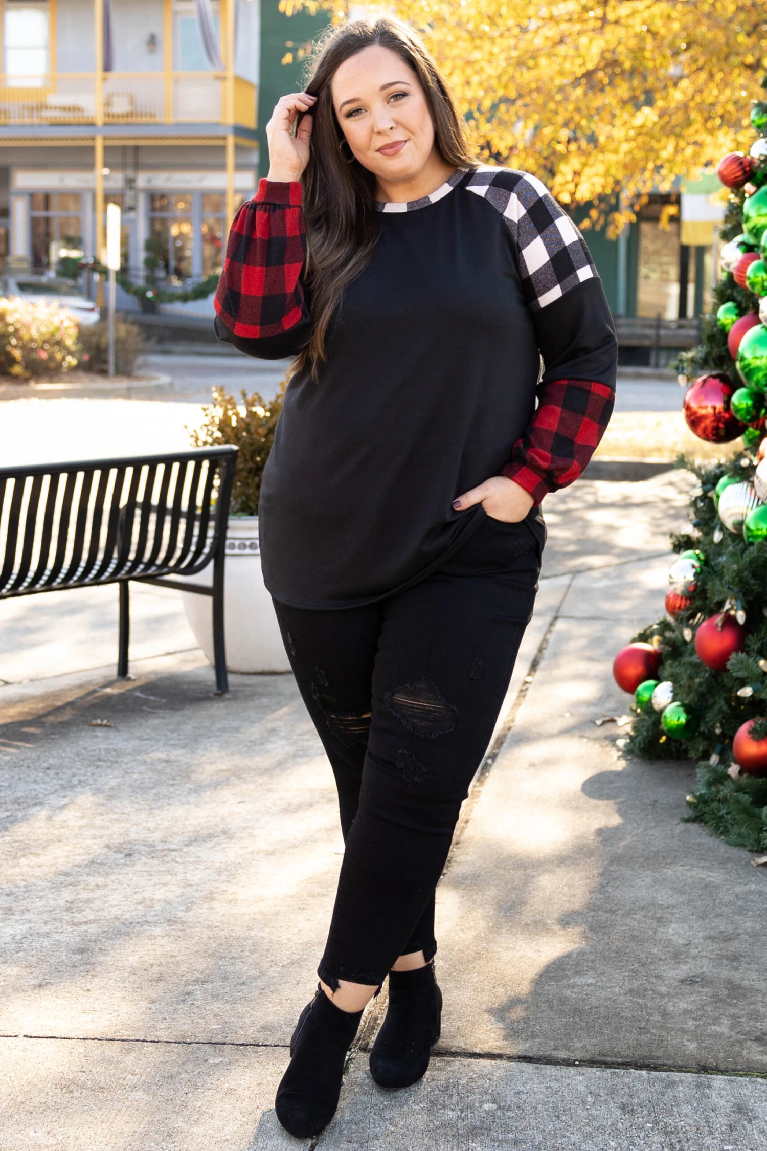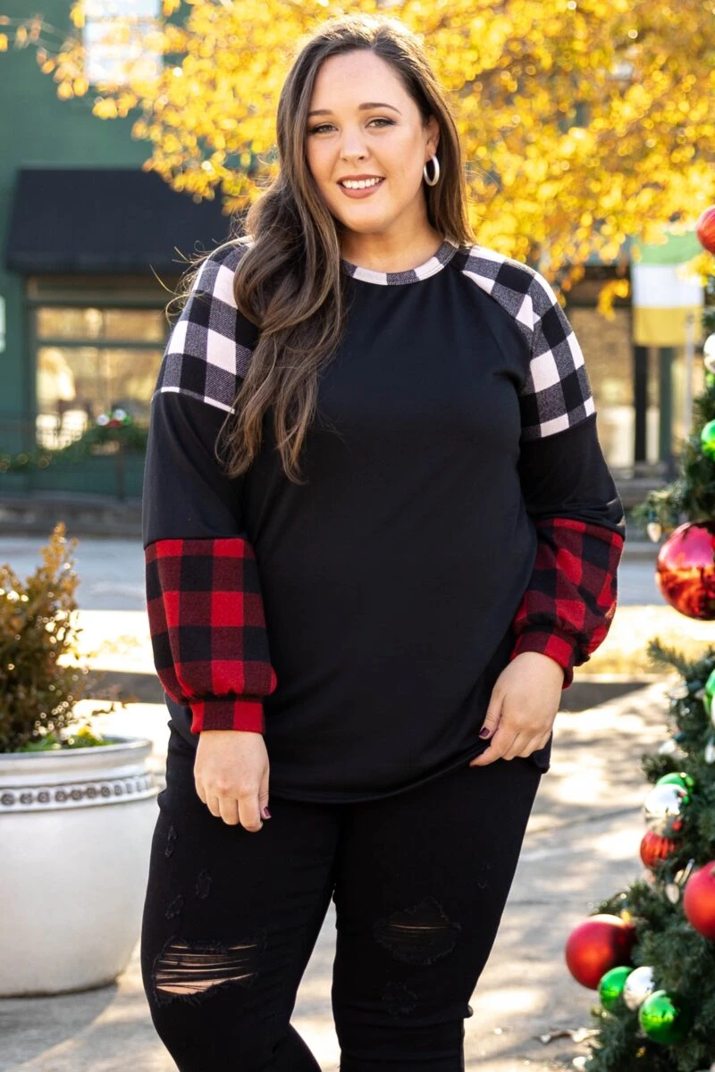 We’re so glad you made time to see this top! It has a classic black color with pops of plaid on the shoulders and sleeves. Style this like our girl, Anna Rachel, with black jeans and booties!
