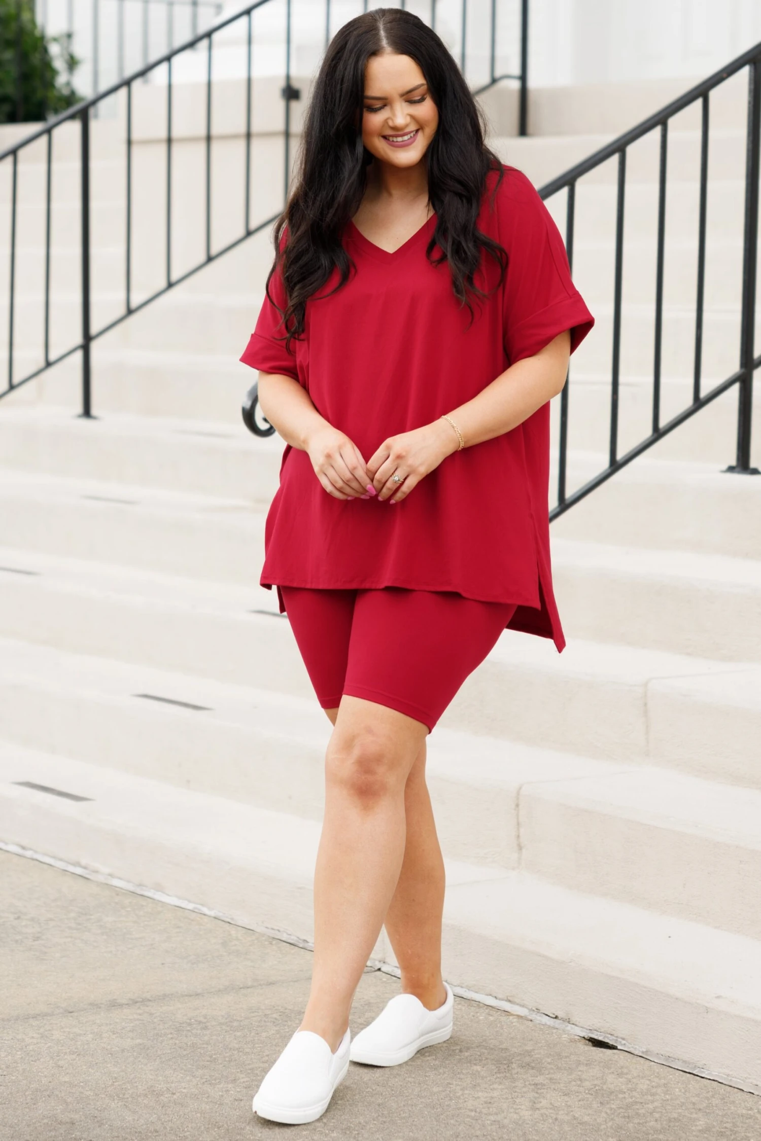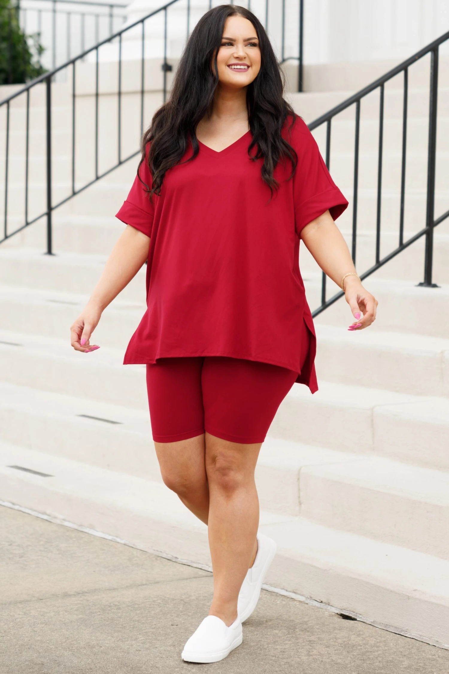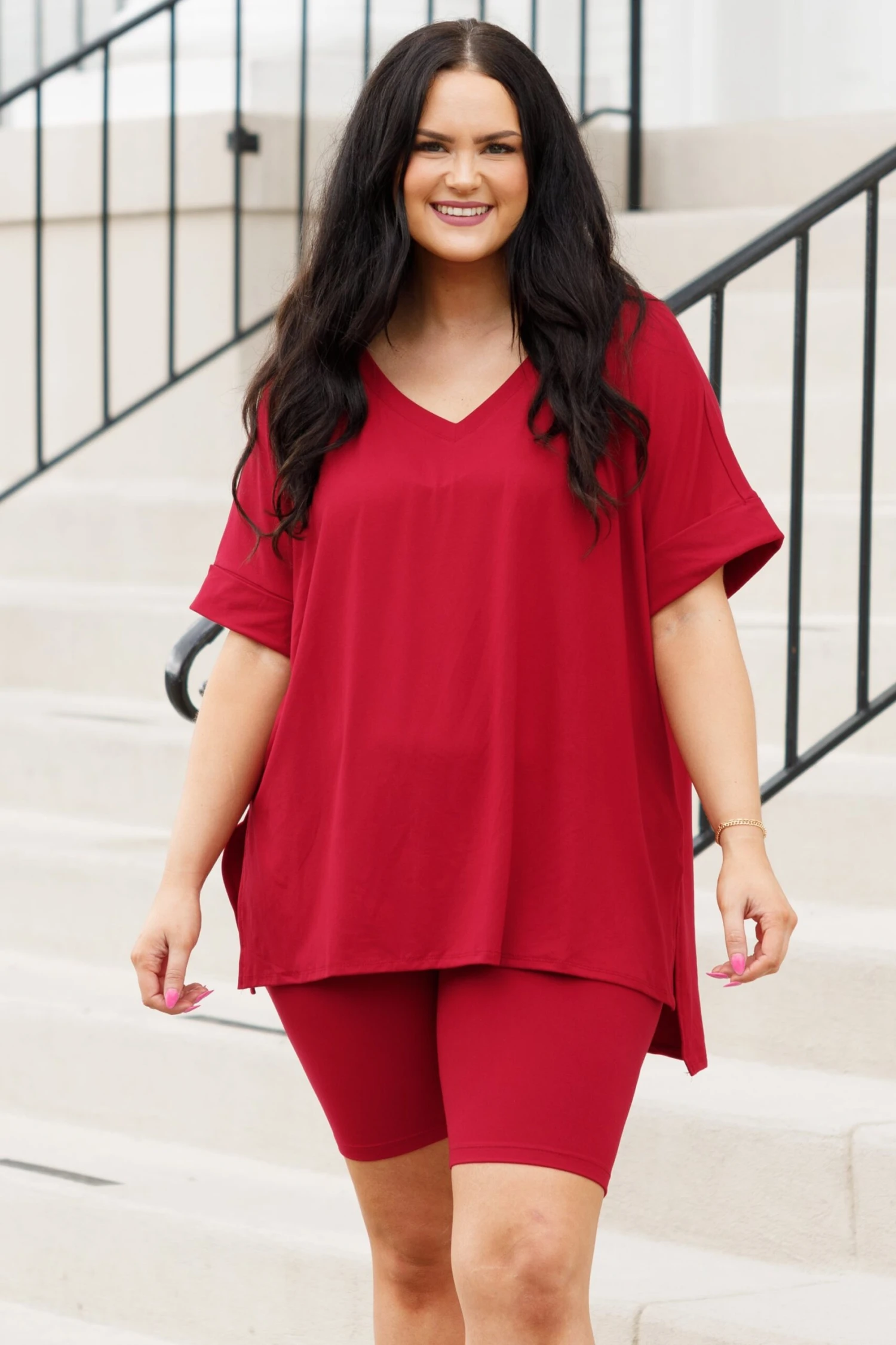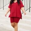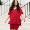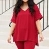 This gorgeous set is definitely a necessity! The pretty burgundy color is just in time for the season and the comfy fit is perfect for all day wear! The stretchy, figure flattering fit of the top and bottom make this set a must-have! Pair this set with some cute accessories and sandals or sneakers for an everyday chic look!