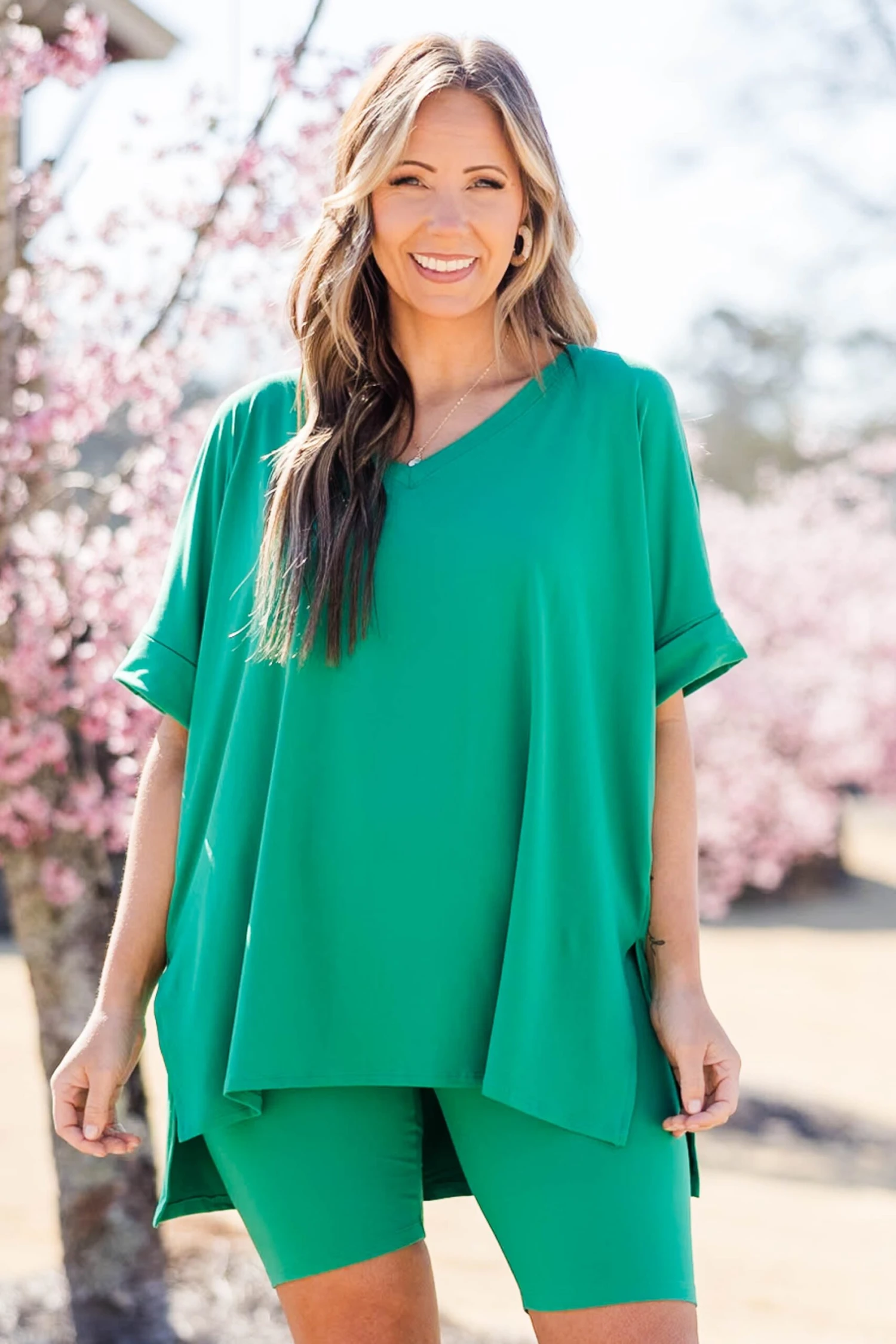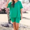 This gorgeous set is definitely a necessity! The bold kelly green color is just what you need for the season and the comfy fit is perfect for all day wear! The stretchy, figure flattering fit of the top and bottom make this set a must-have! Pair this set with some cute accessories and sandals or sneakers for an everyday chic look!