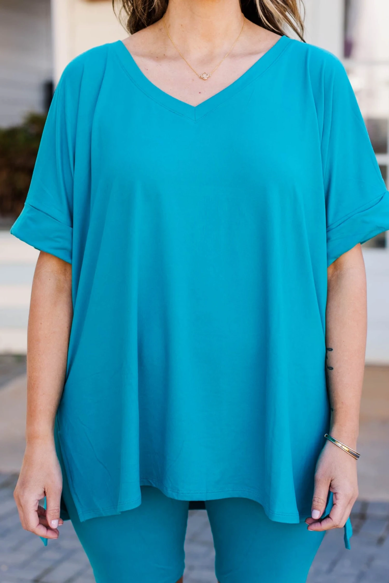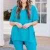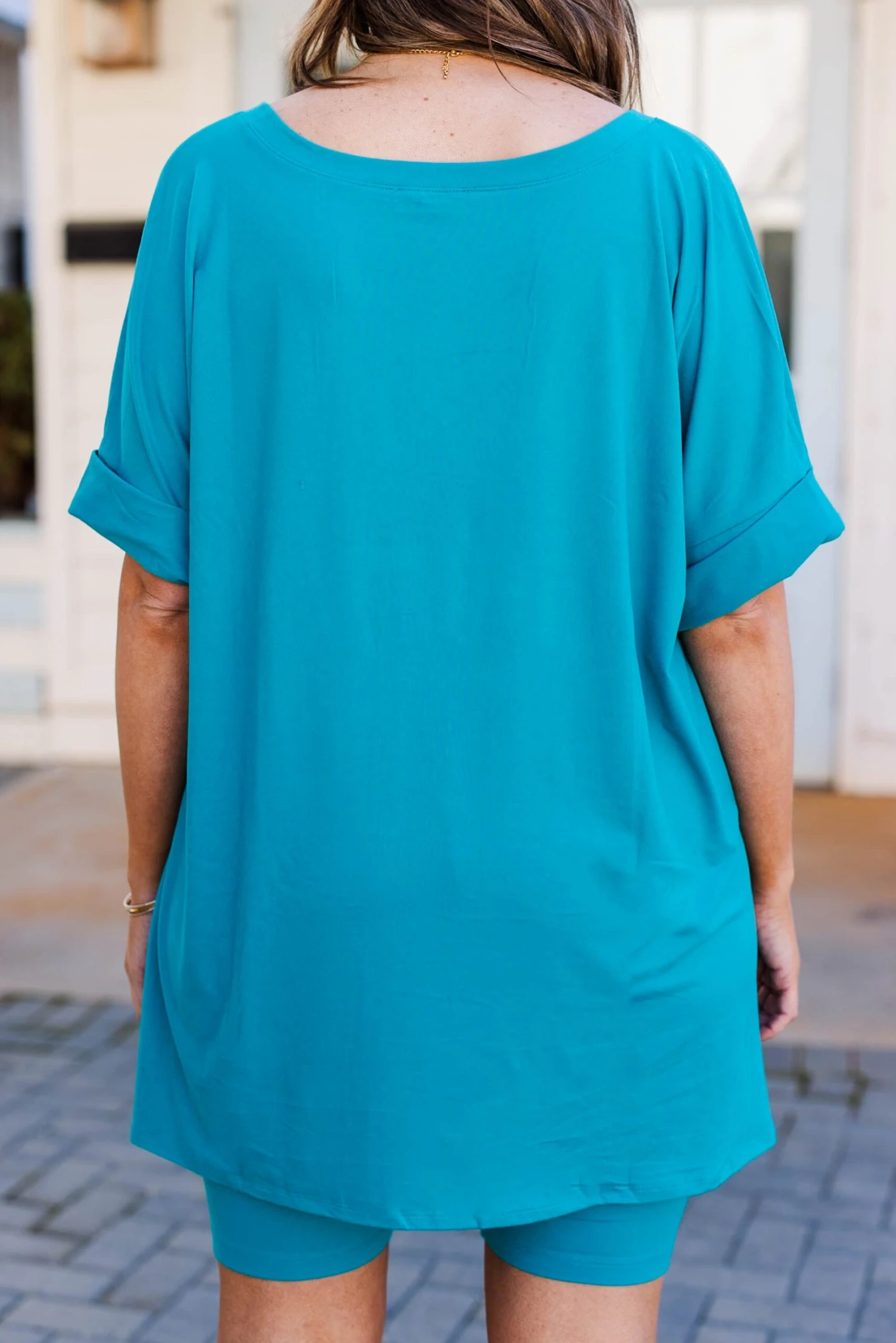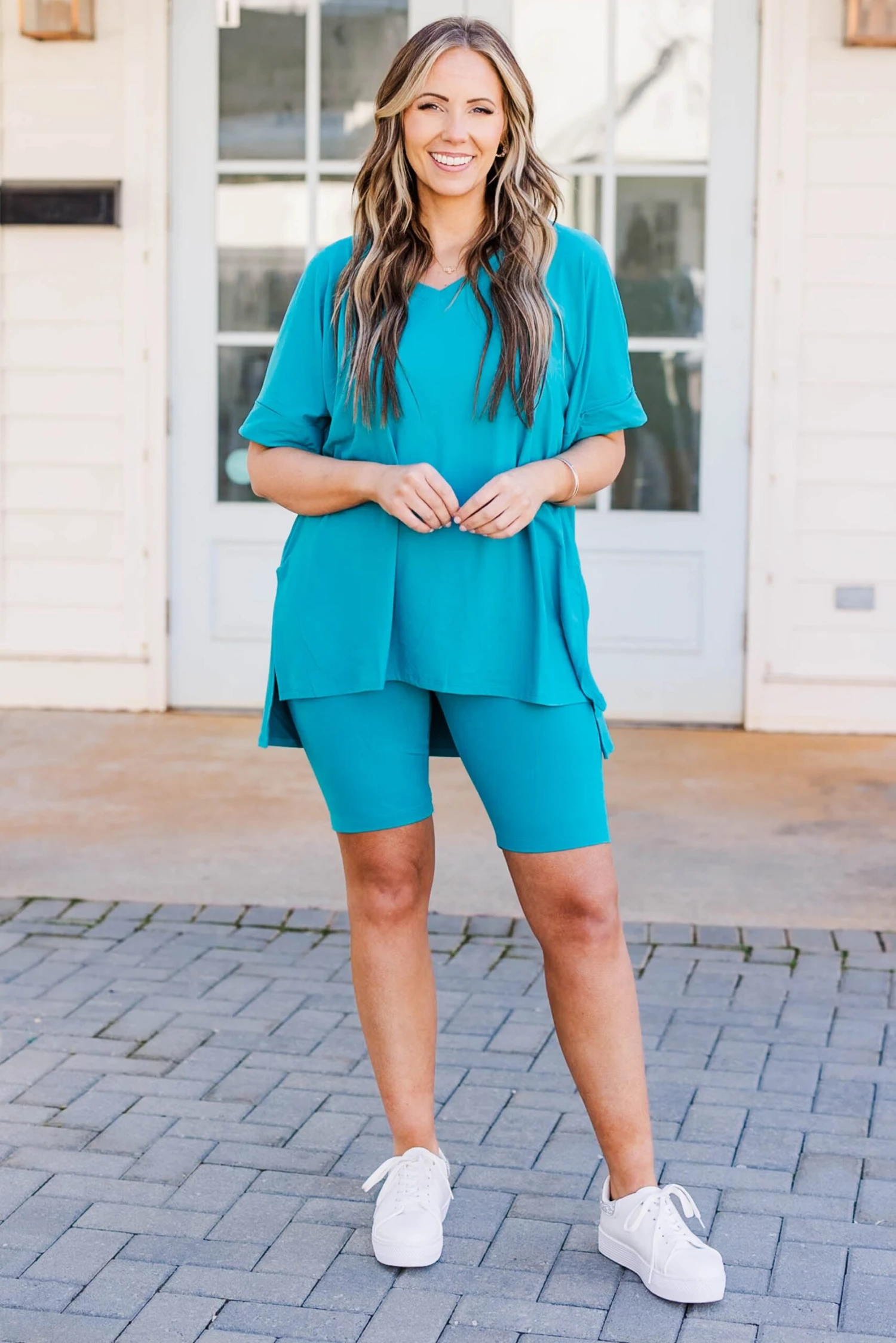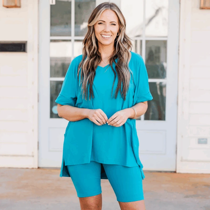 This gorgeous set is definitely a necessity! The light teal color is just what you need for the season and the comfy fit is perfect for all day wear! The stretchy, figure flattering fit of the top and bottom make this set a must-have! Pair this set with some cute accessories and sandals or sneakers for an everyday chic look!