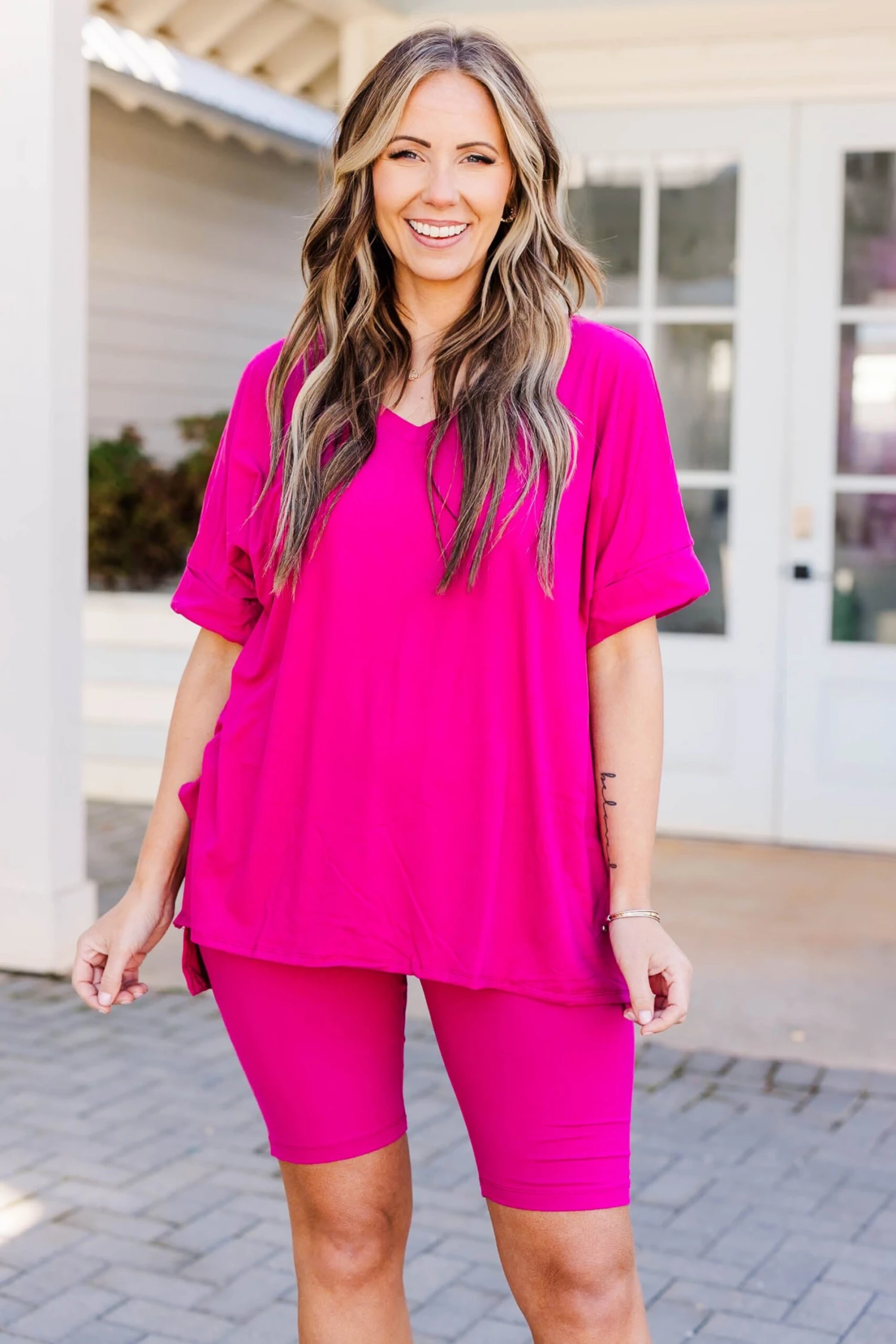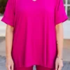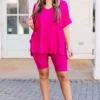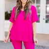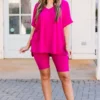 This gorgeous set is definitely a necessity! The bold magenta color is just what you need for the season and the comfy fit is perfect for all day wear! The stretchy, figure flattering fit of the top and bottom make this set a must-have! Pair this set with some cute accessories and sandals or sneakers for an everyday chic look!