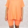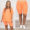This gorgeous set is definitely a necessity! The bold neon coral color is just in time for the season and the comfy fit is perfect for all day wear! The stretchy, figure flattering fit of the top and bottom make this set a must-have! Pair this set with some cute accessories and sandals or sneakers for an everyday chic look!