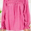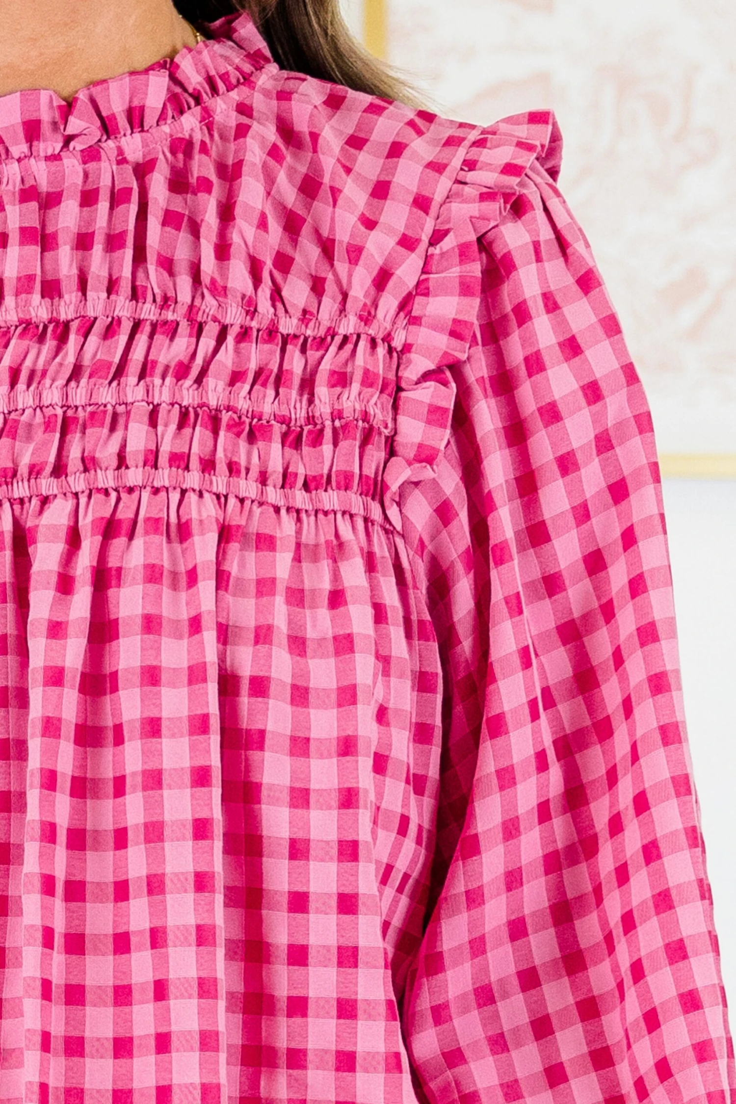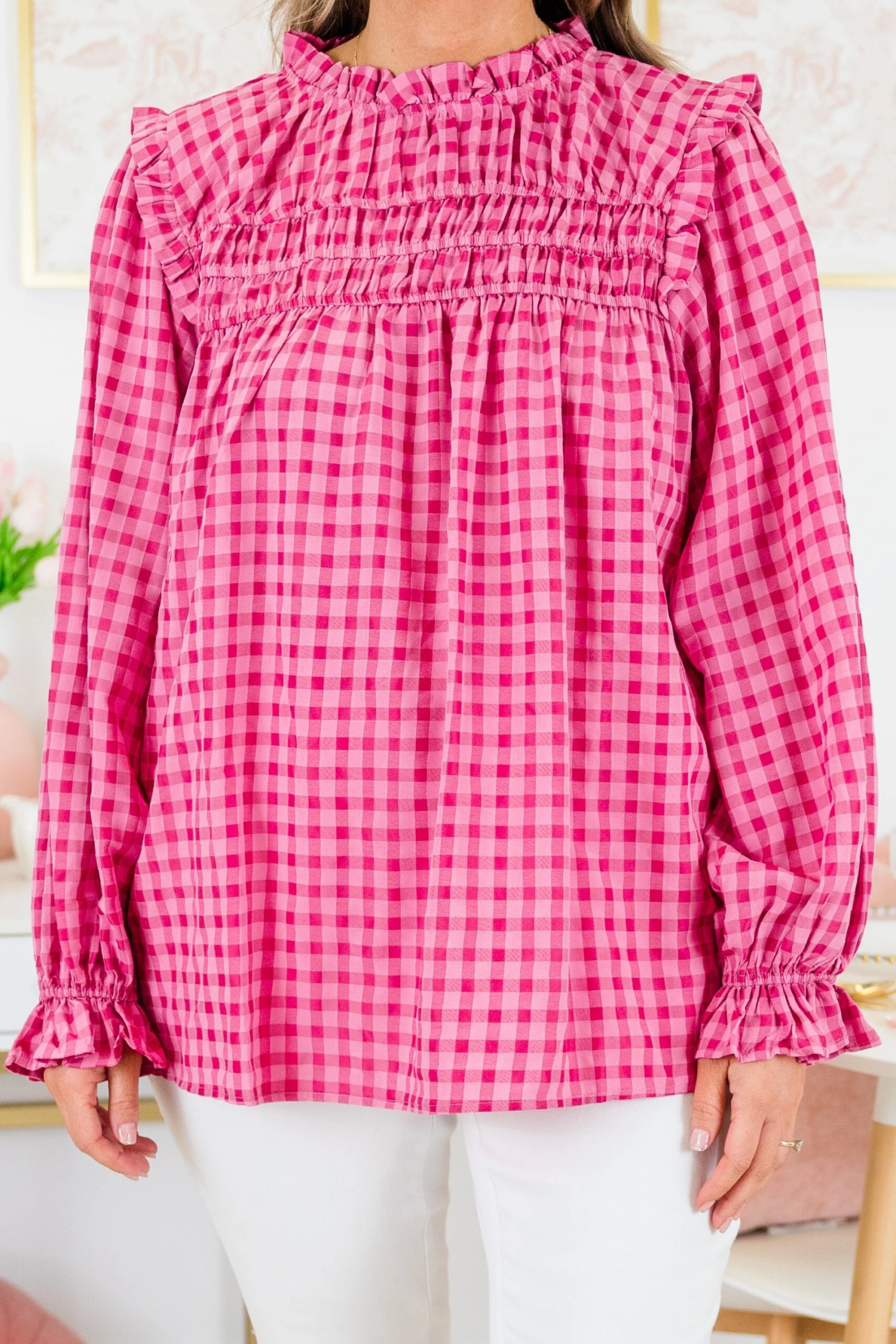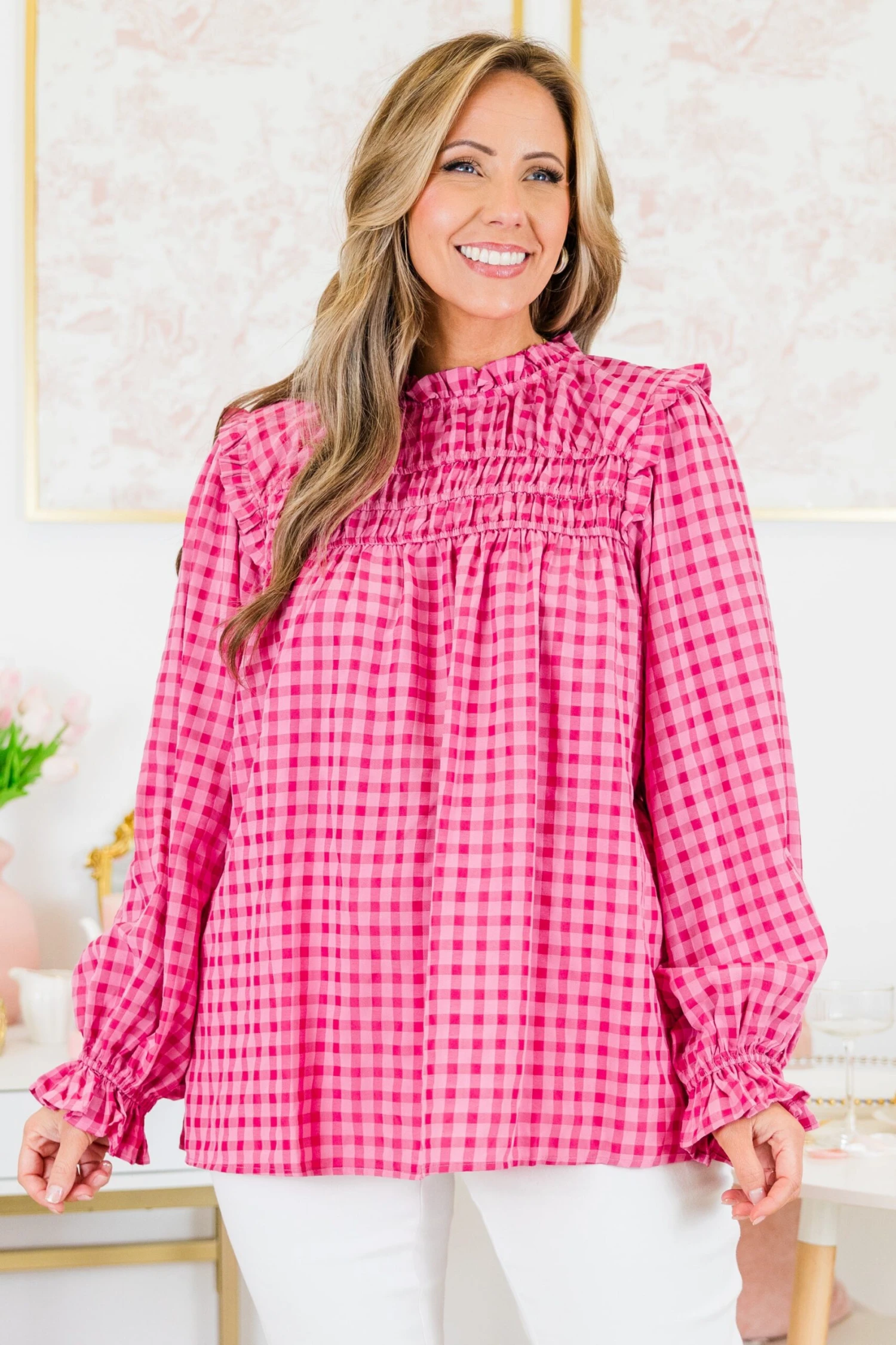 This top is EVERYTHING!  Its ruffle detailing adds a touch of femininity, while its bold pink-fuchsia color pairs beautifully with skinnies and booties for a classic, chic look! Elevate your wardrobe with this must-have top!