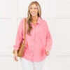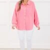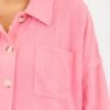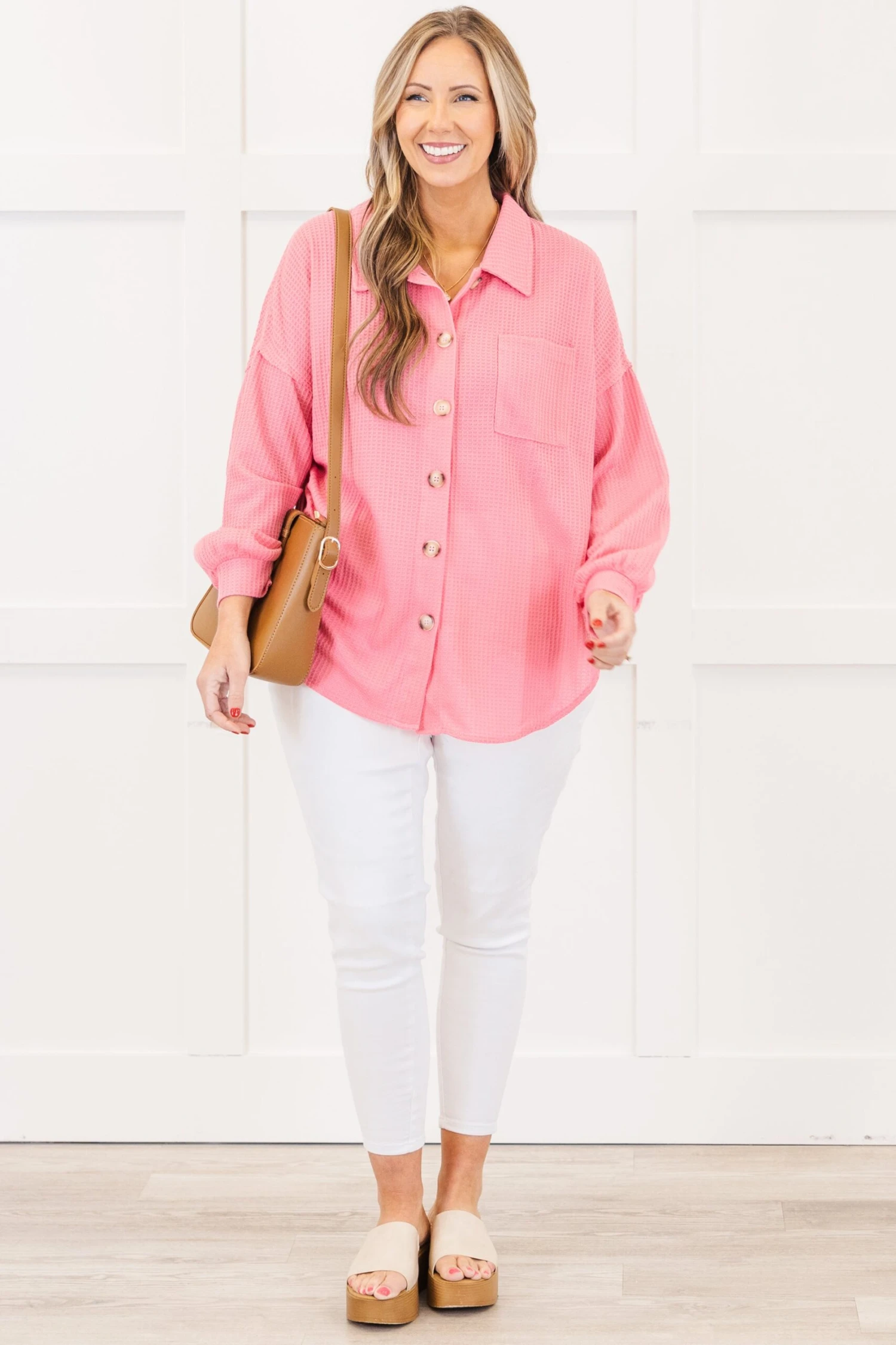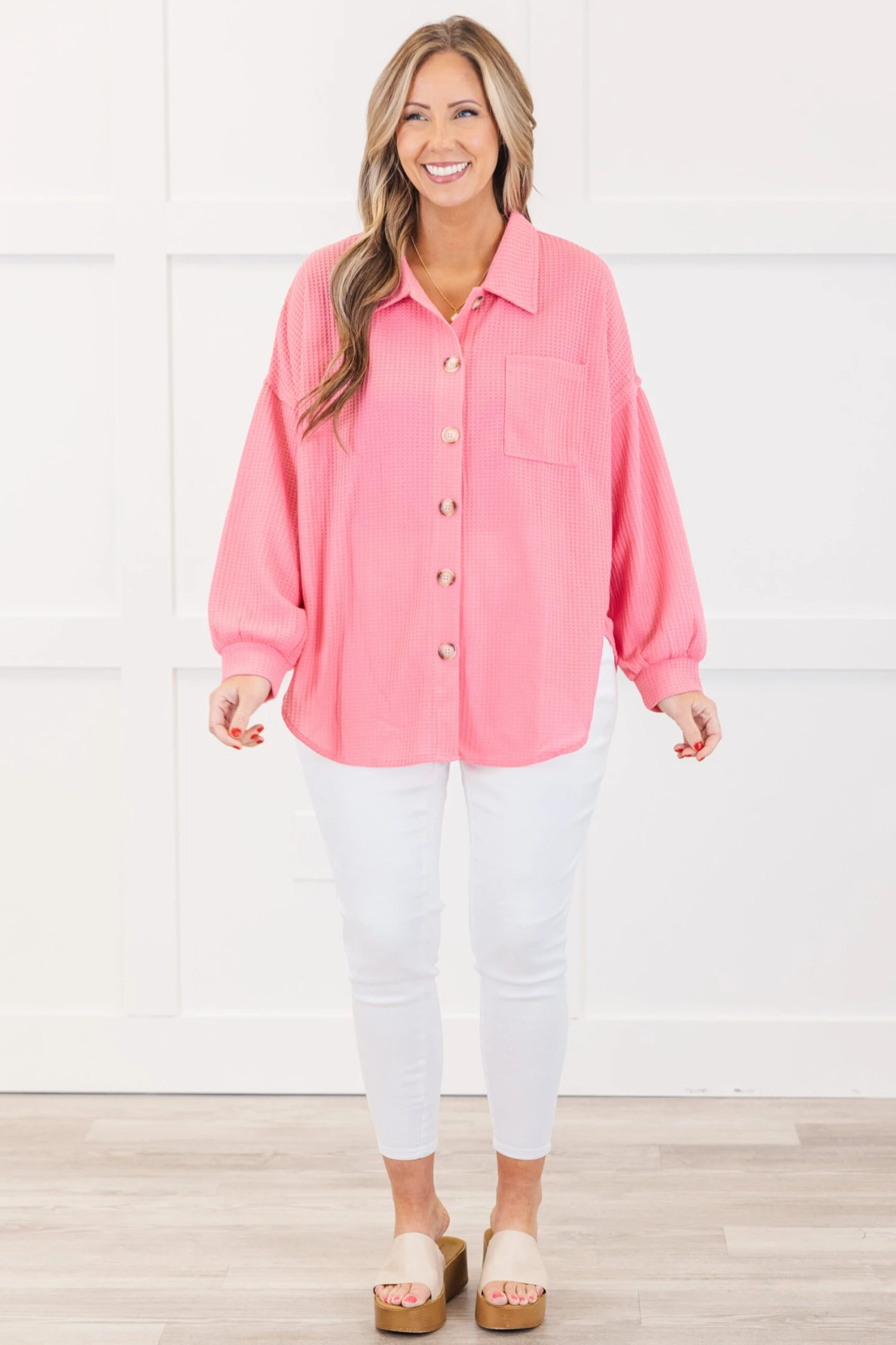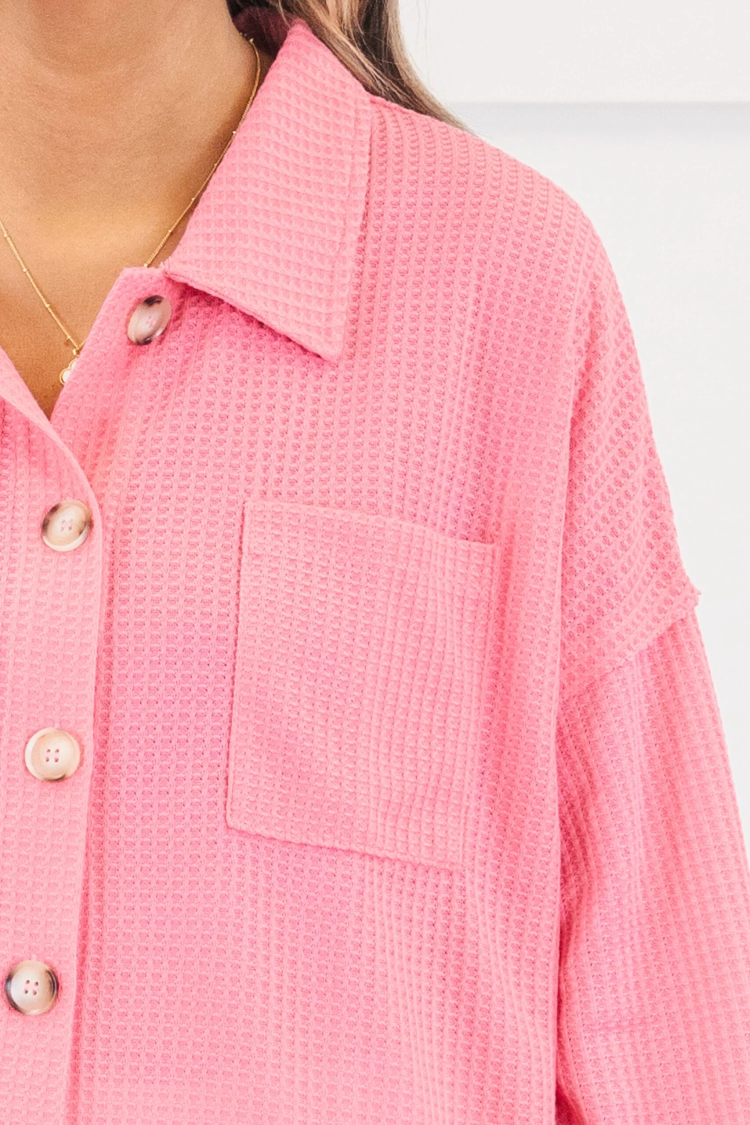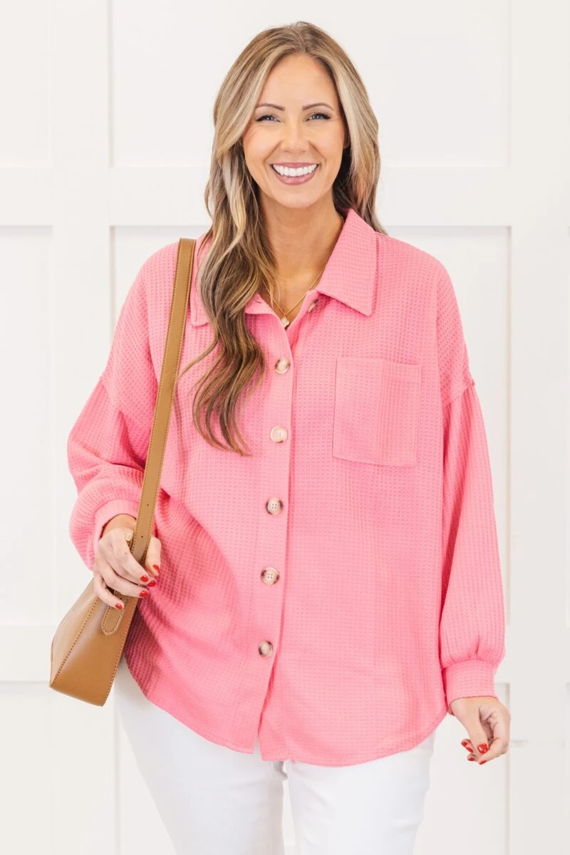 This top in pink is crafted from a soft and cozy waffle knit fabric that will keep you comfortable all day long! The button down design and collared neckline add a touch of sophistication, while the drop shoulder style offers a relaxed and effortless look! Perfect for a casual day out or a cozy night in!