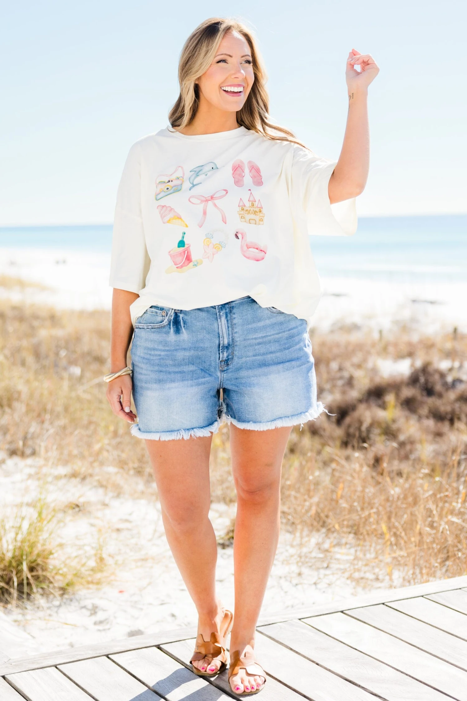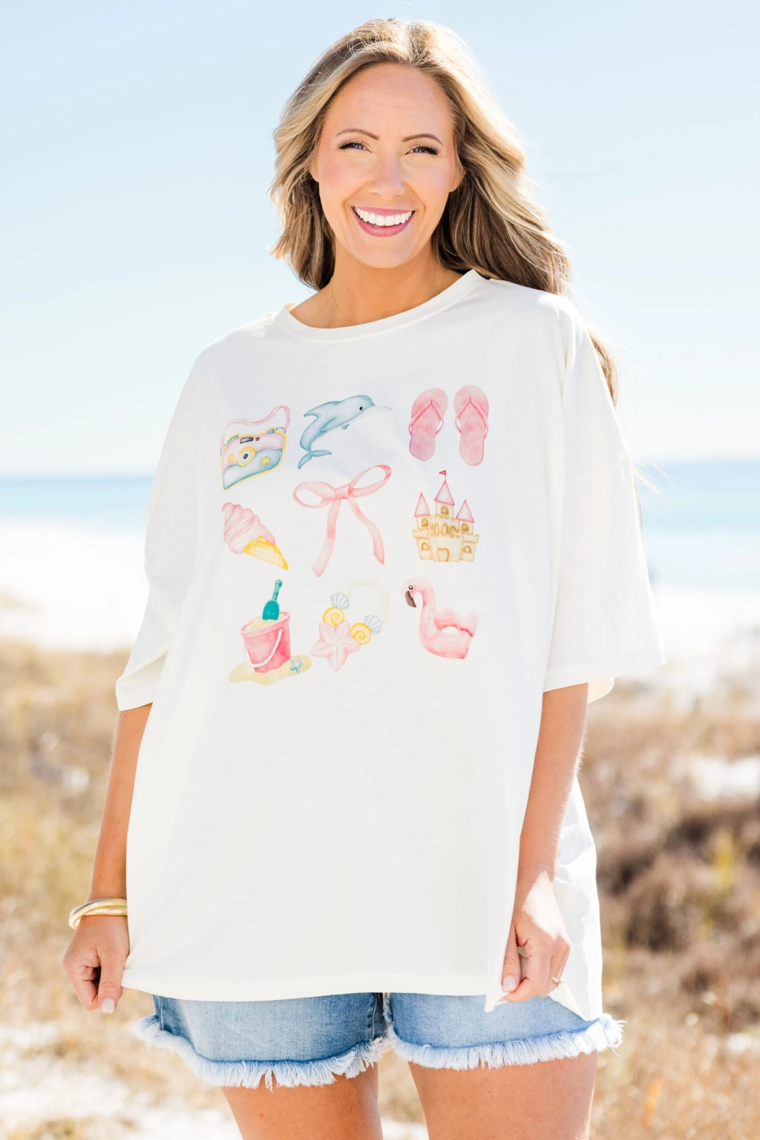 Get ready for some fun in the sun with our Beach Day Boyfriend Tee! This oversized tee is perfect for a laid-back look and features a playful graphic of summertime essentials! So grab your shades, flip flops, and sunscreen and hit the beach in style!