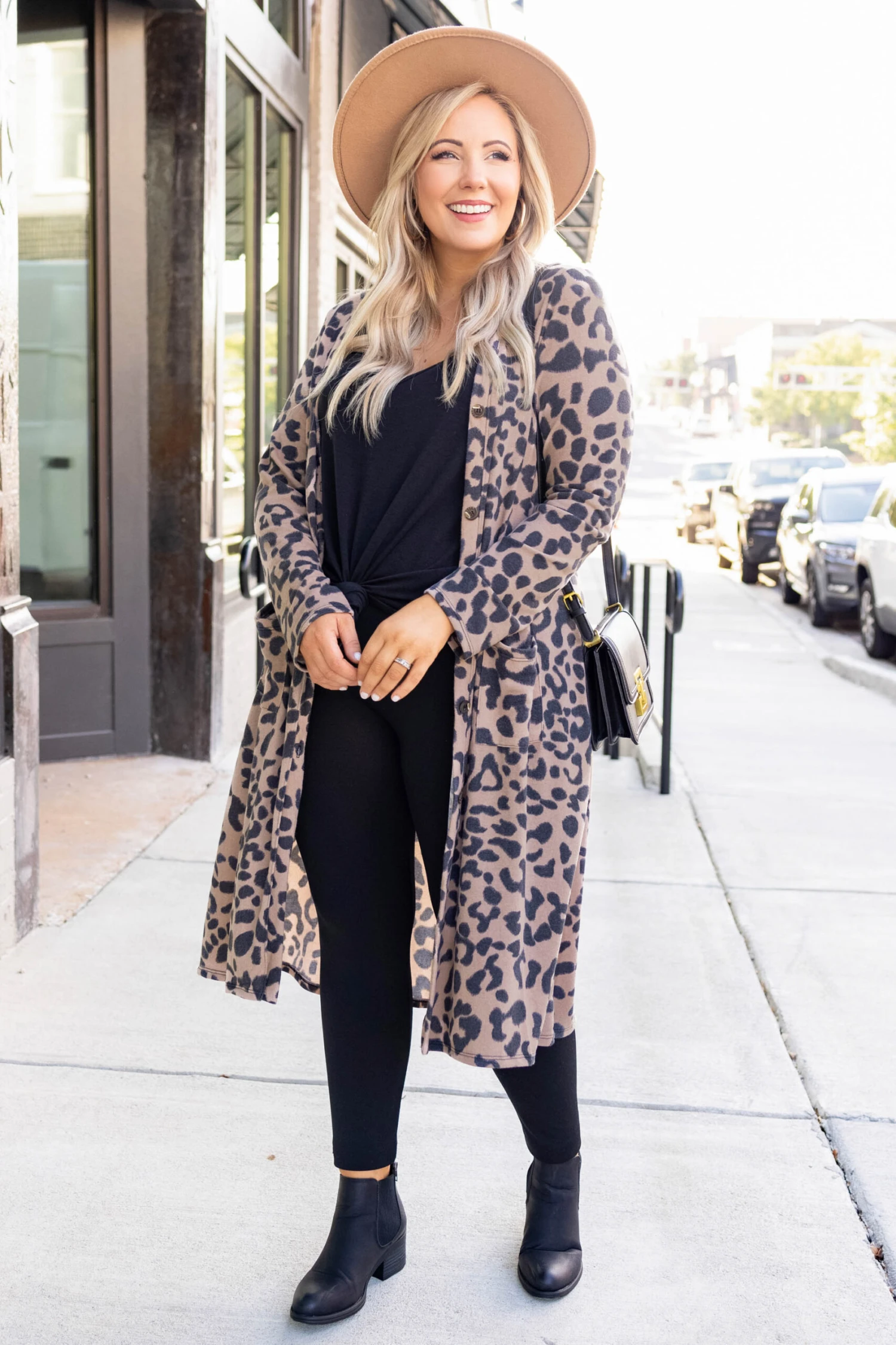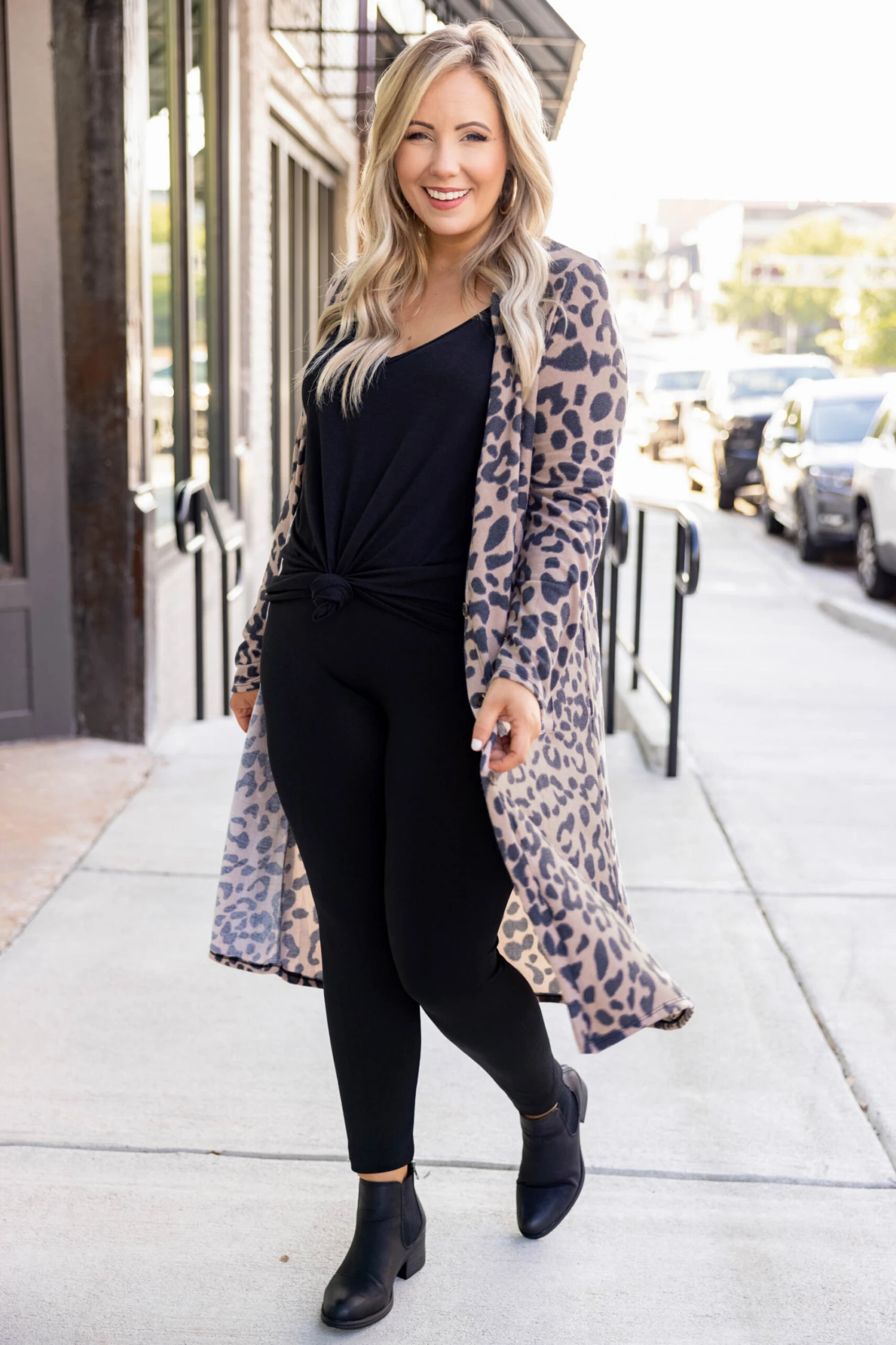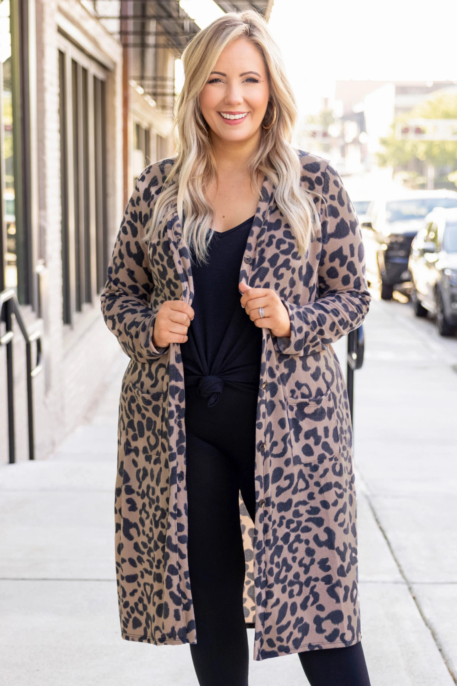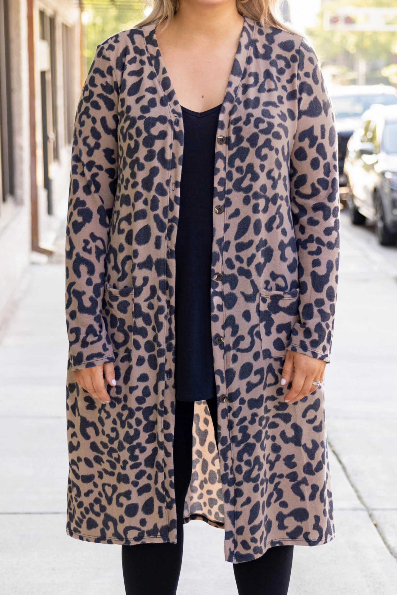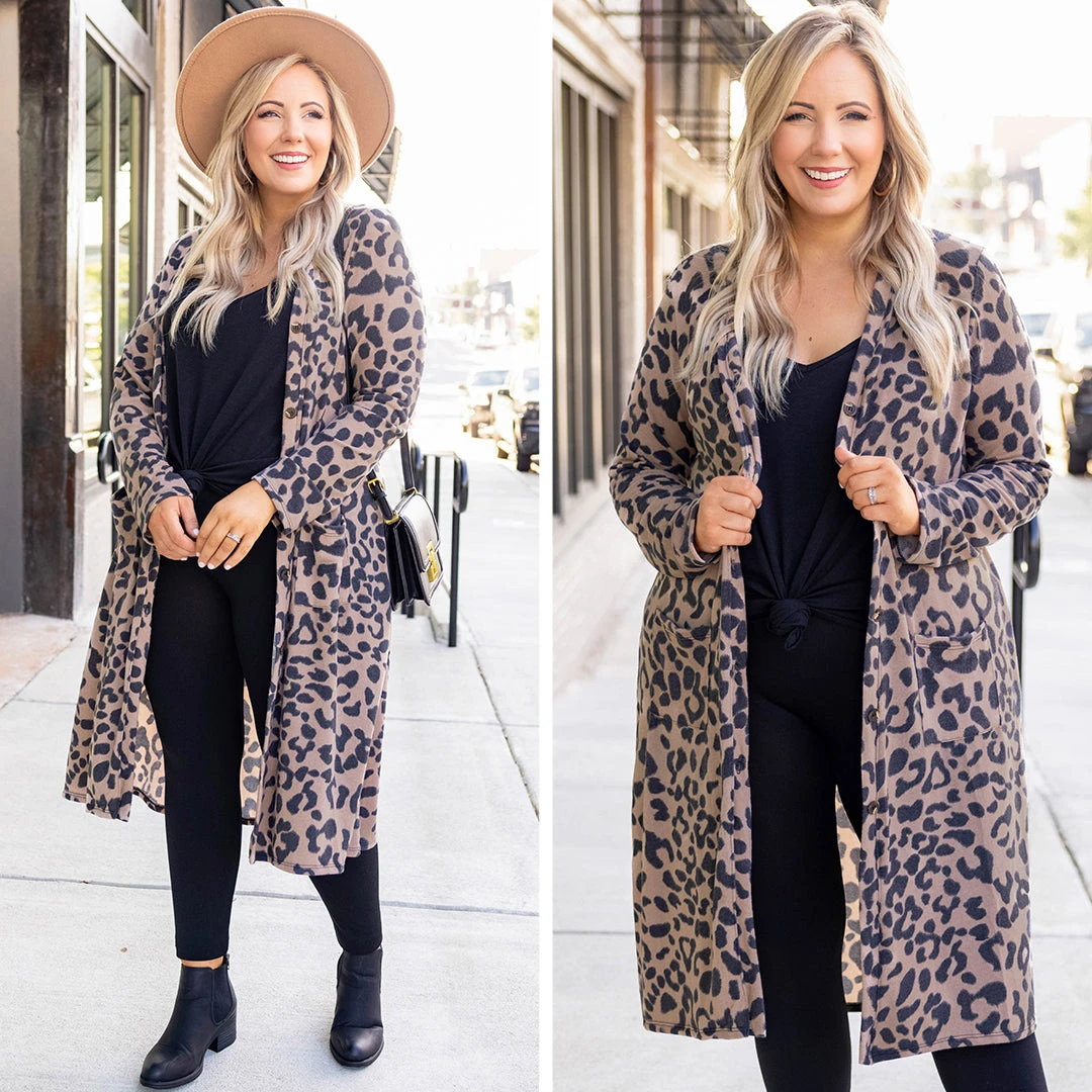 This cardigan is so beautiful! Leopard is so on trend this season and we can’t get enough! This cardigan is easy to dress up or down and is perfect for any occasion! We love the loose and flowy feel, and did we mention it has pockets and buttons?! Pair this cardigan with a cute lace cami and jeans for an easy everyday look!Â