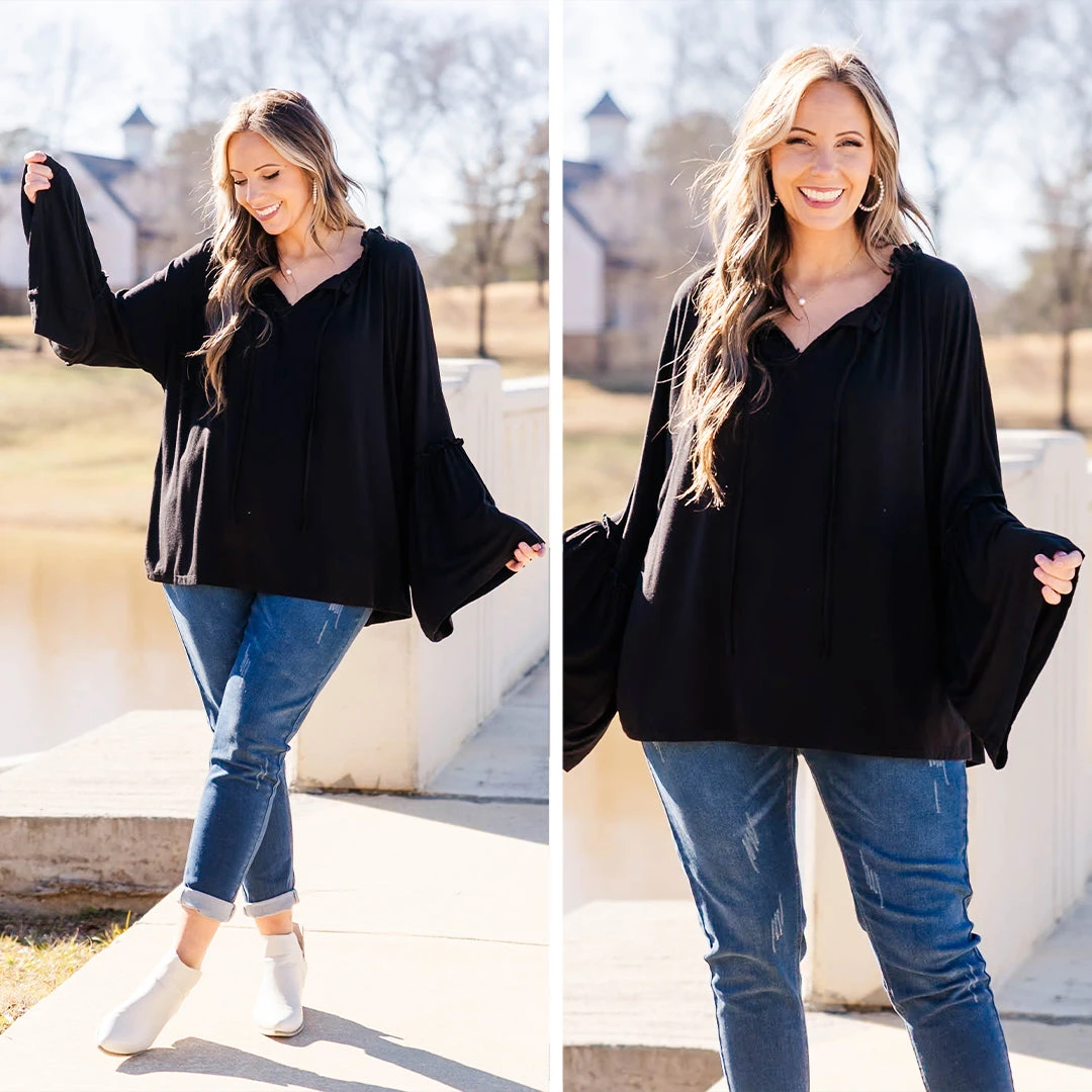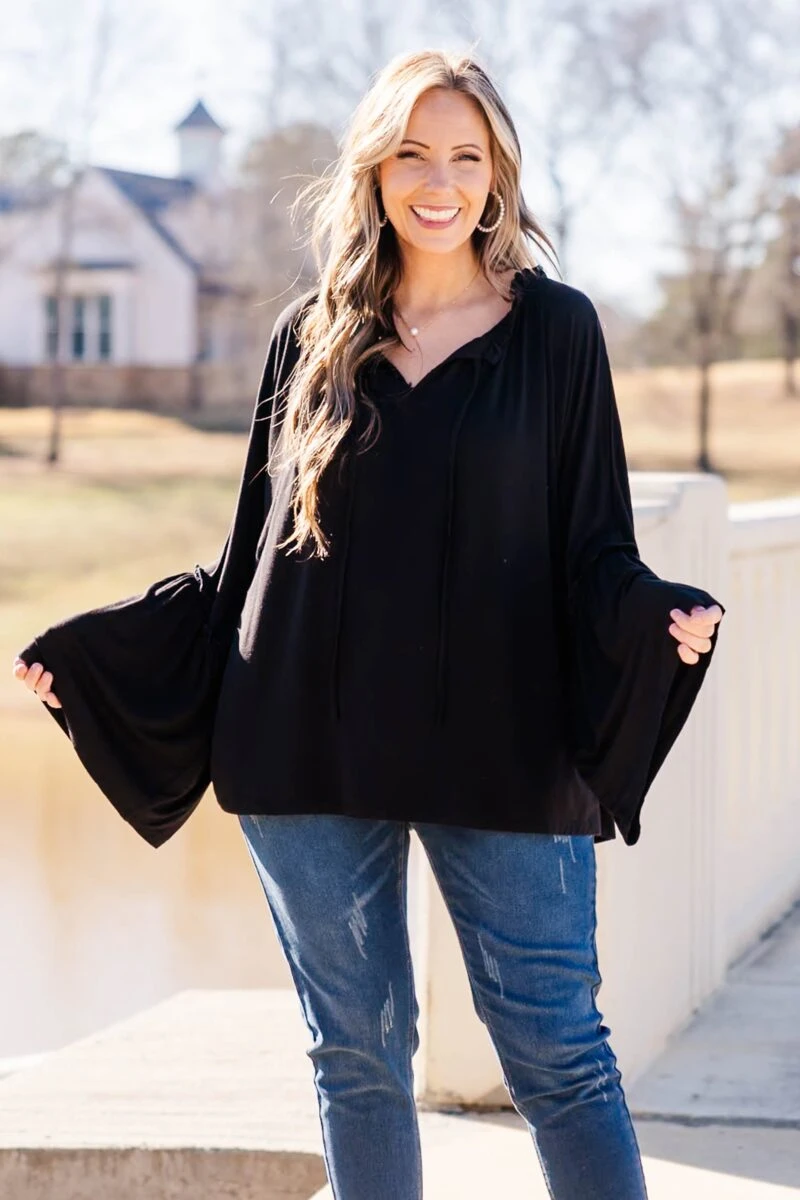 Introduce a sassy vibe to your wardrobe with our Bell of the Night Top! The flowy fit and ruffled neckline create a romantic silhouette, while the classic black color adds versatility to any outfit! The bell sleeves add a touch of drama to this must-have piece!